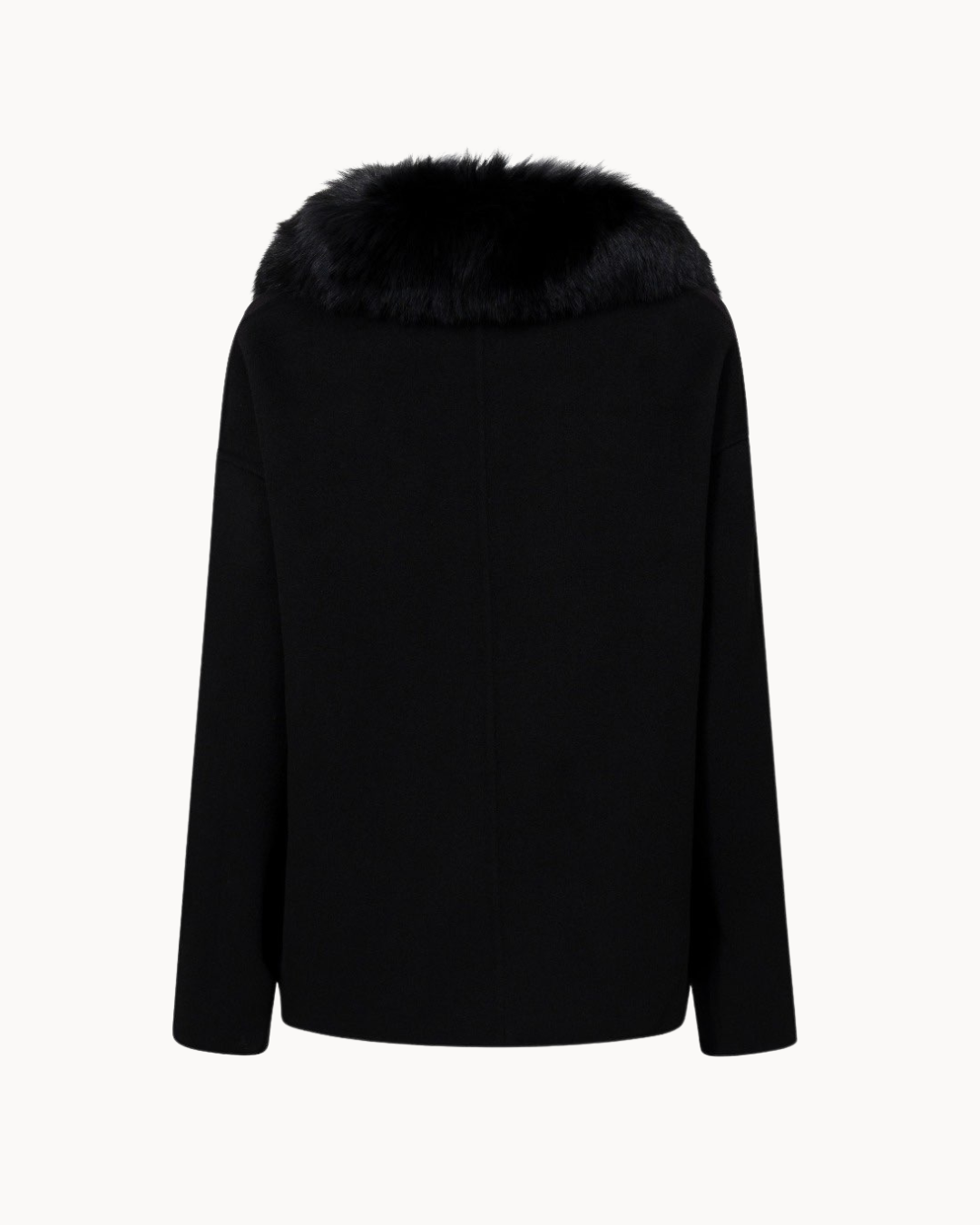 Mit einem zweireihigen Verschluss strahlt der Mantel einen zeitlosen und klassischen Stil aus, während der abnehmbare Kragen aus echtem Fuchspelz eine exklusive und luxuriöse Note verleiht. Die diskreten, glatten Taschen verstärken den minimalistischen und raffinierten Look und bieten gleichzeitig praktische Funktionalität.