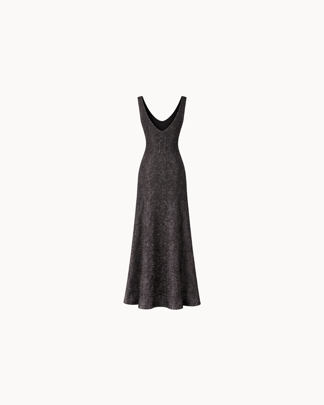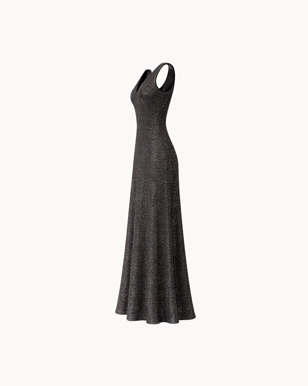 The Luna, but darker. The same V-neck maxi silhouette, now in a deep black knit woven with silver lurex that catches the light with every move. Understated glamour at its most powerful — this is your evening dress.