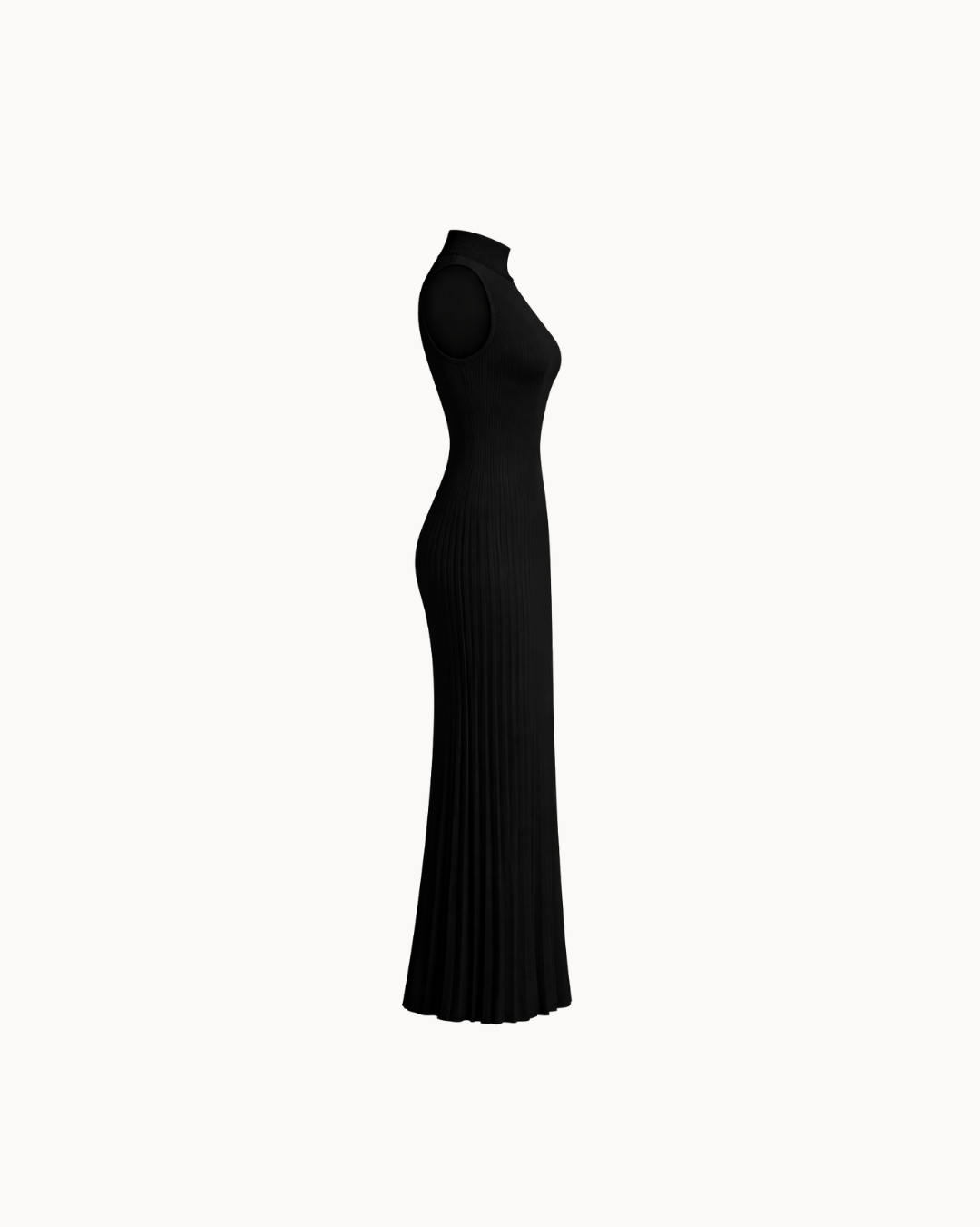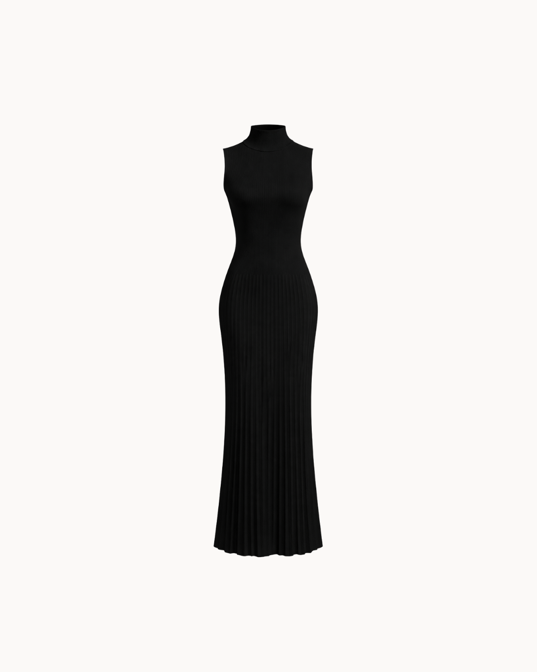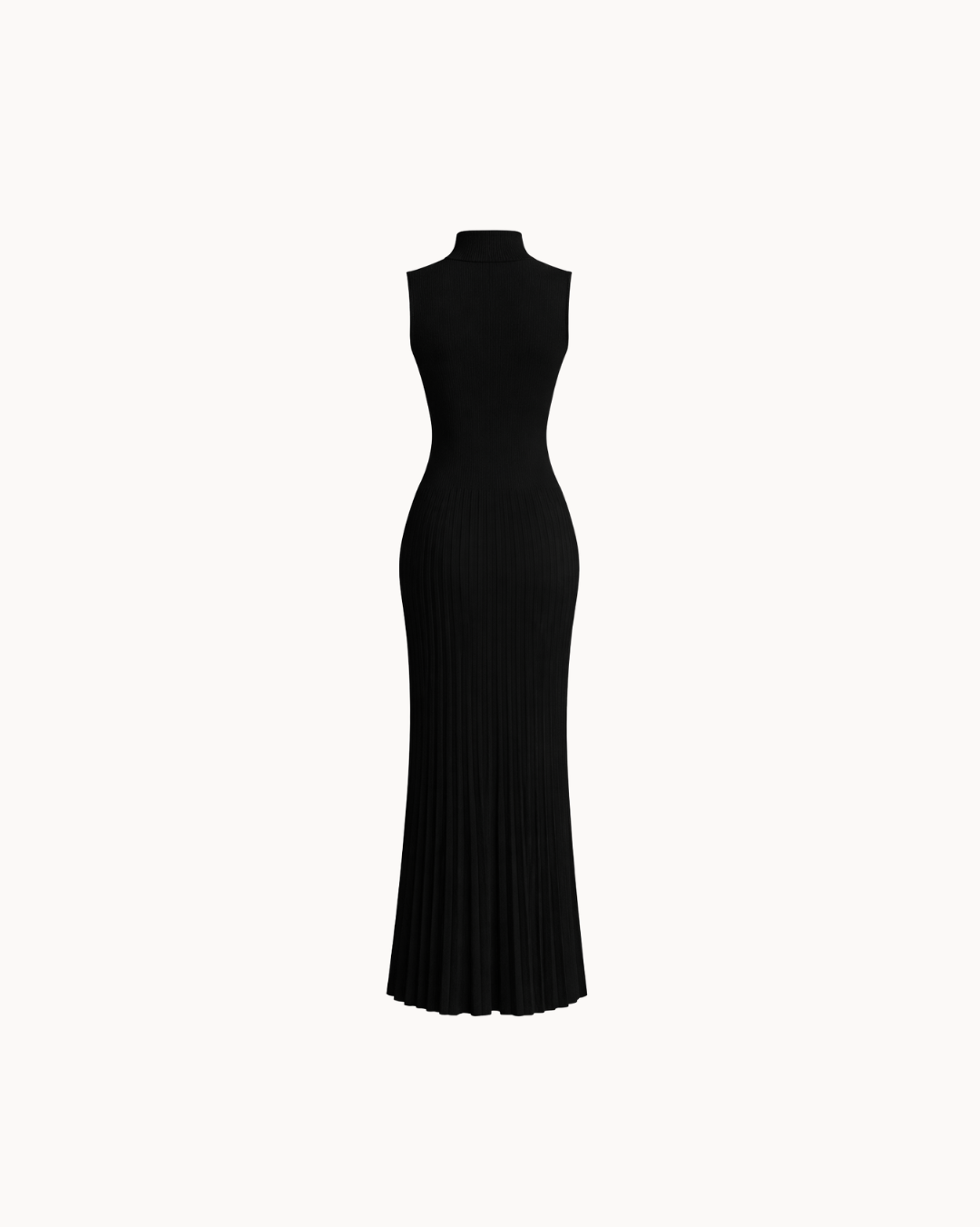 The Serena in black is the definition of understated power. The same sleeveless turtleneck silhouette with a smooth ribbed bodice flowing into a beautifully pleated skirt — in a classic black that works for every occasion, every season.