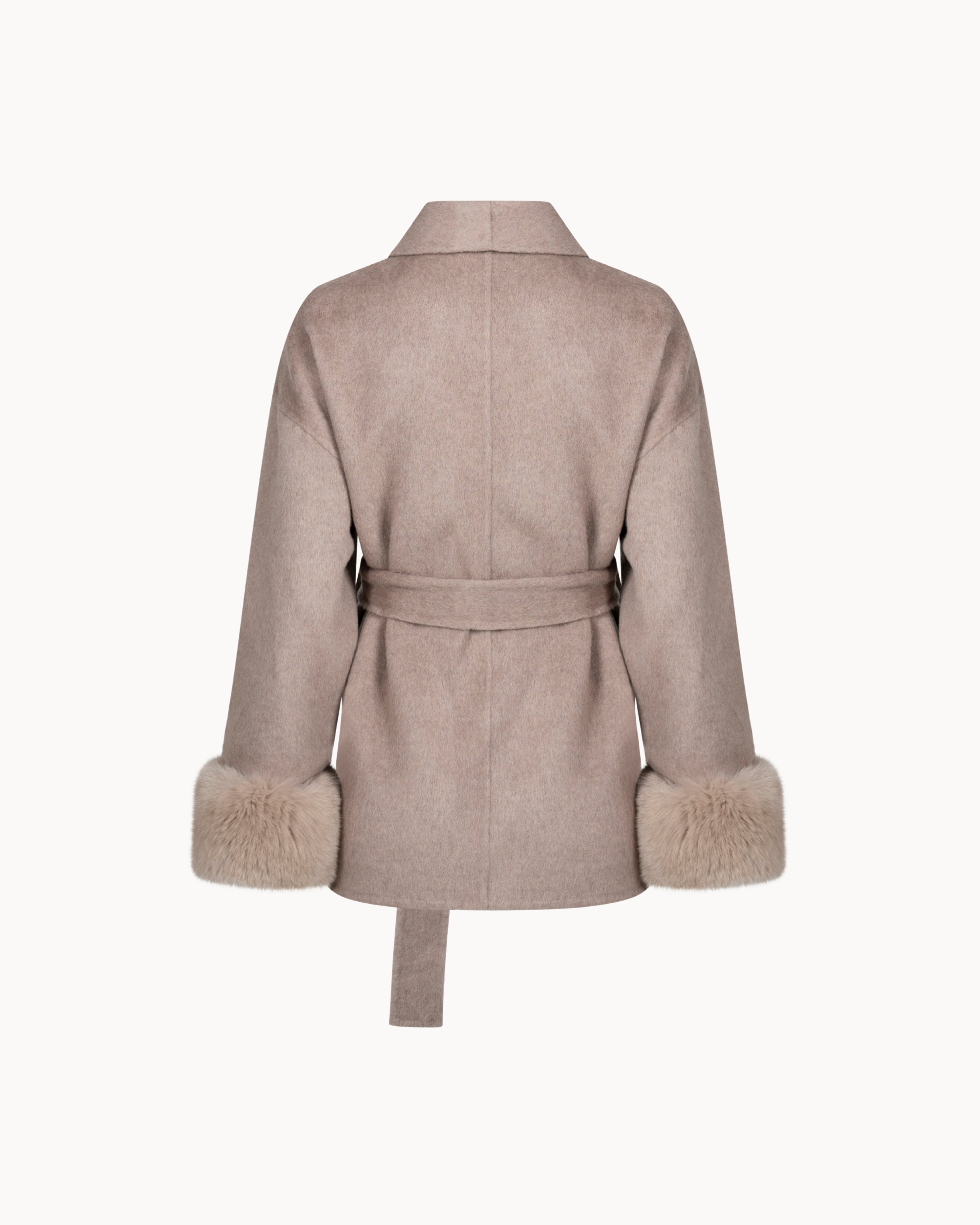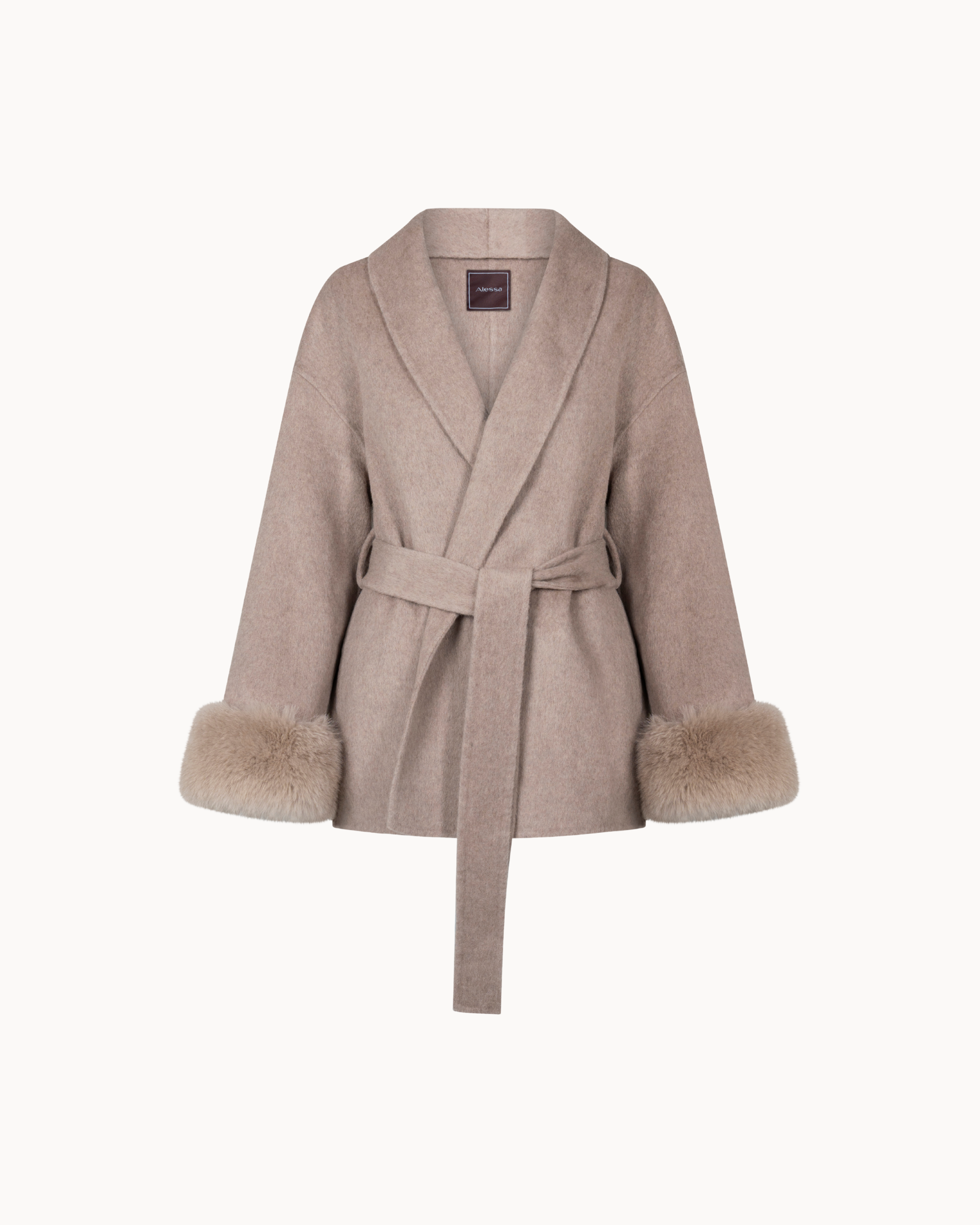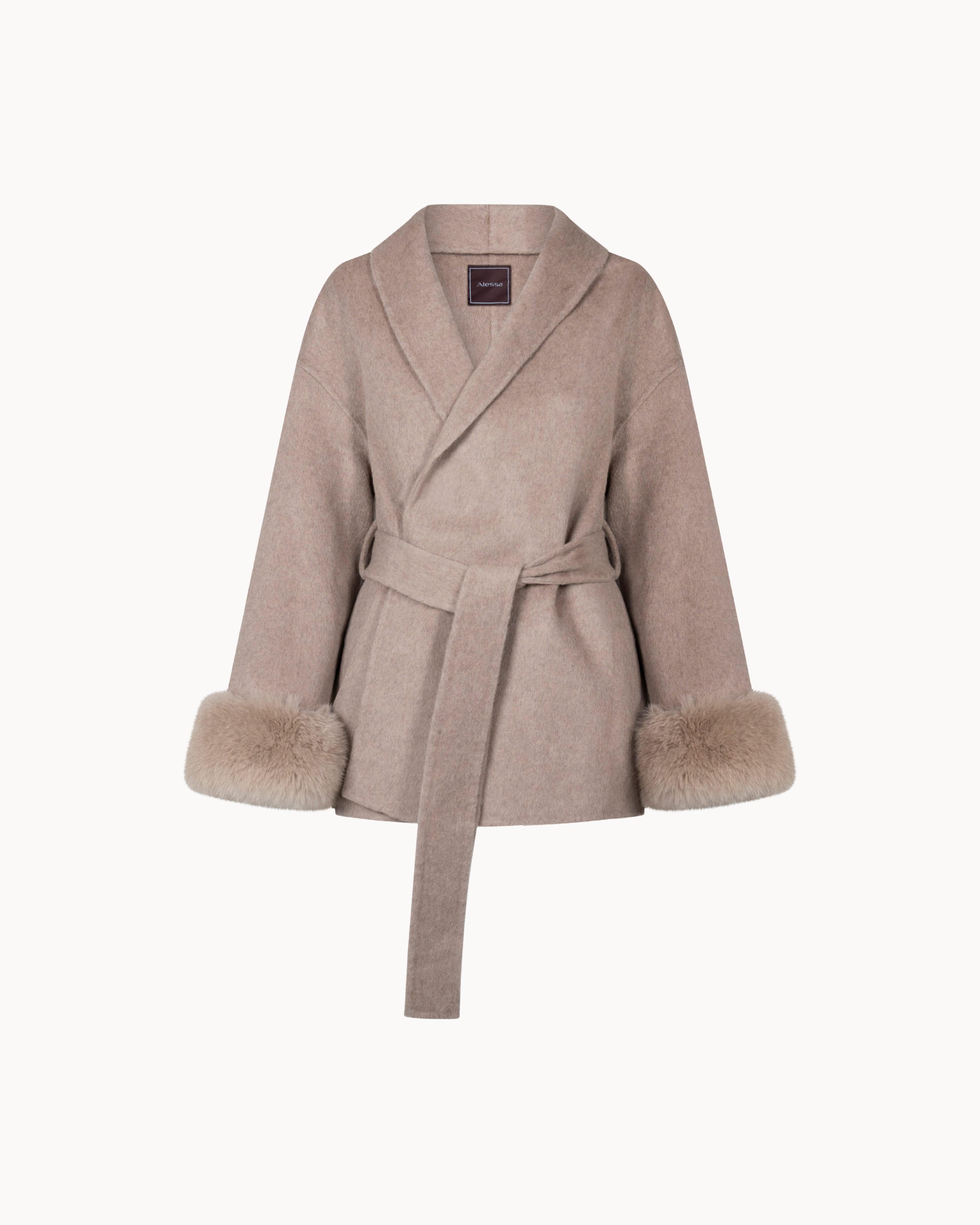 Handcrafted Elegance a refined statement piece designed for unmatched warmth and natural elegance. This exquisite short wrap coat features a soft, plush fux fur trim on the cuffs, offering a smooth and luxurious feel. Effortlessly sophisticated, its clean lines and soft taupe hue are designed to elevate any look with timeless style.
