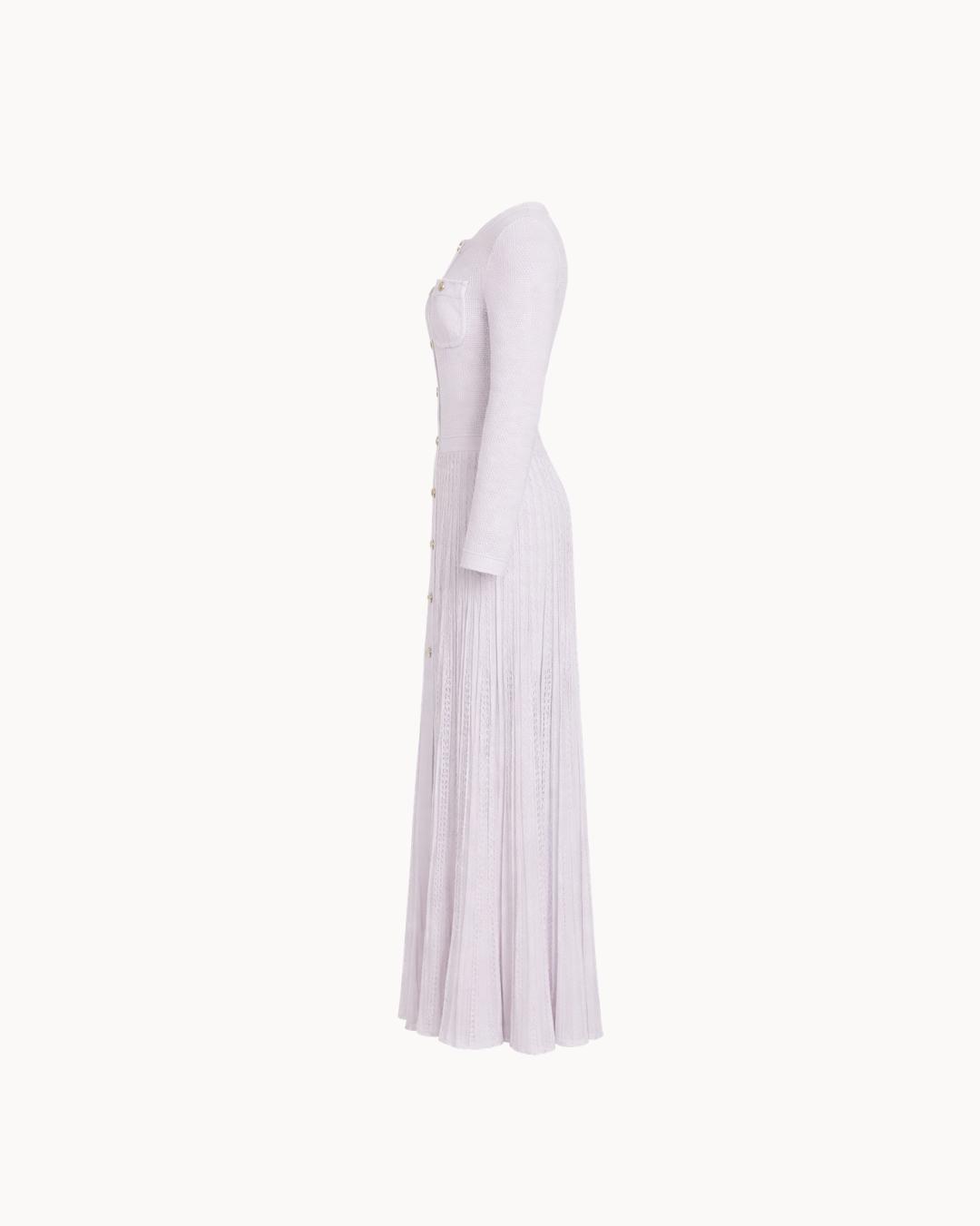 Meet your new favourite dress. The Simone combines a fitted ribbed bodice with a flowing pleated skirt, finished with gold buttons and chest pockets for a timeless, polished look. A piece that takes you effortlessly from day to night.