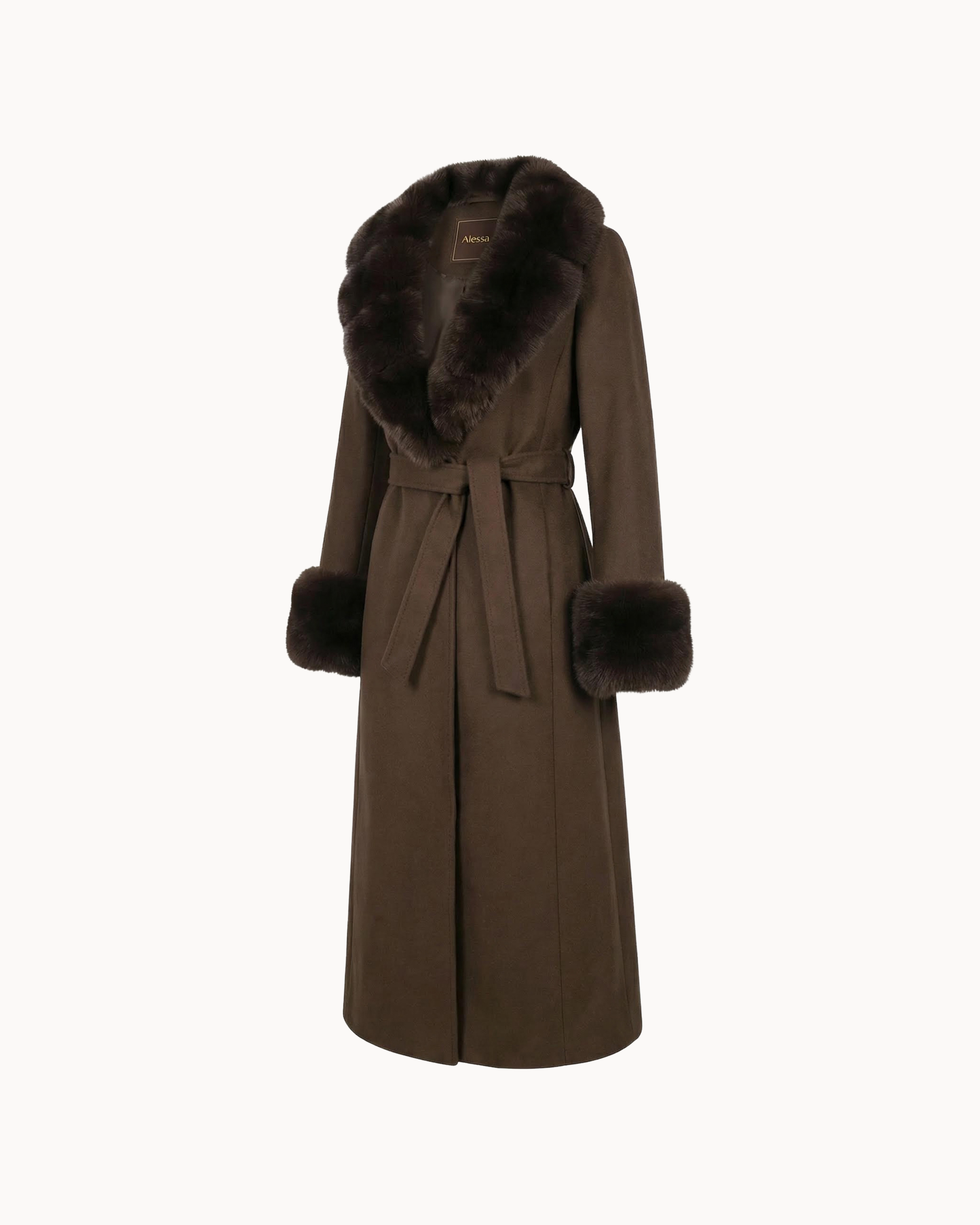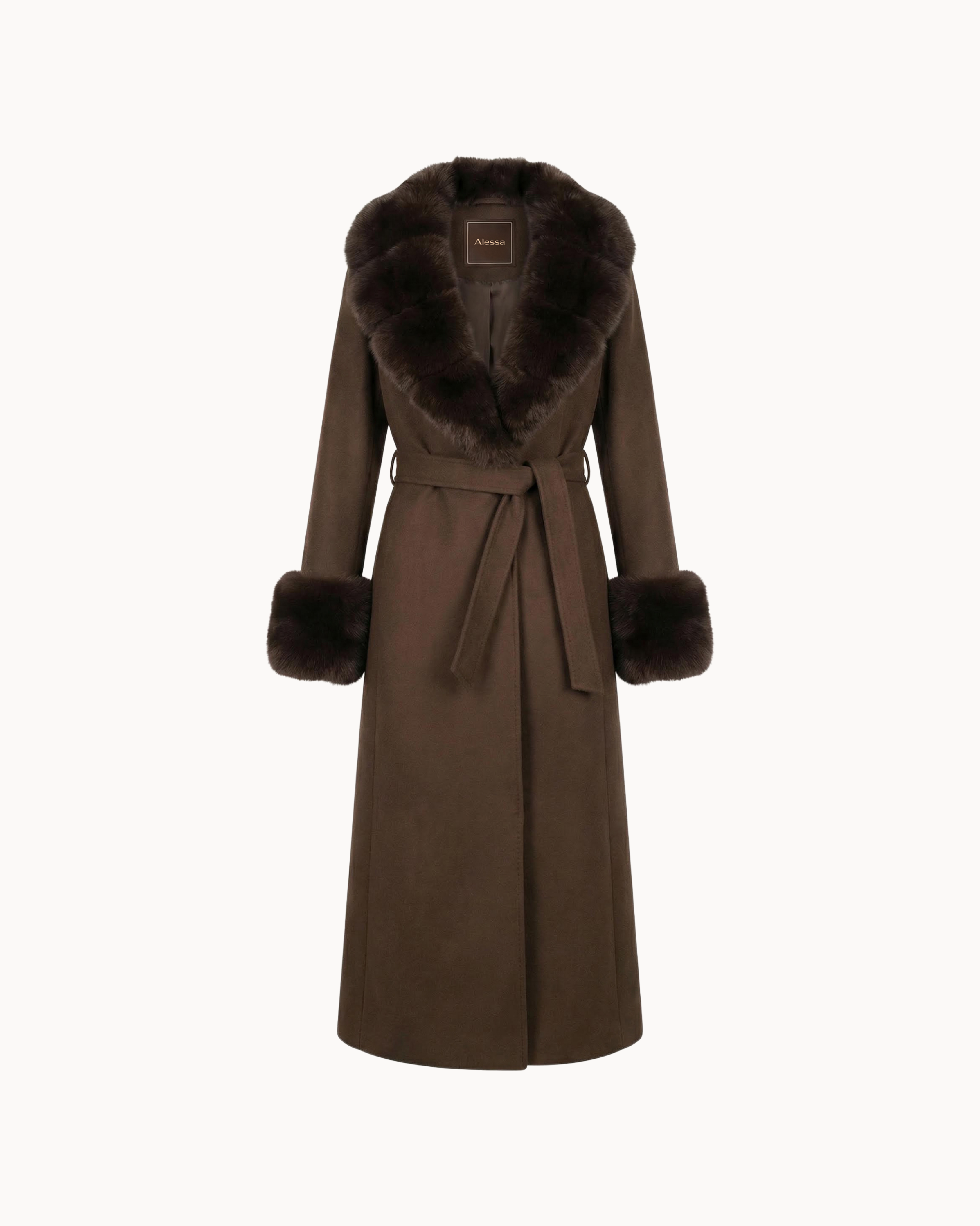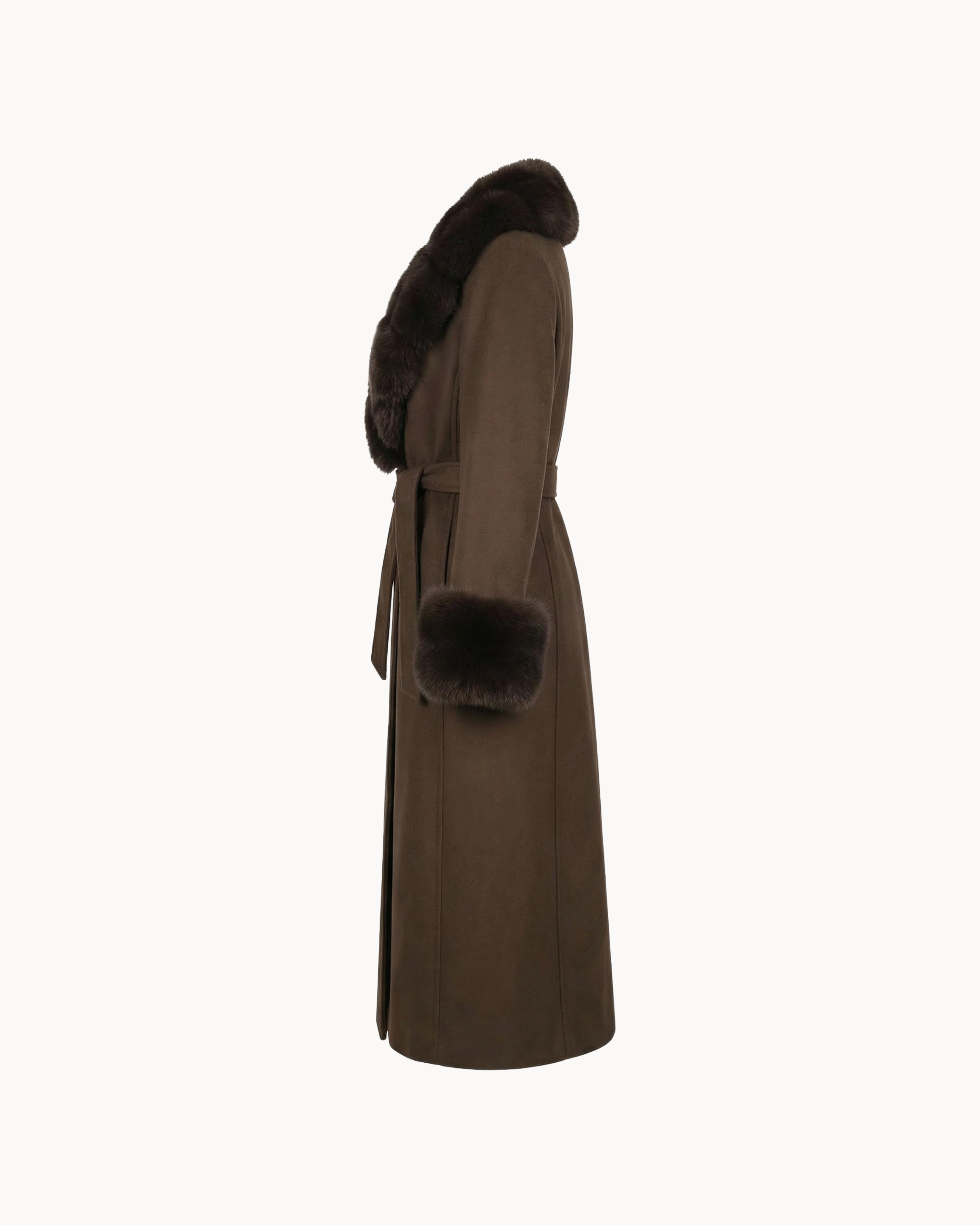 The Tenebra Coat is crafted from structured wool and elevated with plush rex rabbit fur detailing, creating a striking balance between clean tailoring and rich texture. The elongated silhouette is framed by a sculptural fur collar and cuffs, while the belted waist allows for refined definition without excess.