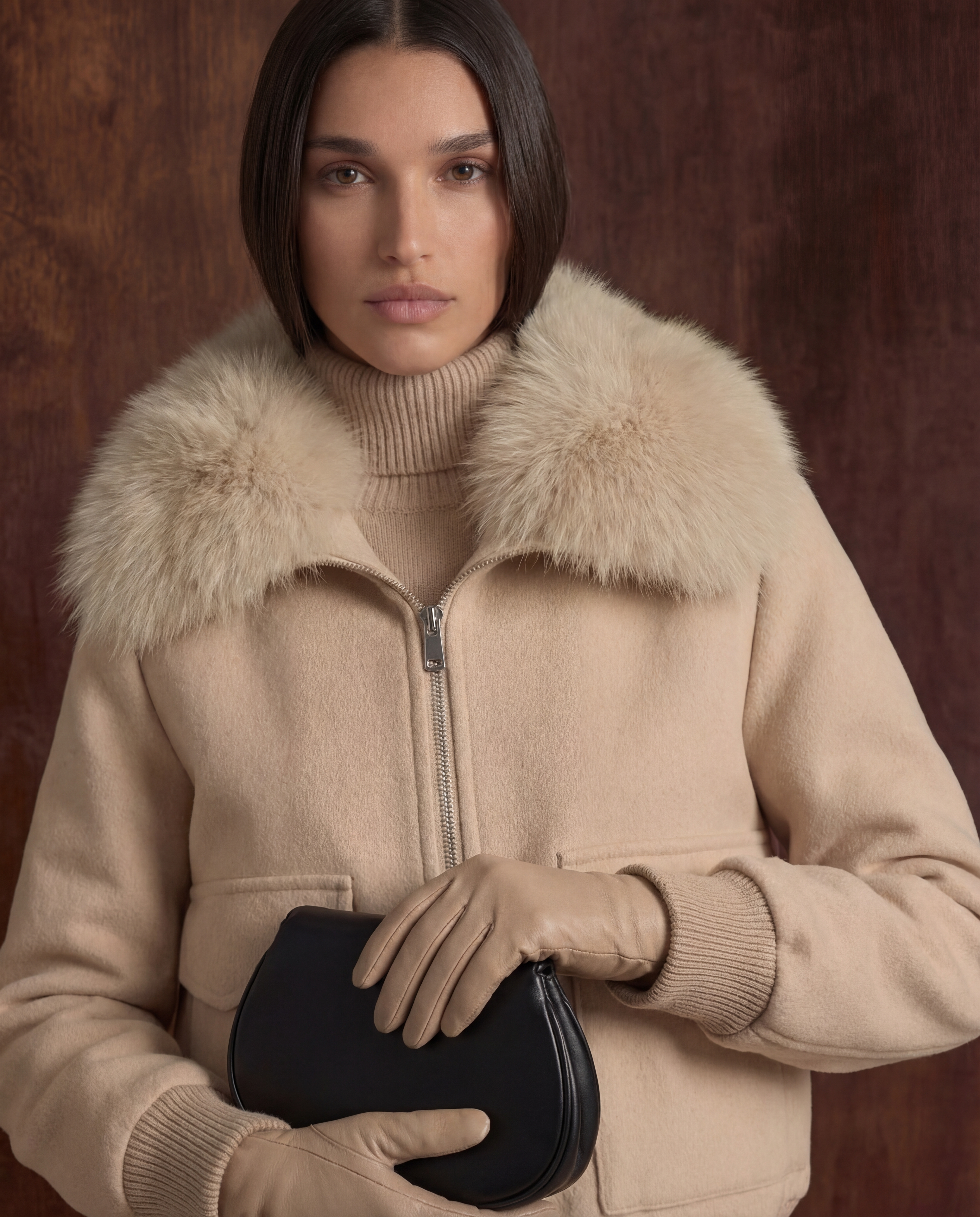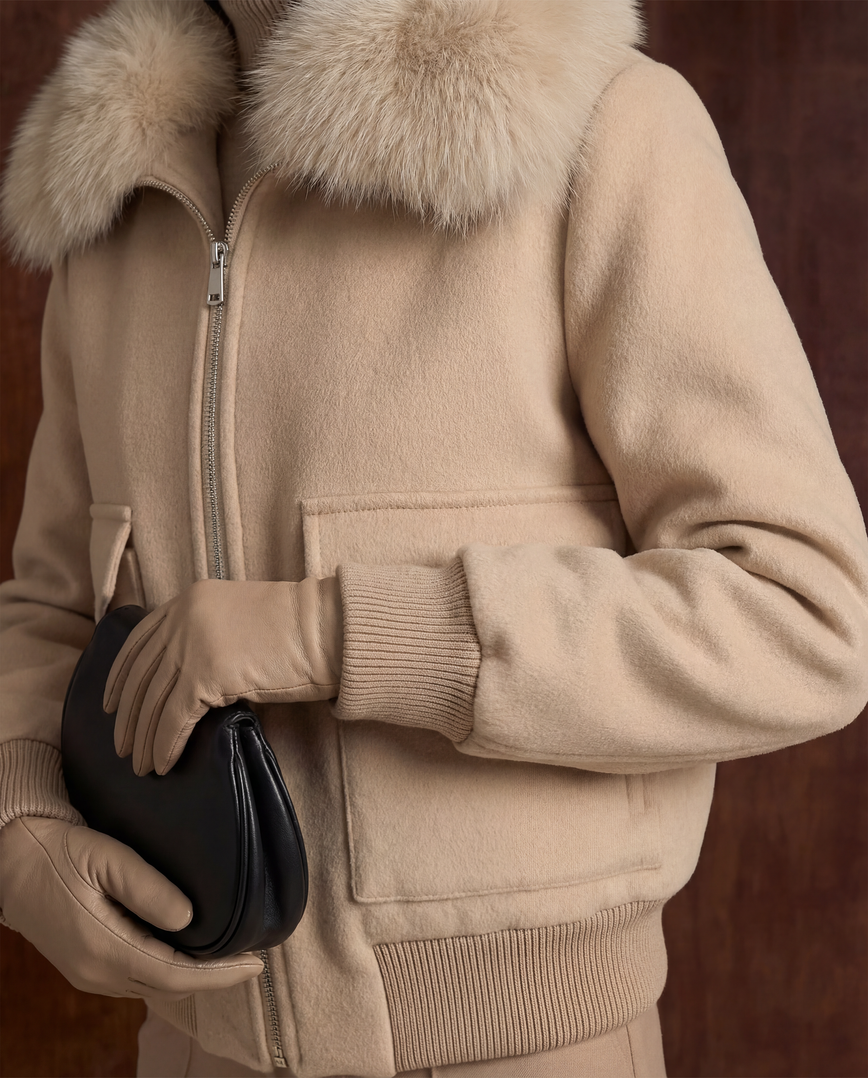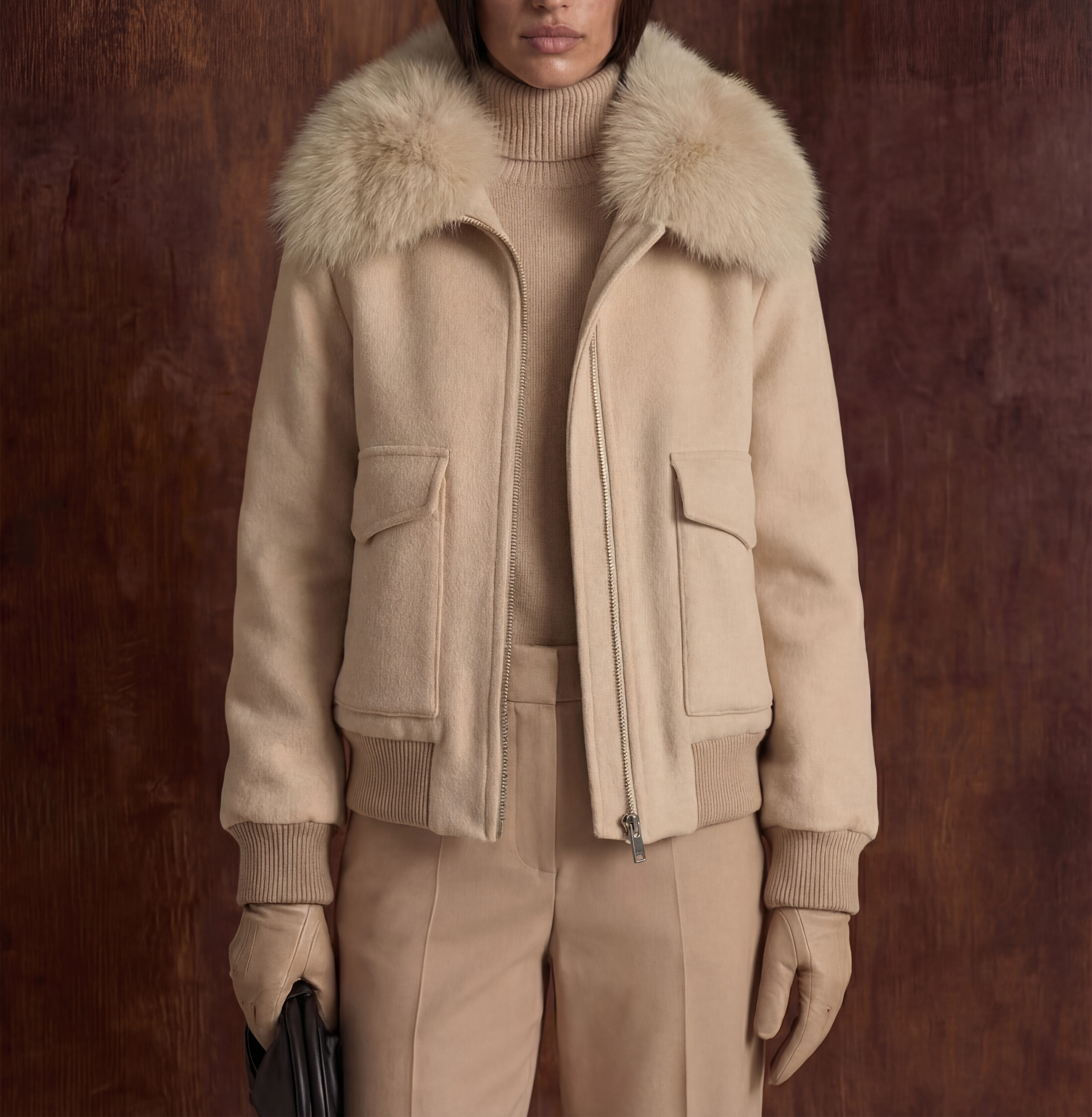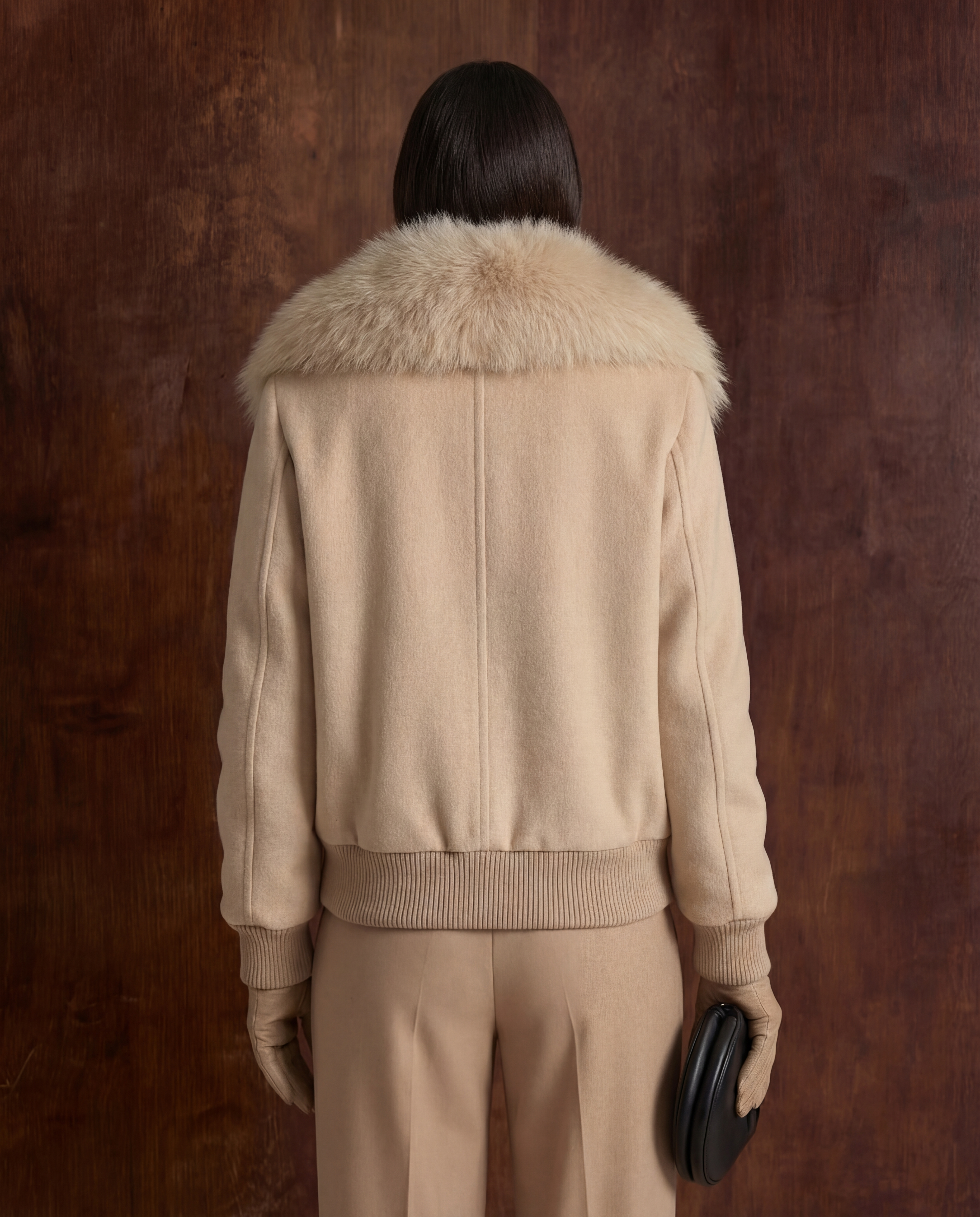 Crafted from silk-lined cashmere wool, this cropped jacket blends different styles and influences. It features two flap patch pockets, ribbed trims, and a contrasting zip closure with a branded pull, giving it a sporty yet utilitarian feel. The removable fox fur collar adds an elegant touch and attaches neatly with a hidden button system. A versatile piece designed to suit any mood and create a distinctly modern look.