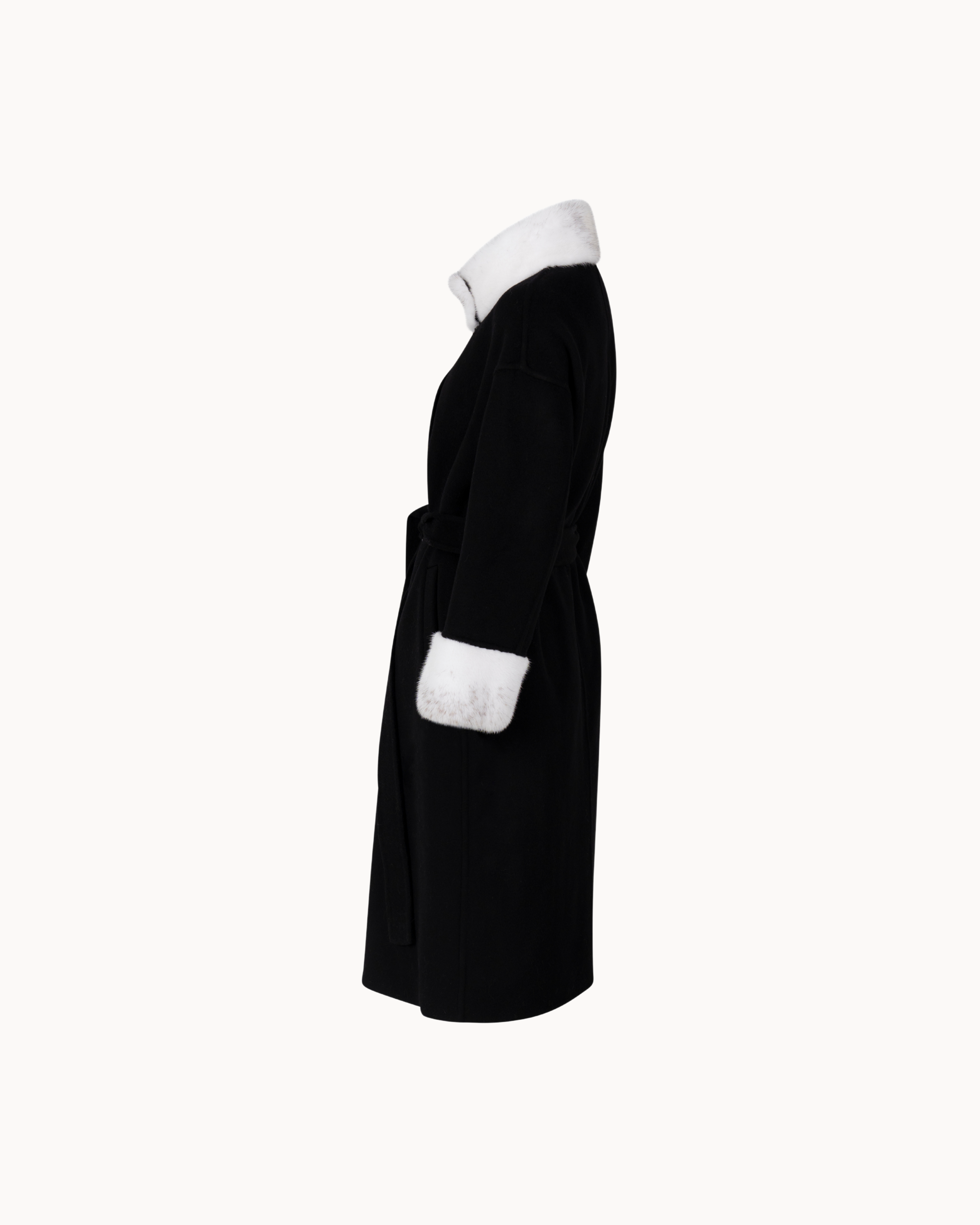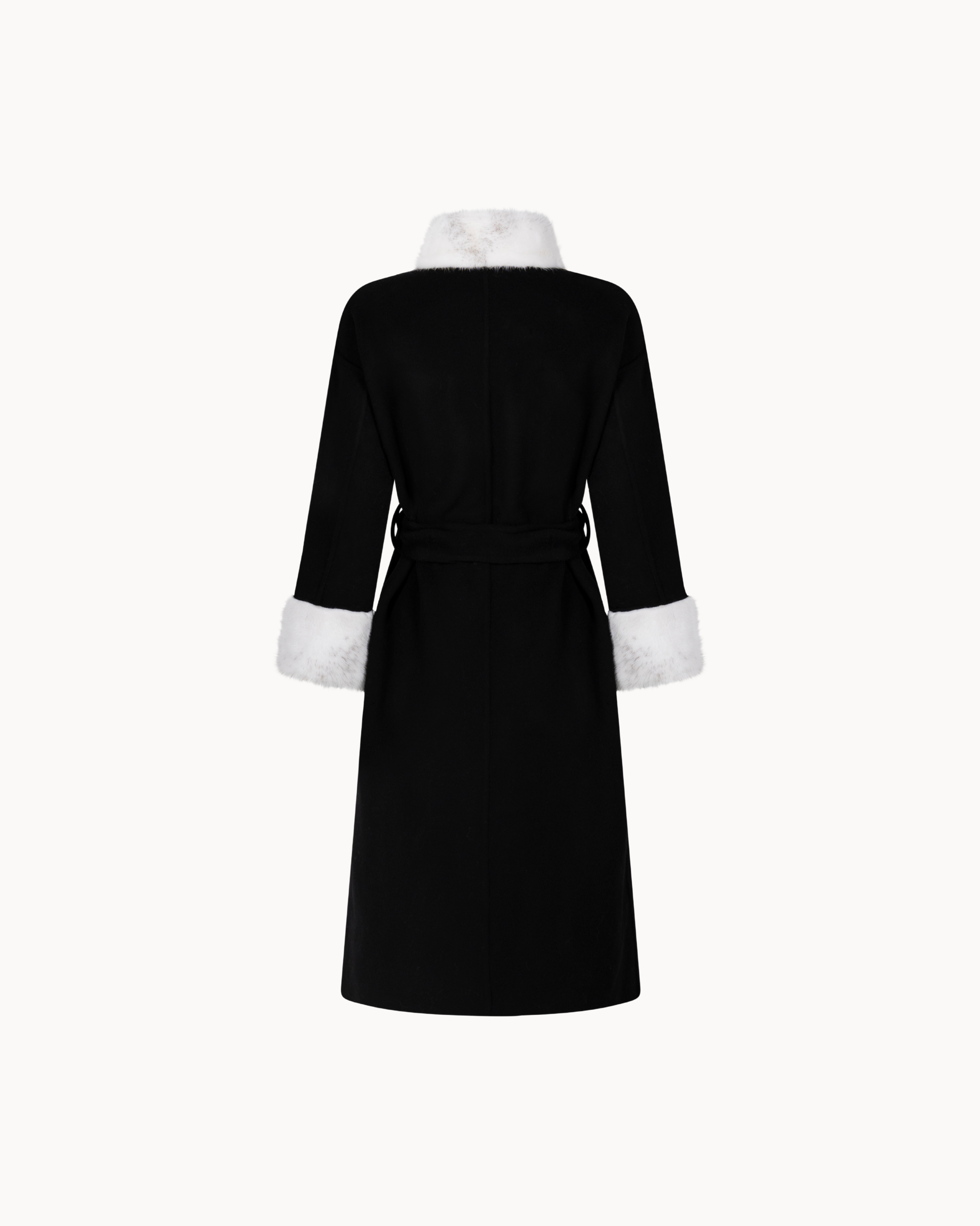 A long, streamlined coat in black with subtle Mink fur detailing at the collar and cuffs. Designed with a straight silhouette and a tie belt for a refined, effortless fit. Ideal for elevated everyday layering.