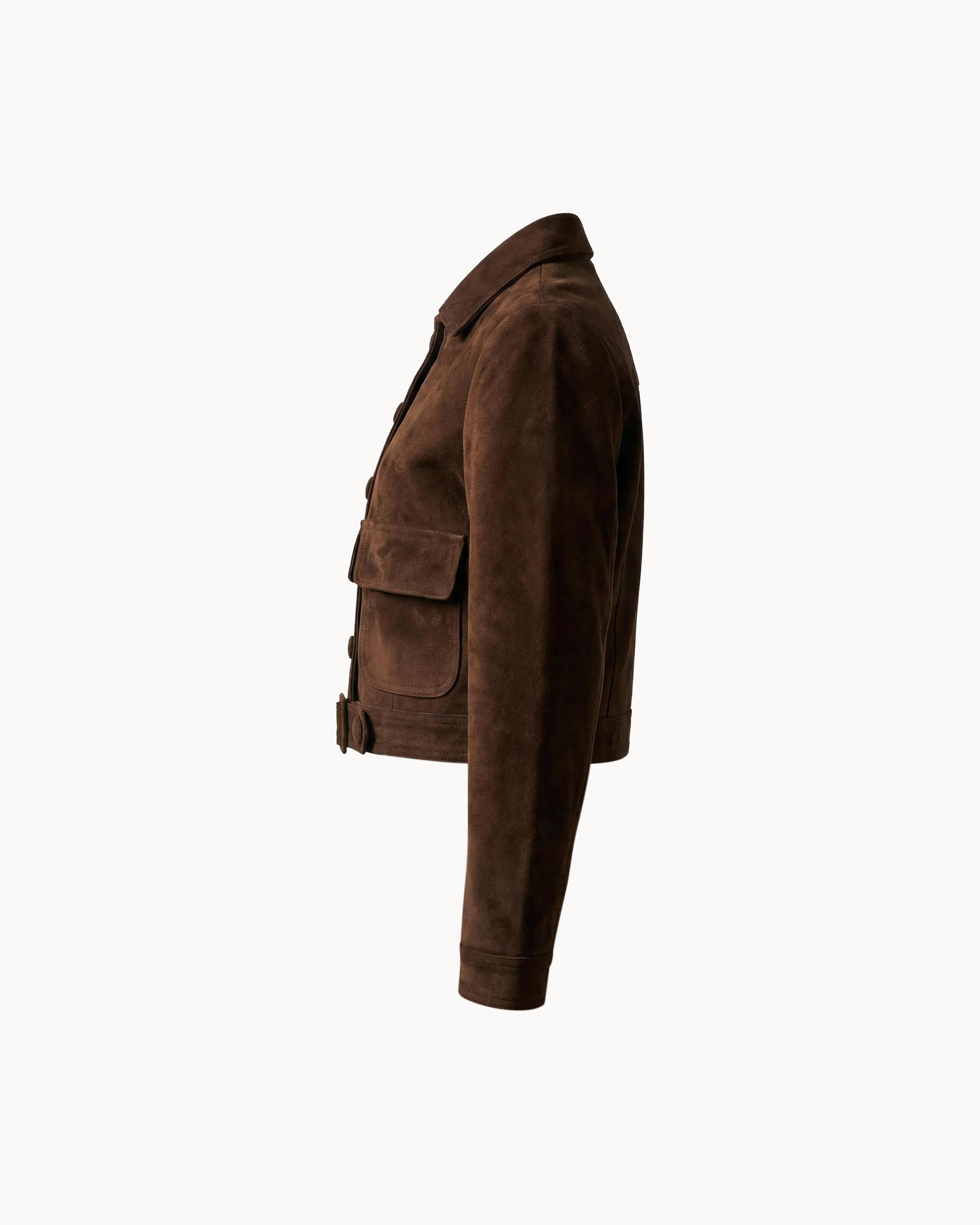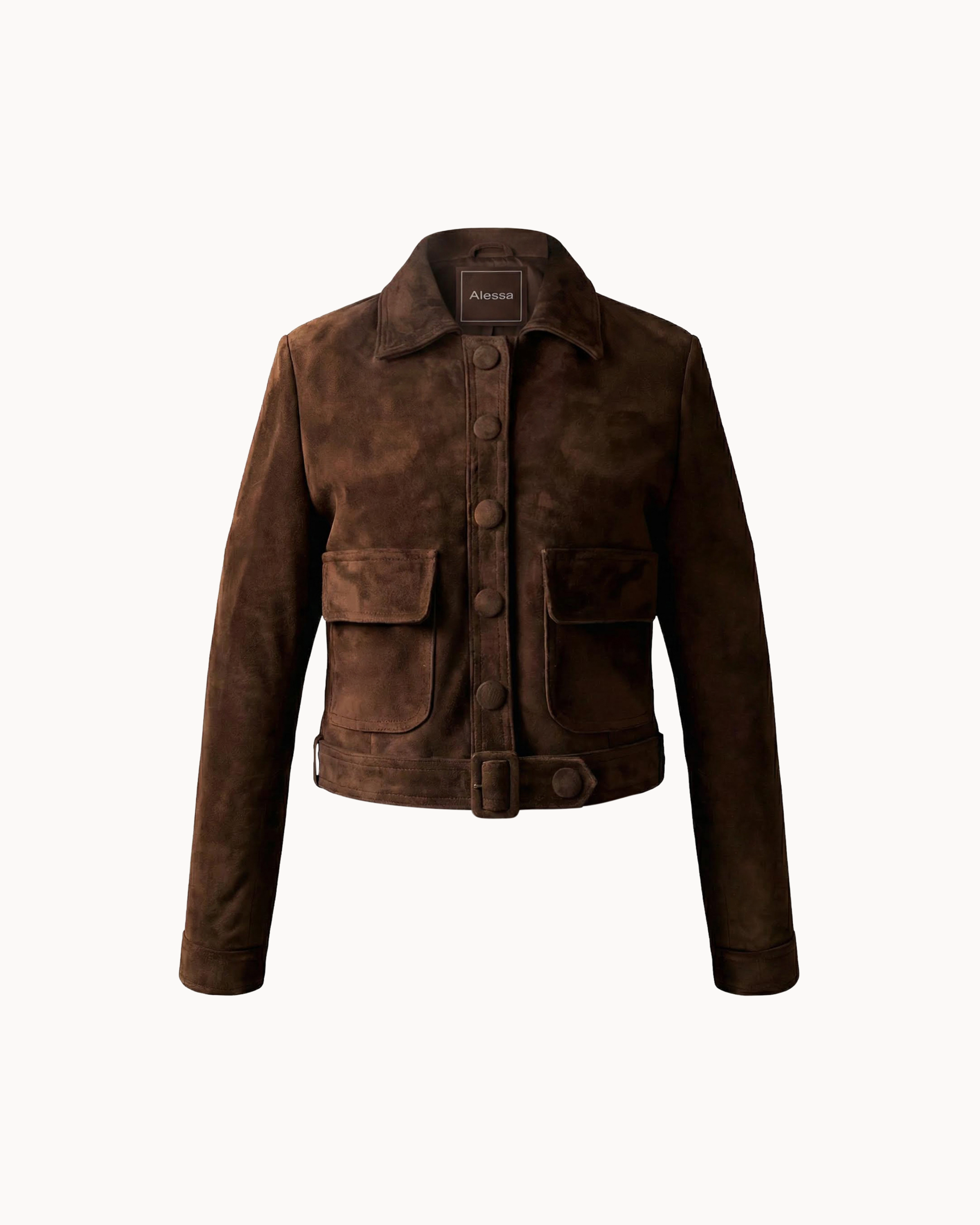 The Alessa Valen Suede Jacket is crafted from premium suede, offering a rich, velvety finish that softens beautifully over time. The structured silhouette is balanced by functional details, including patch pockets and an adjustable hem belt, lending a subtle utilitarian edge to an otherwise refined design.