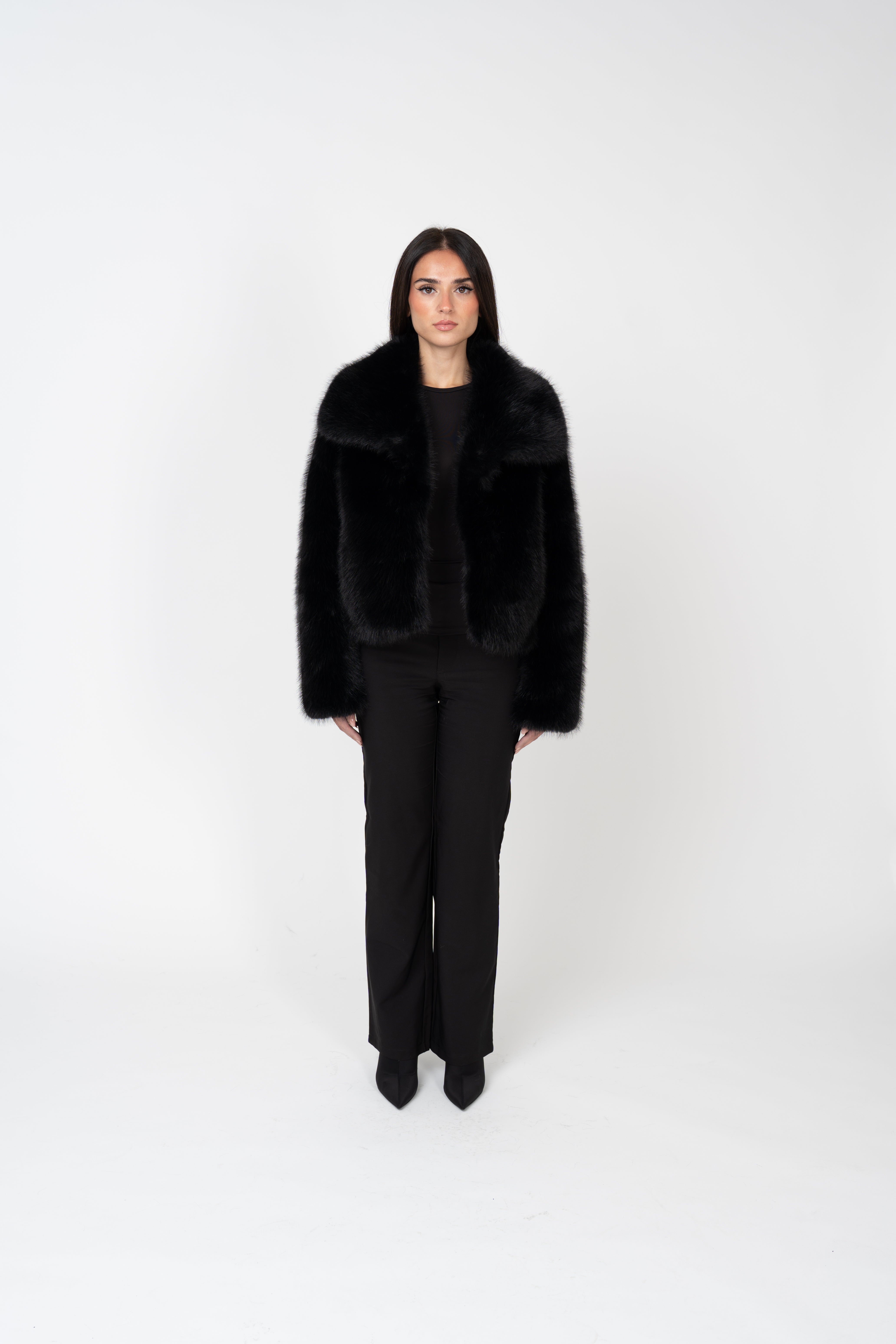 Stay warm and stylish with the Ophelia Faux Fur Jacket. Made from soft, high-quality faux fur, it feels cozy while looking elegant. The classic black design makes it perfect for both everyday wear and special occasions.