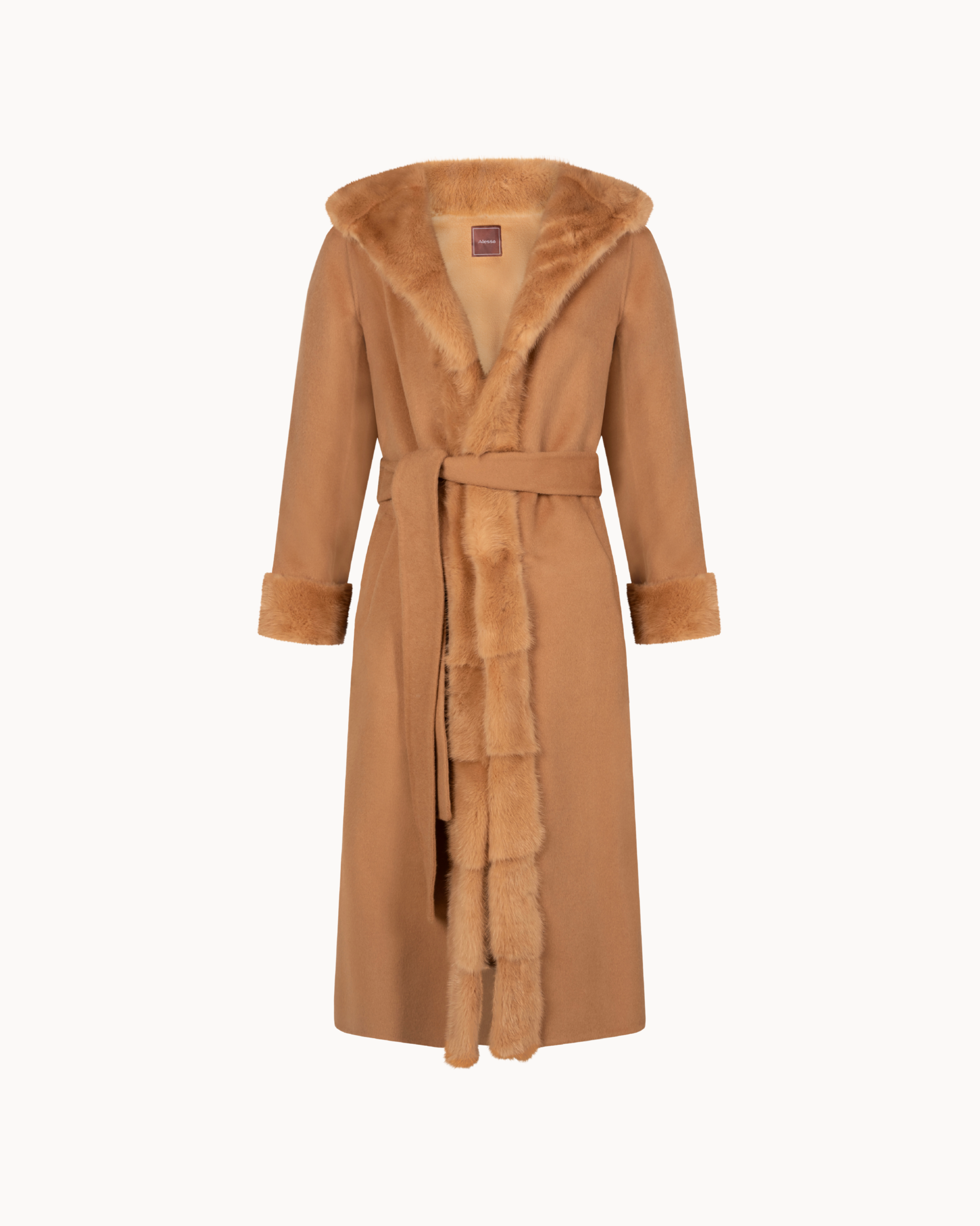 A plush real mink fur trim runs along the hood and front opening, softly framing the neckline and continuing down the length of the coat for a rich, textural contrast. The hood adds both function and visual depth, enhancing the silhouette while maintaining an effortlessly sophisticated feel. A self-tie belt defines the waist, creating a feminine, sculpted shape, while the elongated length enhances movement and elegance. Finished with subtle fur-trimmed cuffs and a clean, minimalist body, Qamar is designed for elevated winter dressing with unmistakable luxury.
