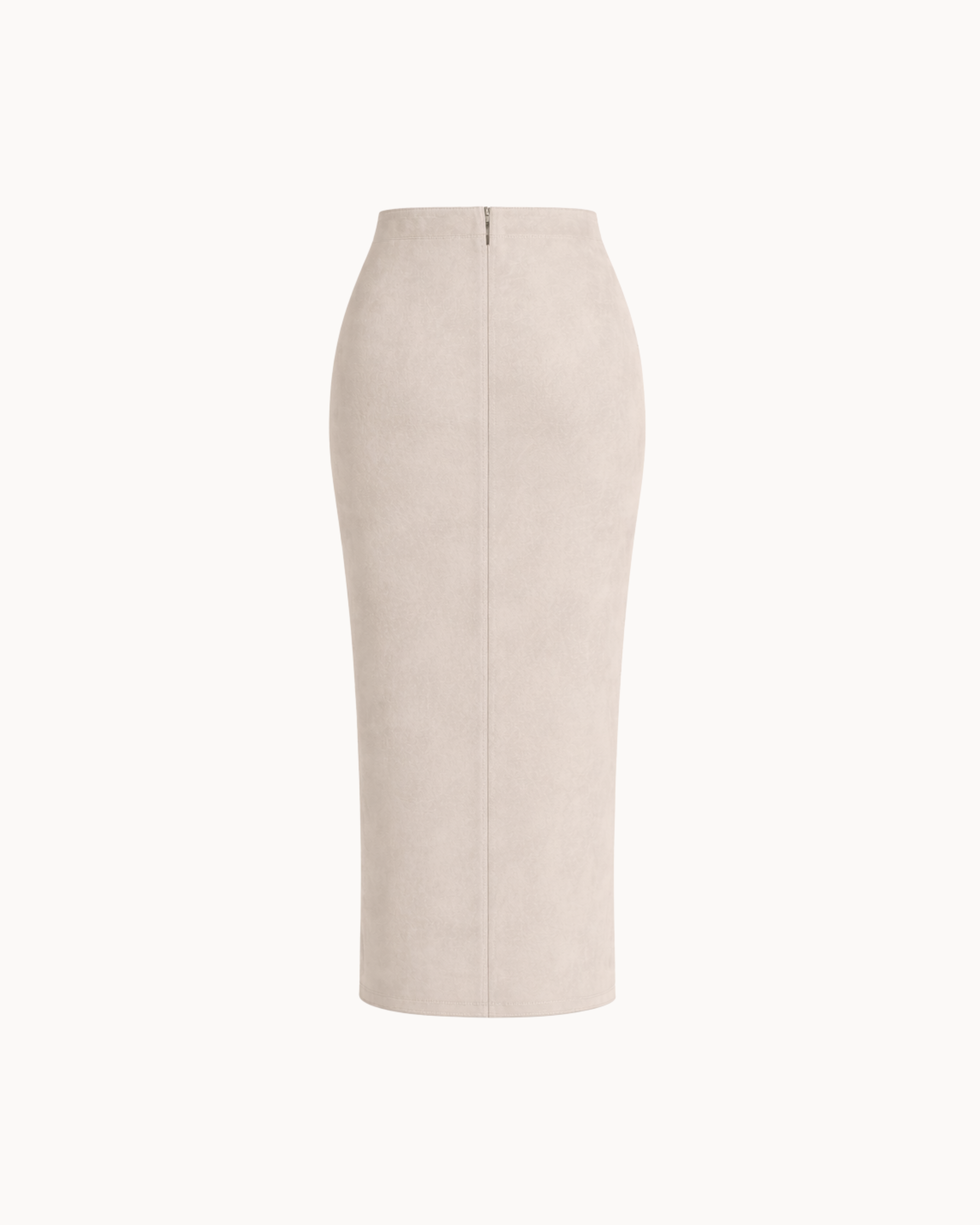 A midi skirt crafted from premium sheep suede. Defined by a high, structured waistband and a sleek column silhouette, it creates a long, sculpted line. The front slit introduces subtle movement, balancing precision with ease. Fully lined in satin for a smooth, refined finish.