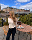 Defined by its sculpted fit and soft ribbed accents, the Alba Top frames the body with quiet precision. A deep neckline and delicate button details elevate this timeless essential—designed to move effortlessly from day to evening.