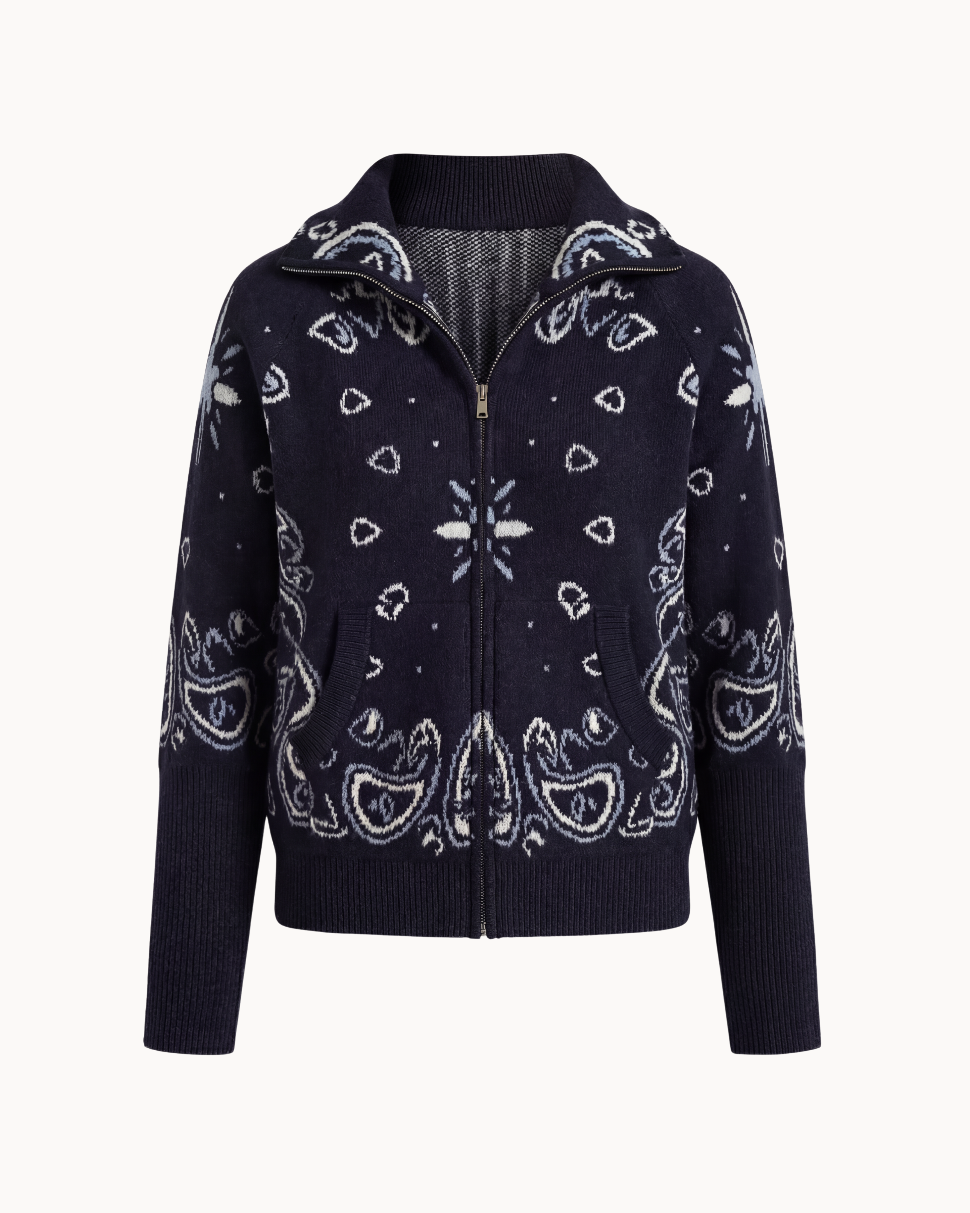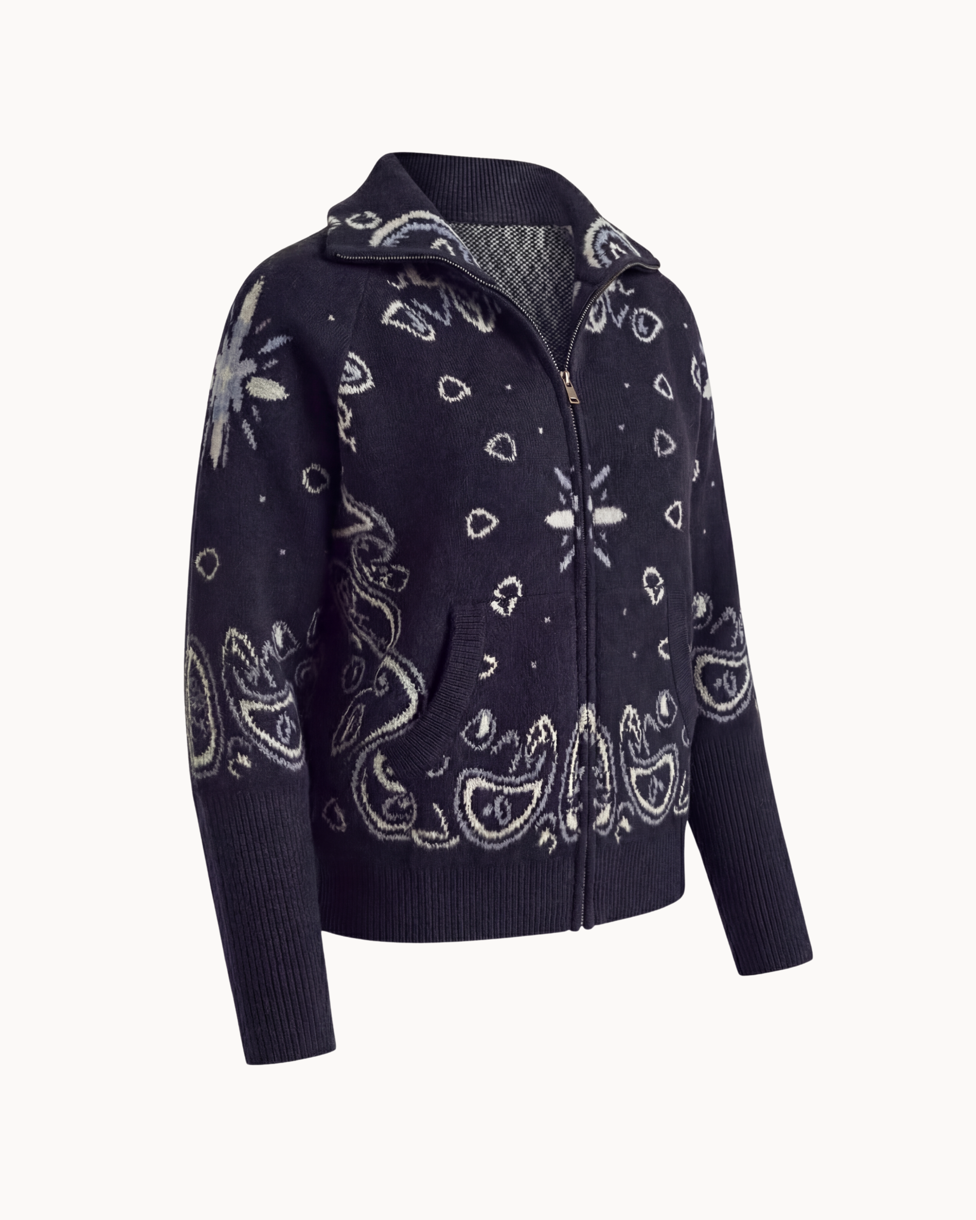 Inspired by classic bandana motifs, the Adelé Heritage Knit blends heritage design with modern elegance. The zip-up cardigan is crafted with detailed intarsia knitting that creates a refined yet relaxed expression.