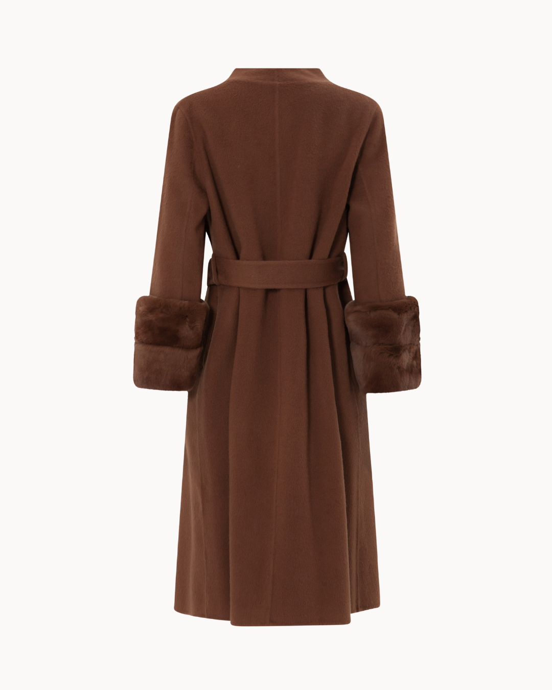 Crafted in a signature blend of Mongolian cashmere and fine wool, this coat embodies elegance through its softness, structure, and warmth. The natural fibers create a smooth, enveloping feel against the skin while maintaining an elegant drape and resilience over time. Finished with sumptuous Rex fur cuffs, it balances texture and sophistication — a modern heirloom designed to transcend seasons.