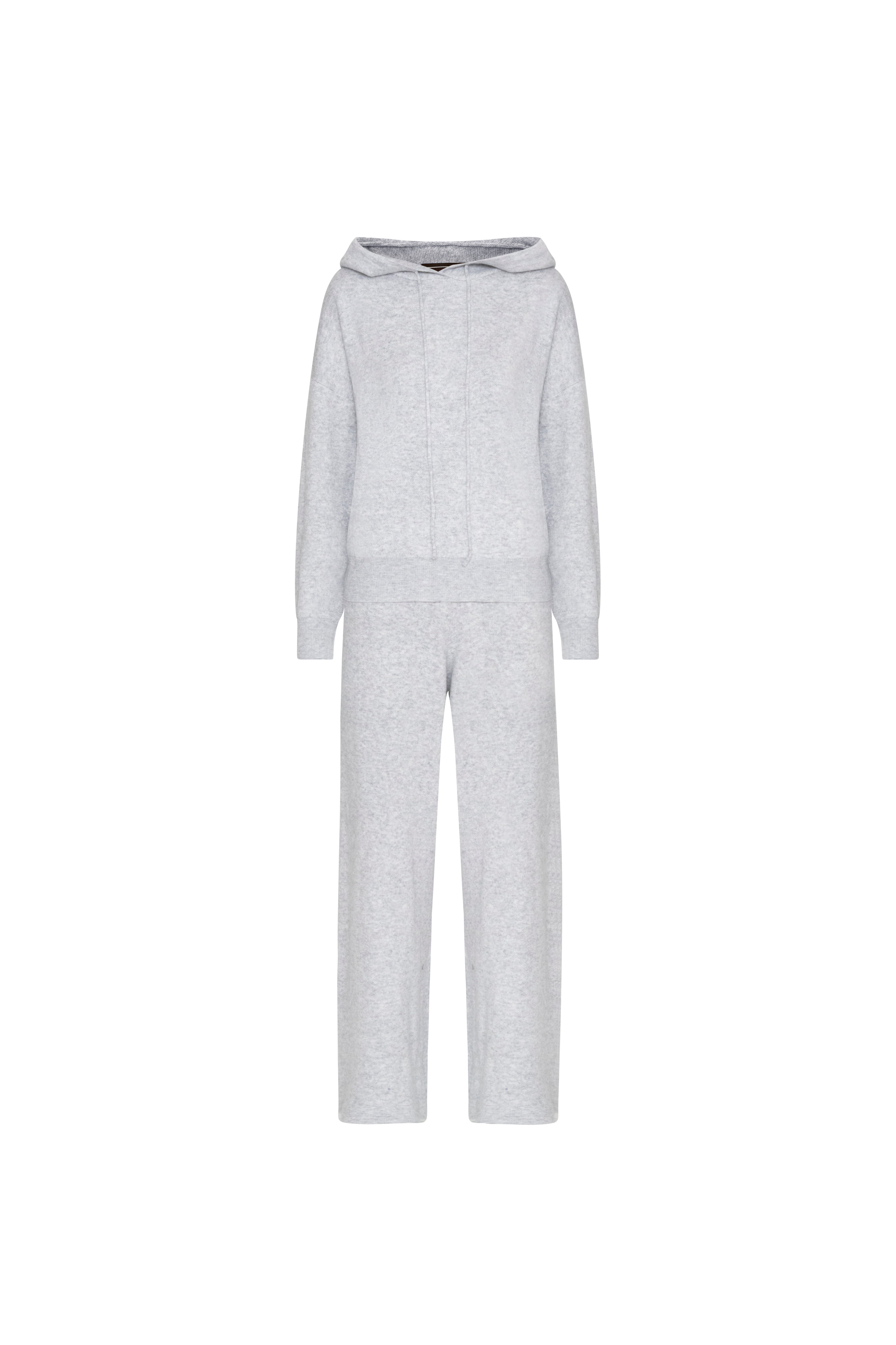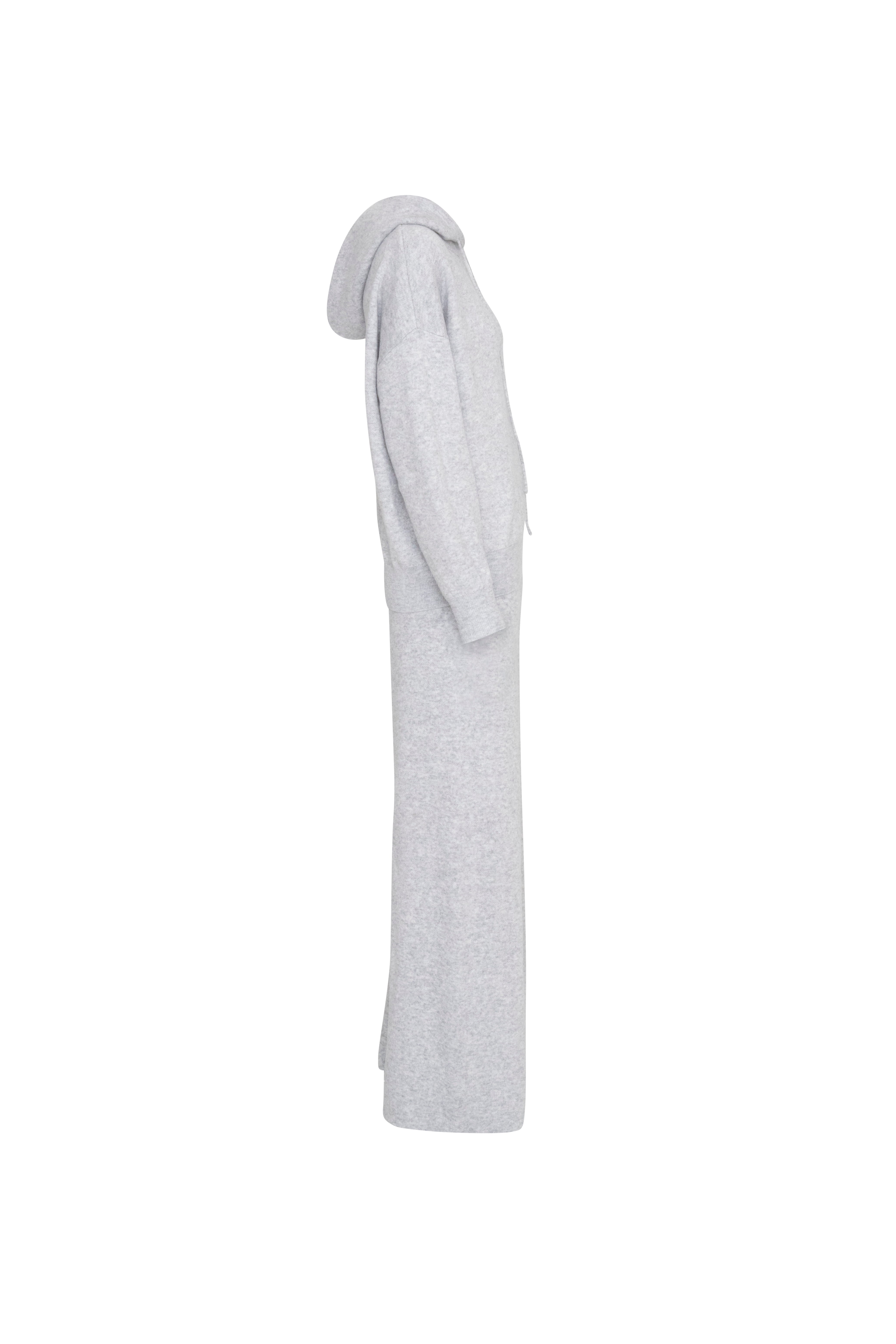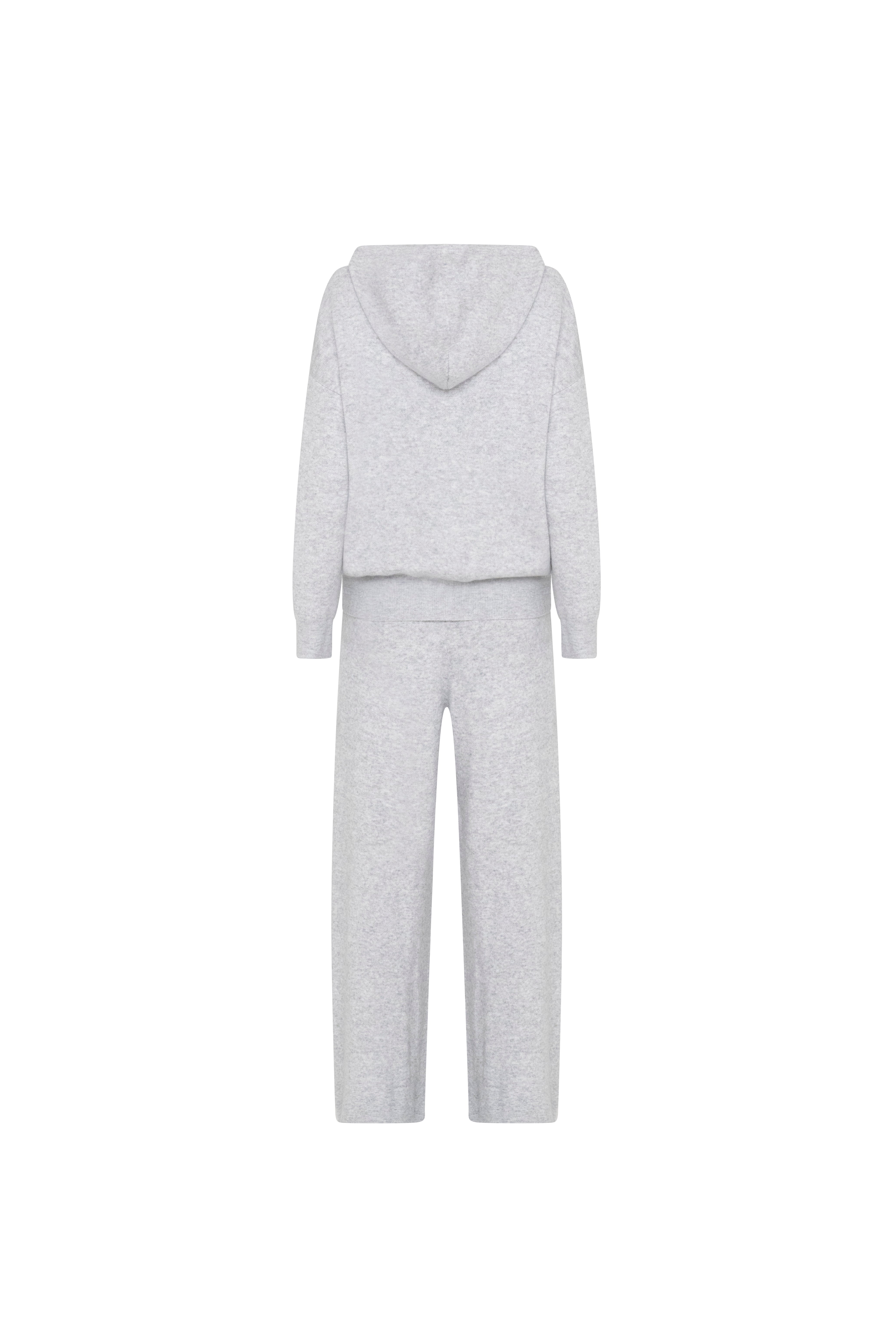 Crafted from a premium wool blend knit, this matching hoodie and wide-leg pant set combines warmth, softness, and timeless design. The neutral grey hue and relaxed silhouette is ideal for slow mornings, travel days, or evenings spent unwinding in style. A true balance between comfort and refinement.