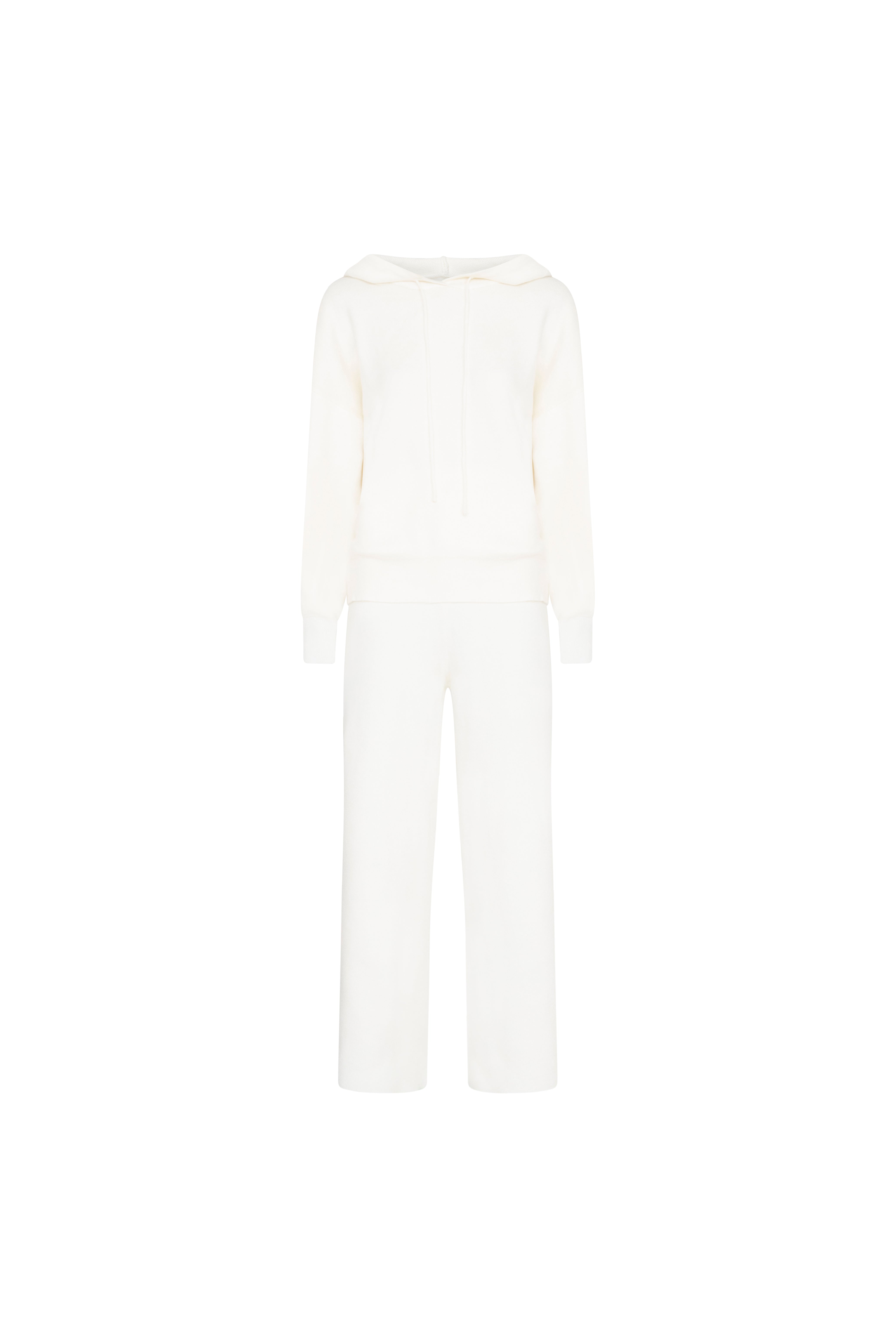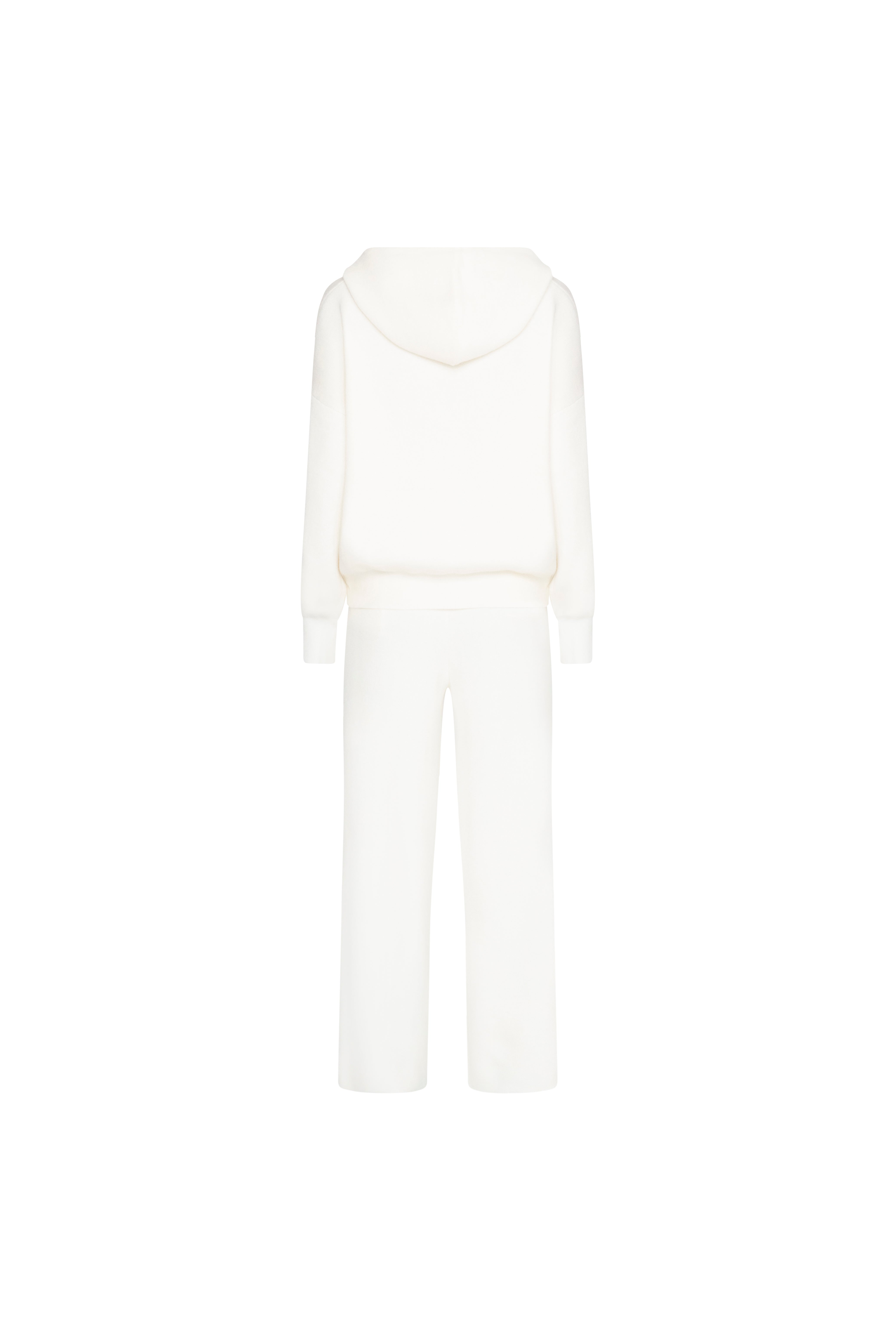 Crafted from a premium wool blend knit, this matching hoodie and wide-leg pant set combines warmth, softness, and timeless design. The neutral off white hue and relaxed silhouette is ideal for slow mornings, travel days, or evenings spent unwinding in style. A true balance between comfort and refinement.