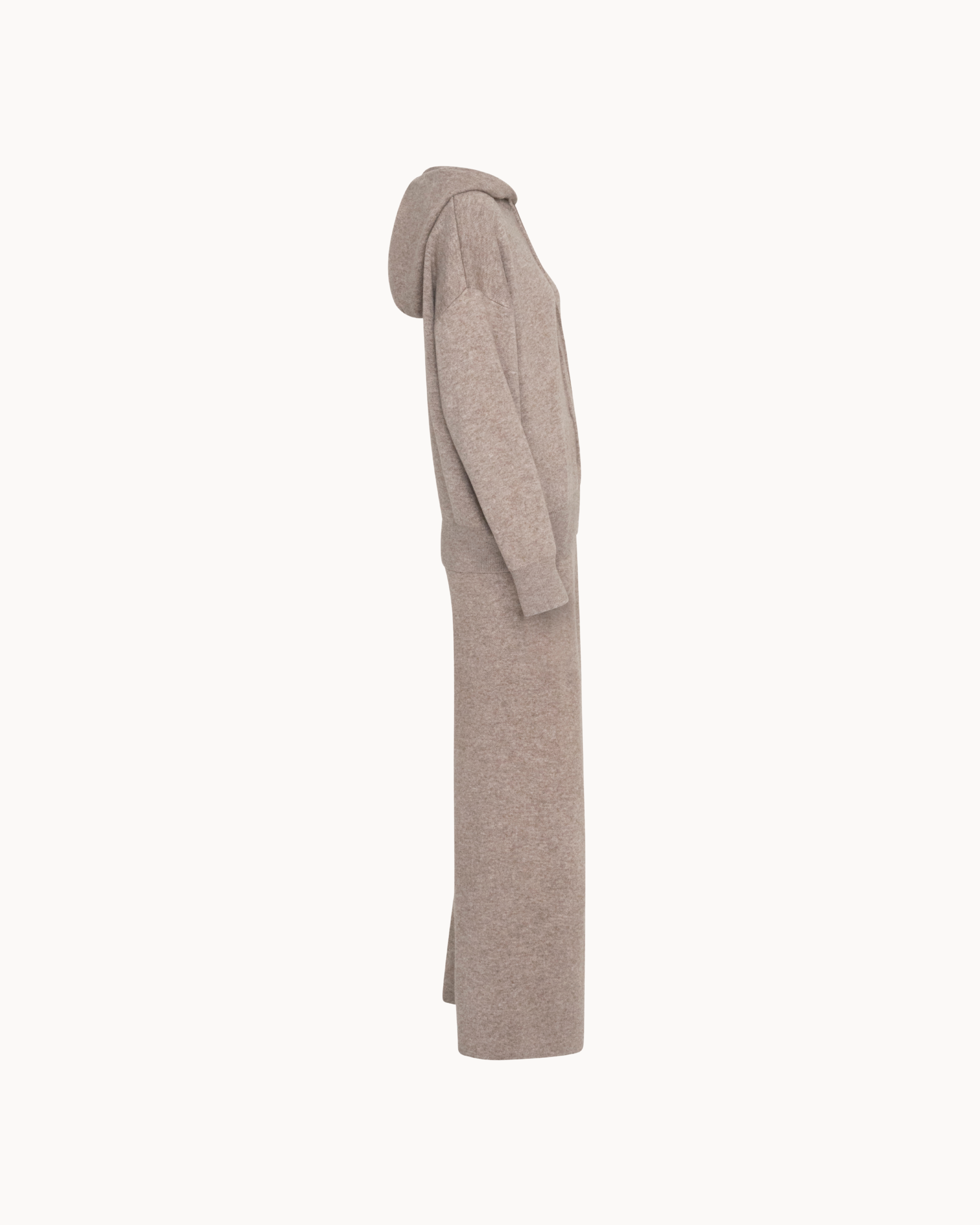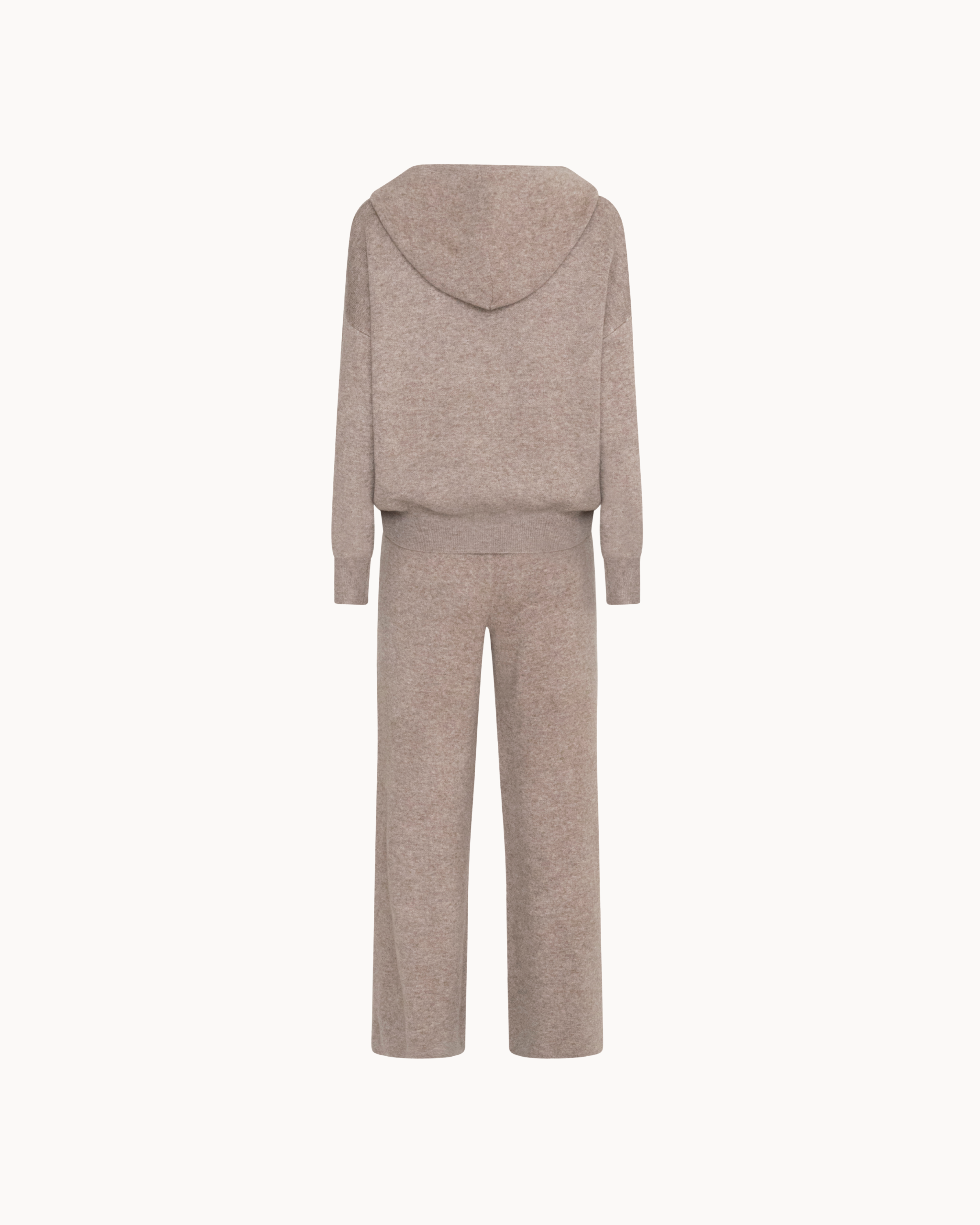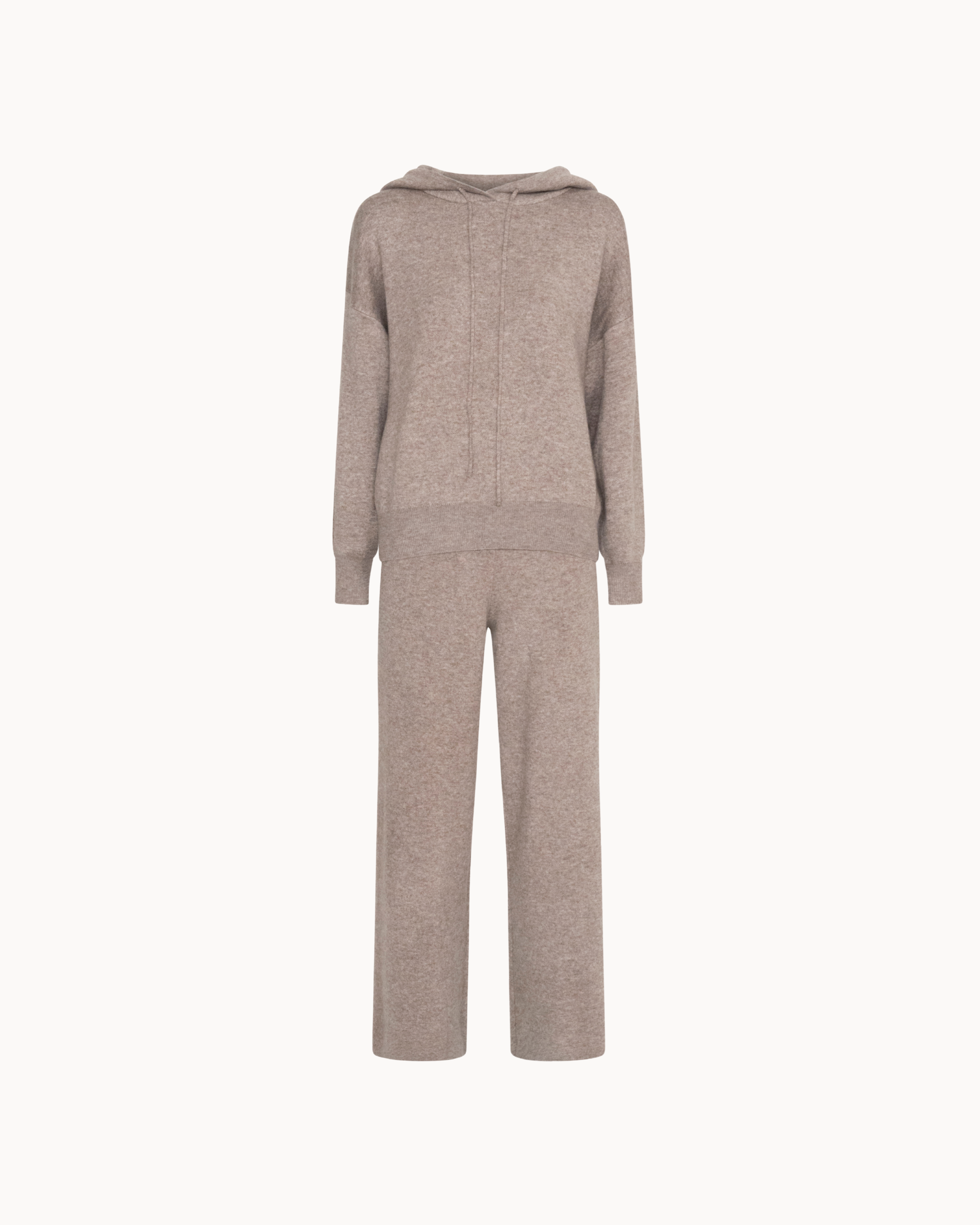 Crafted from a premium wool blend knit, this matching hoodie and wide-leg pant set combines warmth, softness, and timeless design. The neutral taupe hue and relaxed silhouette is ideal for slow mornings, travel days, or evenings spent unwinding in style. A true balance between comfort and refinement.