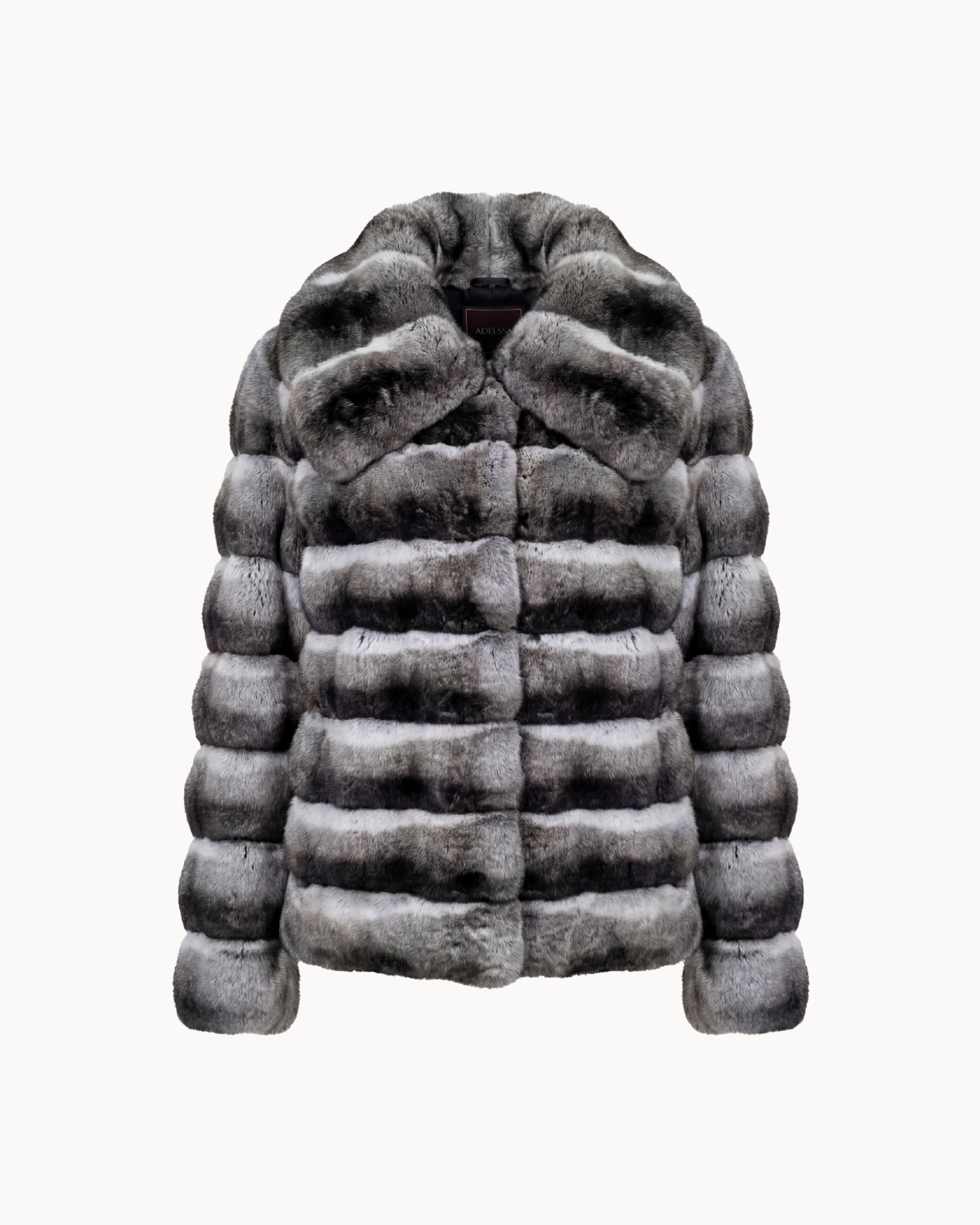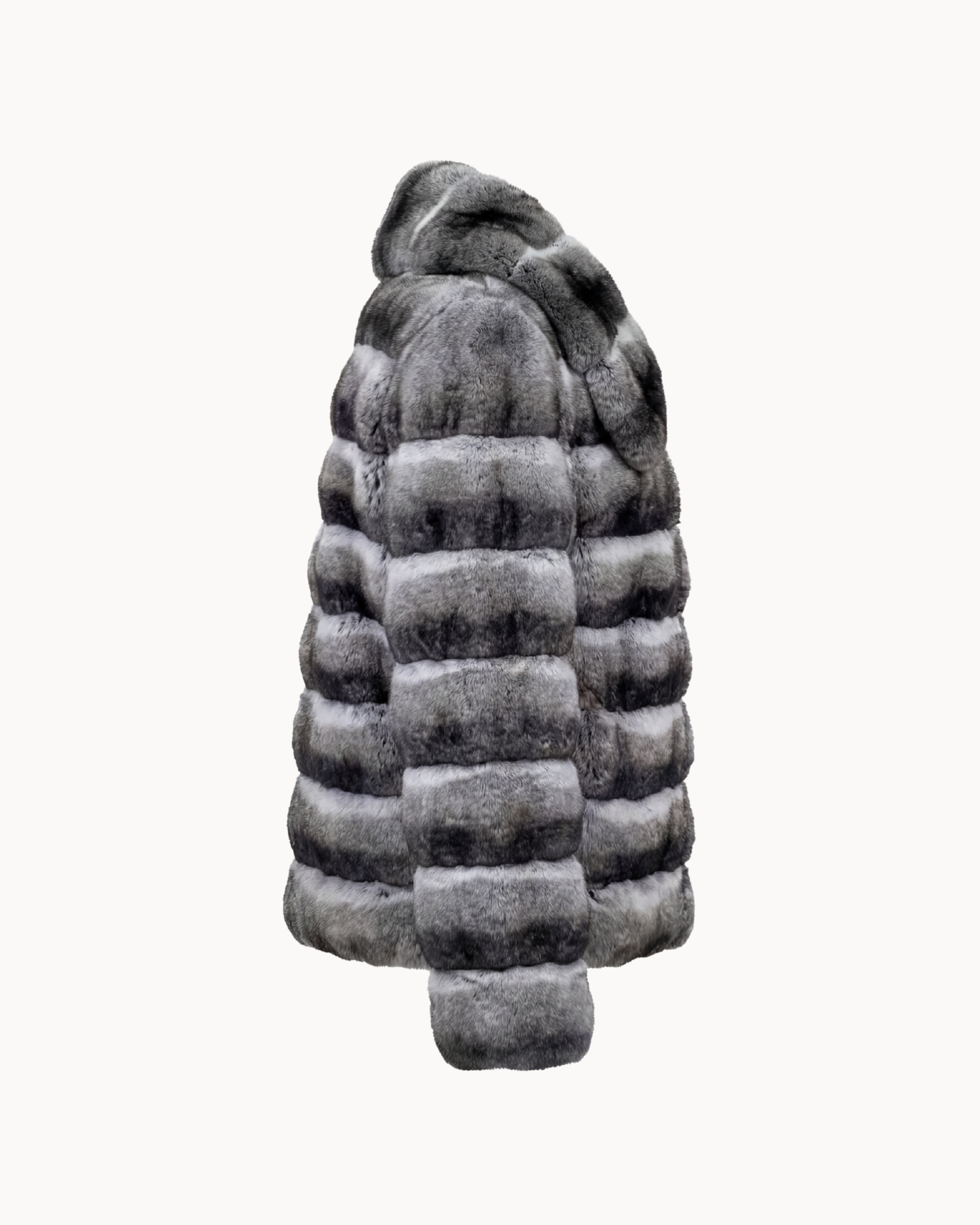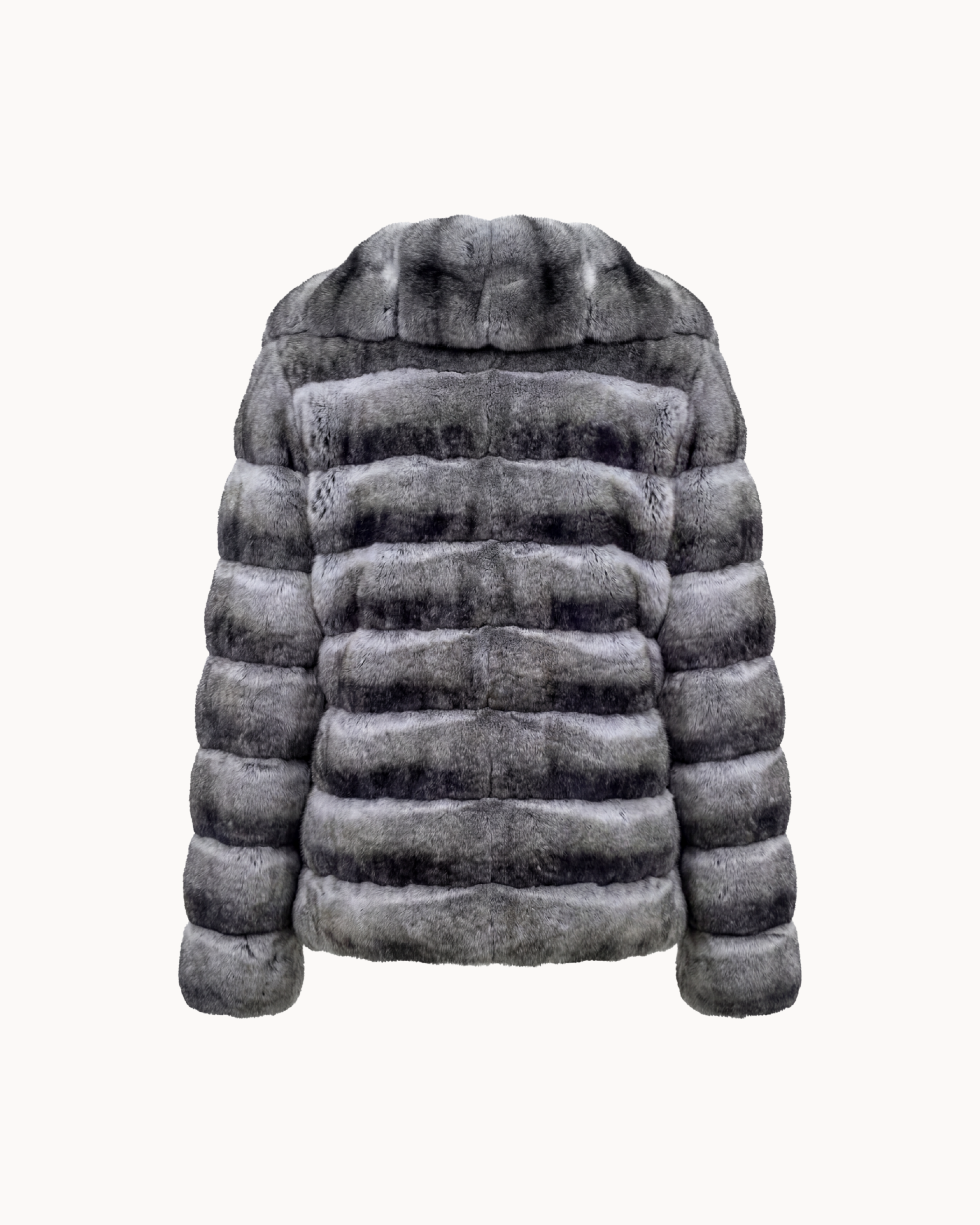 This jacket is crafted from exceptionally soft chinchilla fur, prized for its unparalleled density, natural sheen, and velvety hand-feel. The fur is worked in horizontal panels, creating a refined rhythm that enhances the garment’s structure while maintaining fluidity and effortless movement.