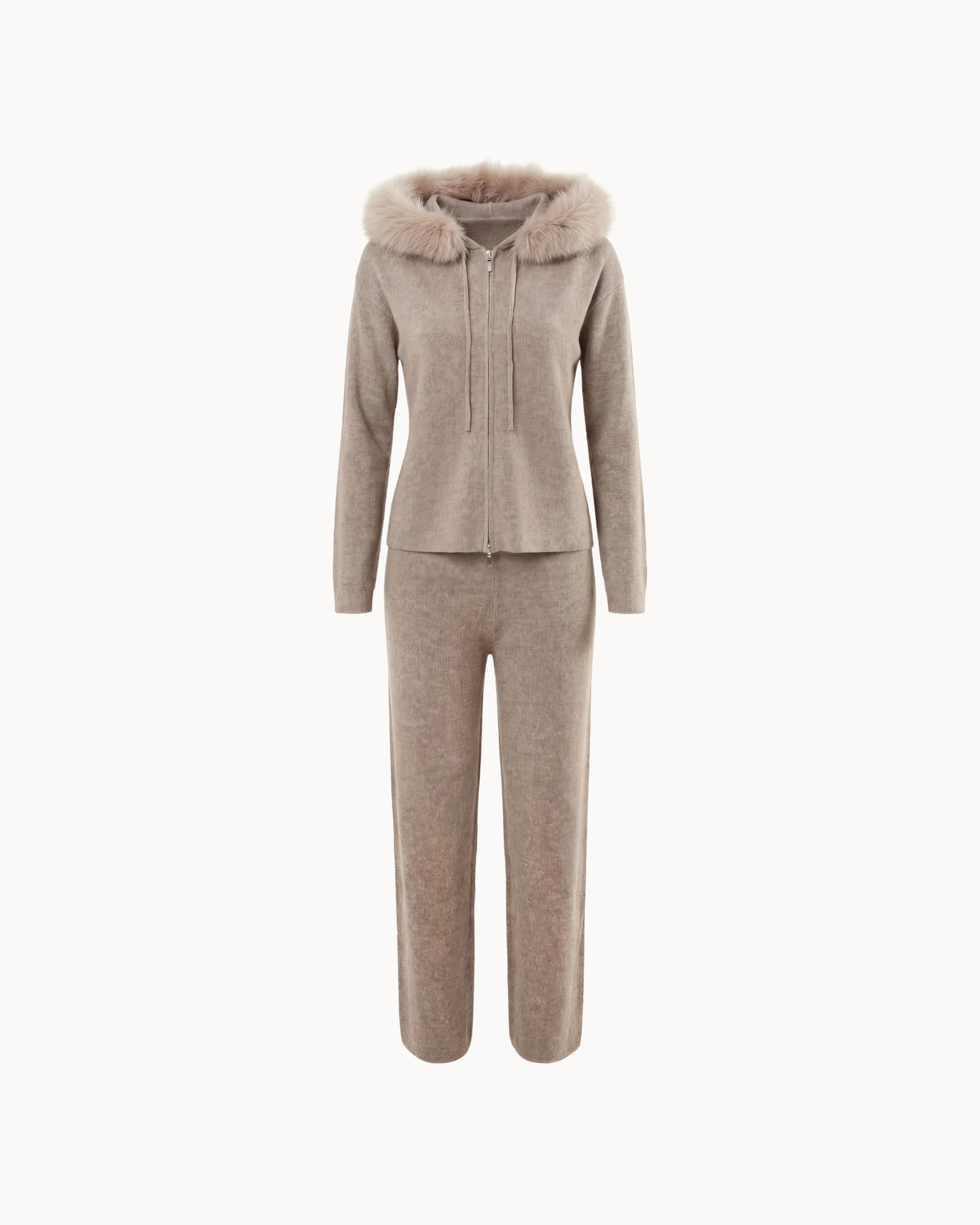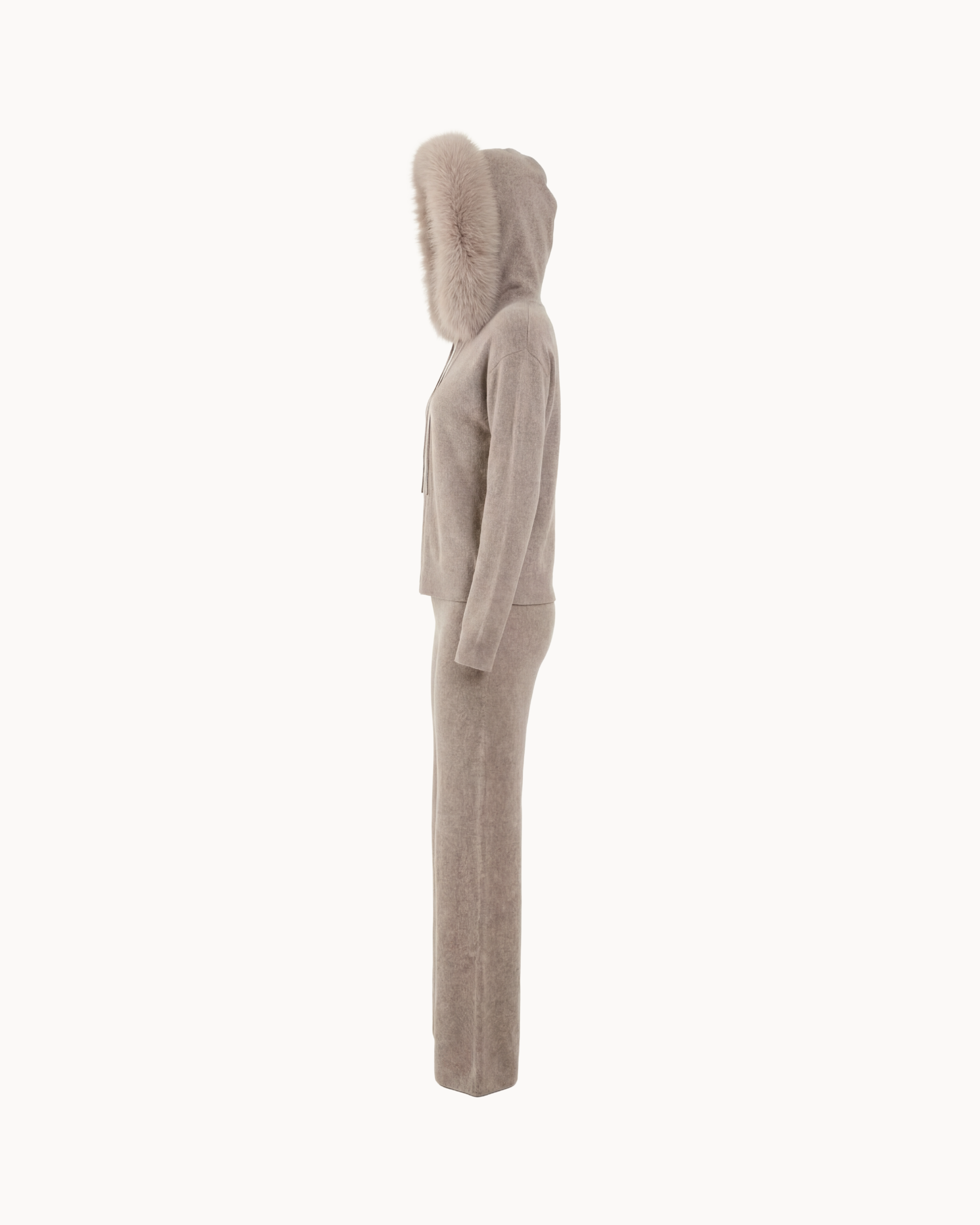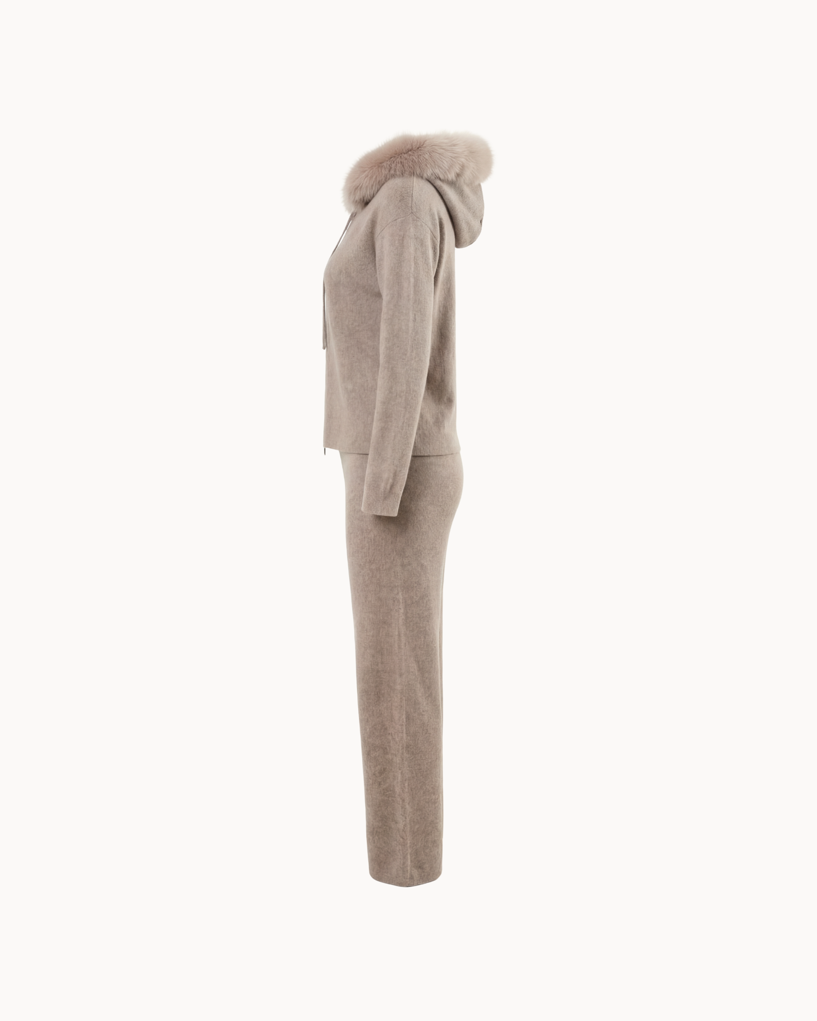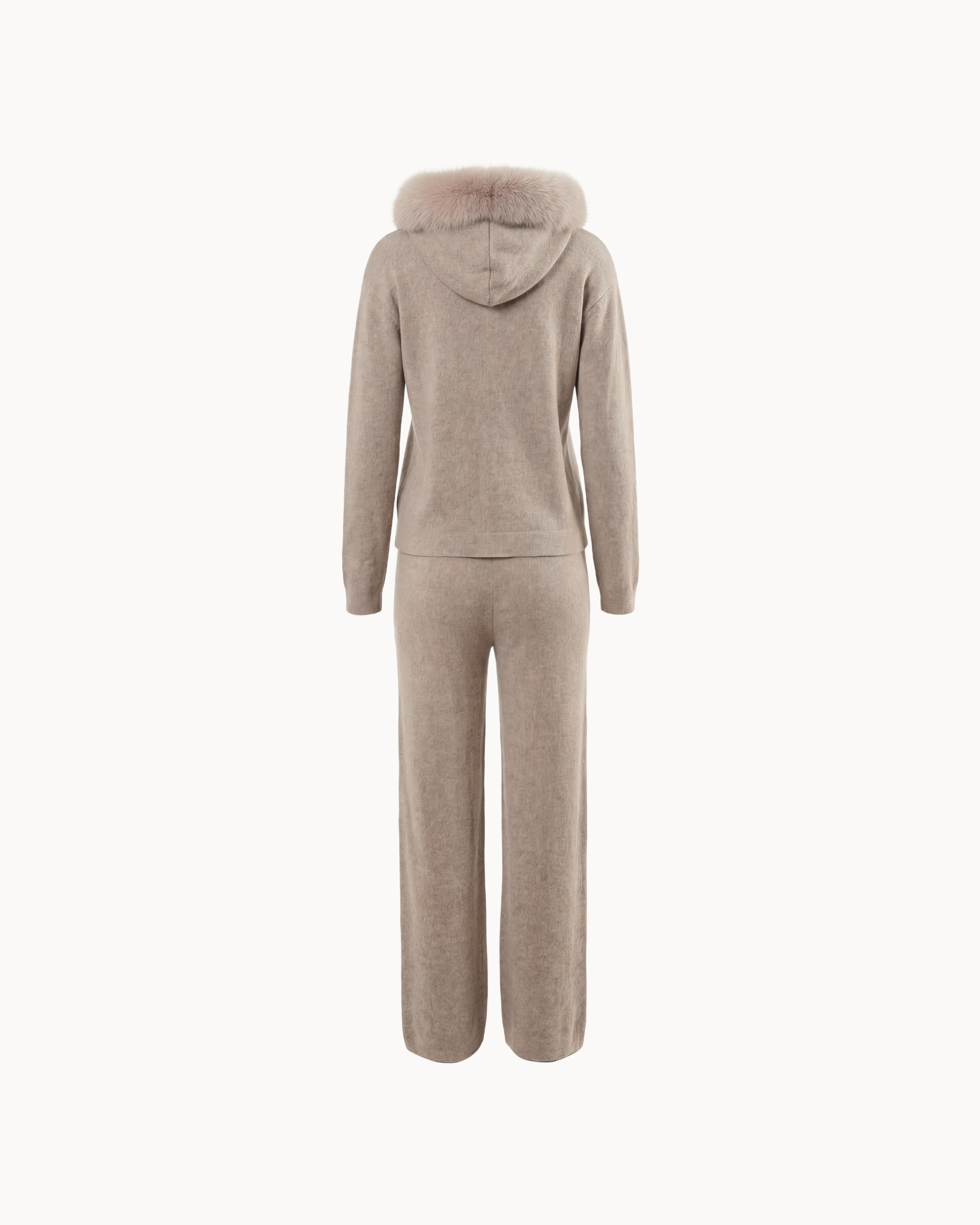 The set’s hoodie features a practical zip-up design, allowing for versatile styling—wear it open for a relaxed look or zipped up for extra warmth. Adding to its luxurious appeal, the hoodie is adorned with a statement detachable fox fur collar, offering an exclusive touch that can be adjusted to suit any occasion. Discreet buttons make it easy to remove or attach the fur, providing ultimate styling versatility.