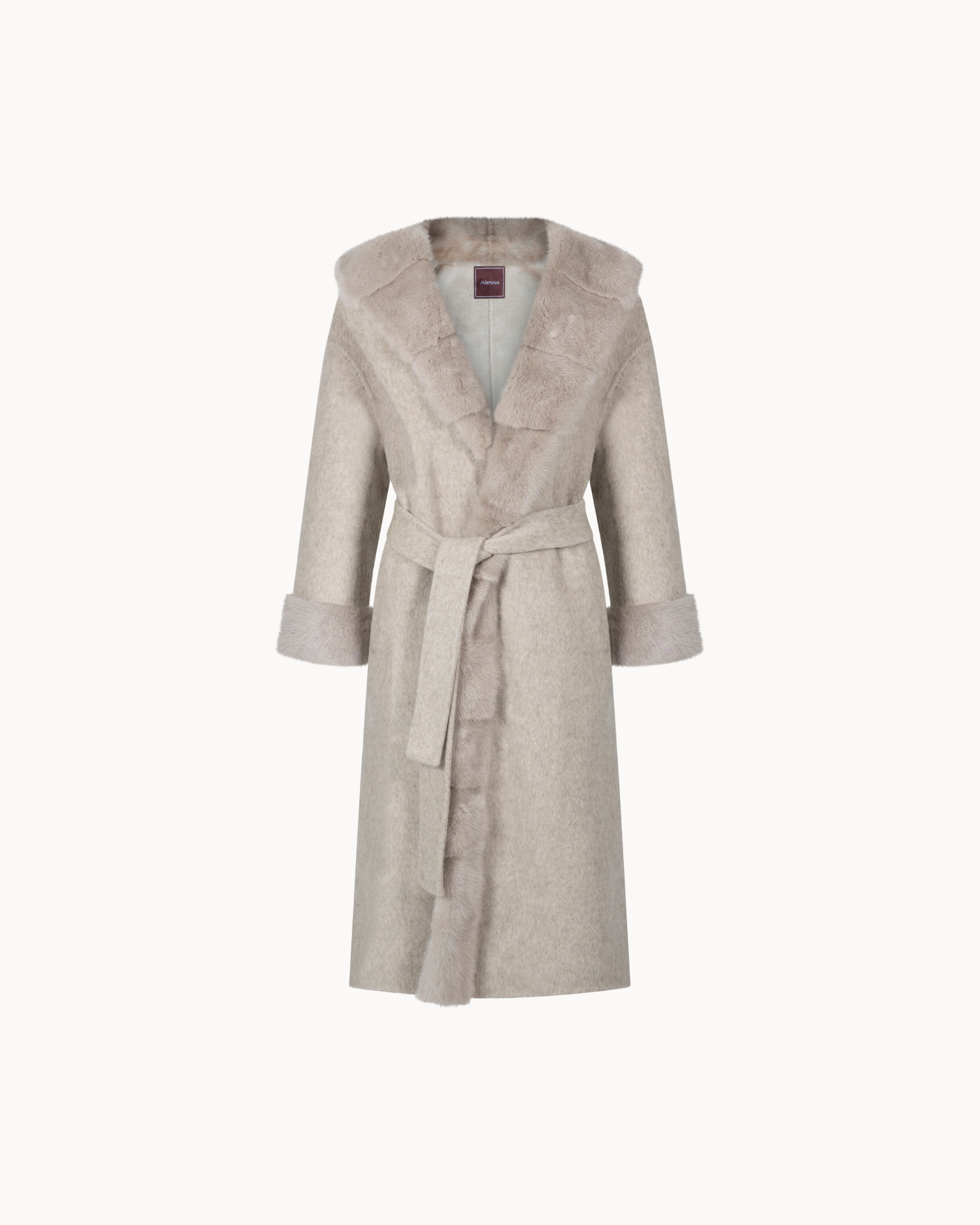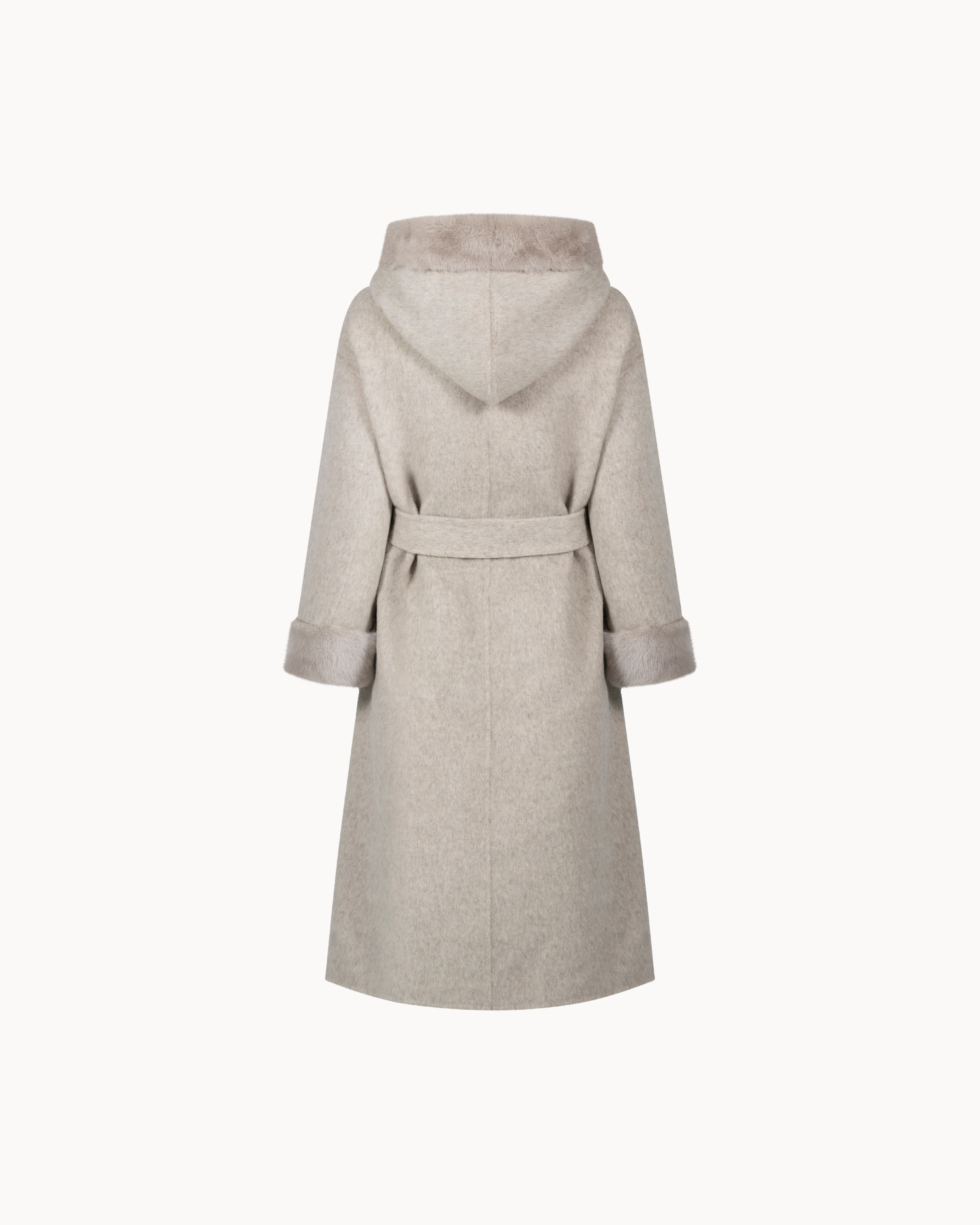 Luxurious mink fur trim frames the collar, front placket, and cuffs, adding depth, texture, and quiet opulence without overpowering the silhouette. The wrap design with a self-tie belt allows for a personalised fit, balancing elegance and comfort with ease.