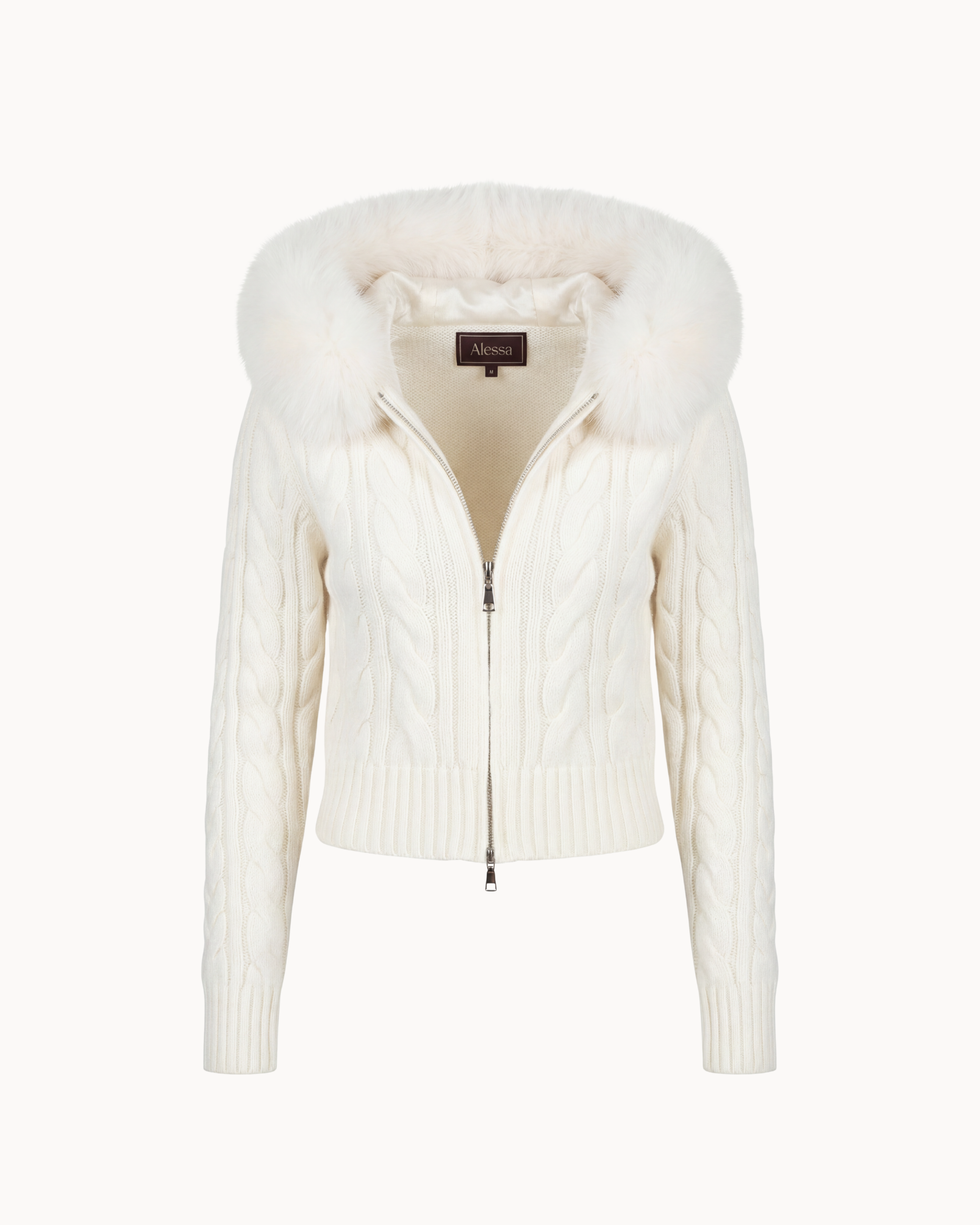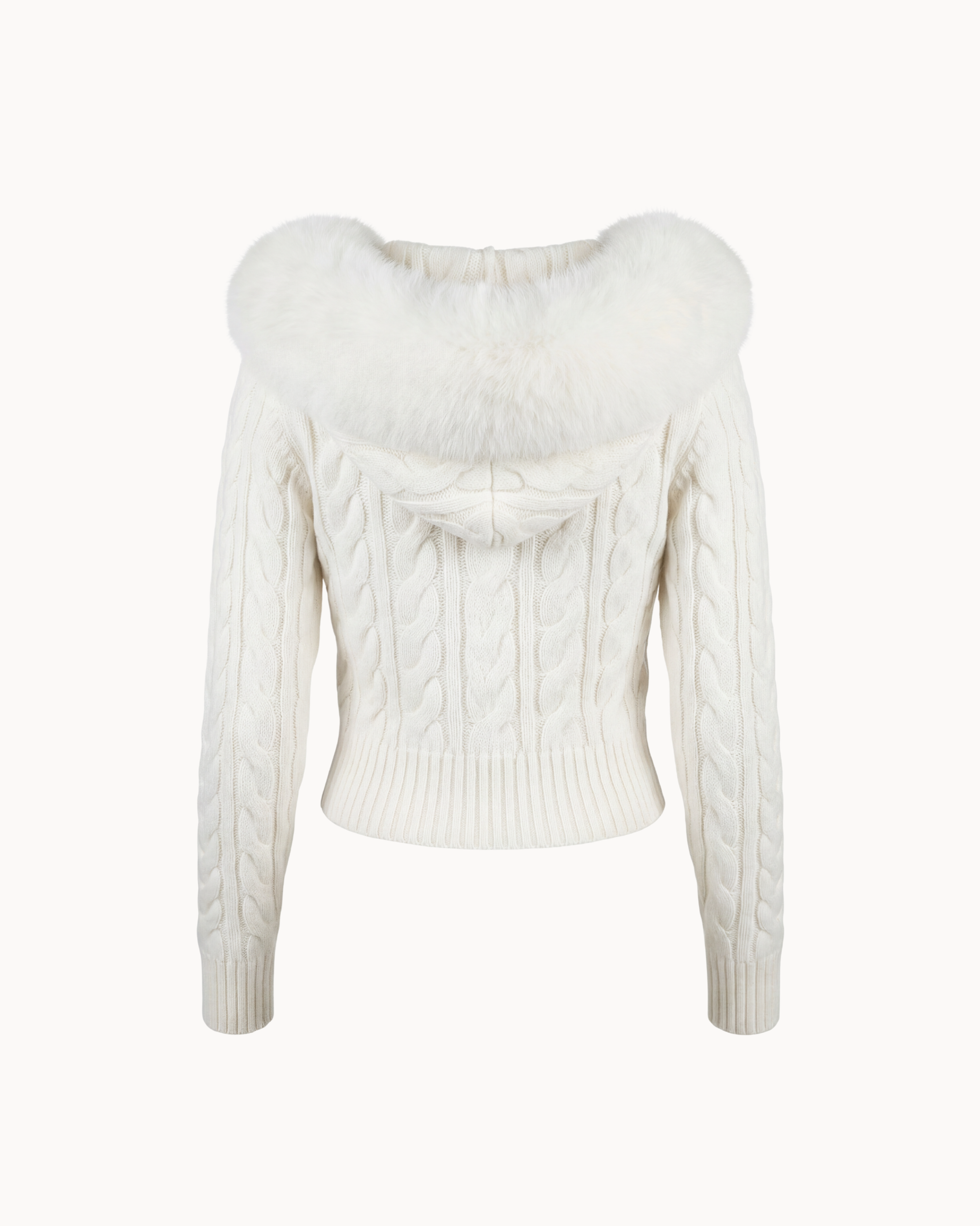 A cozy classic with a touch of luxury, this white cable knit hoodie is designed for both comfort and style. It features a soft, warm knit, a zip-up front, and a plush fur-trimmed hood that adds an elegant finish. The fitted cut and ribbed details create a flattering shape, making it perfect for both casual and dressed-up looks.