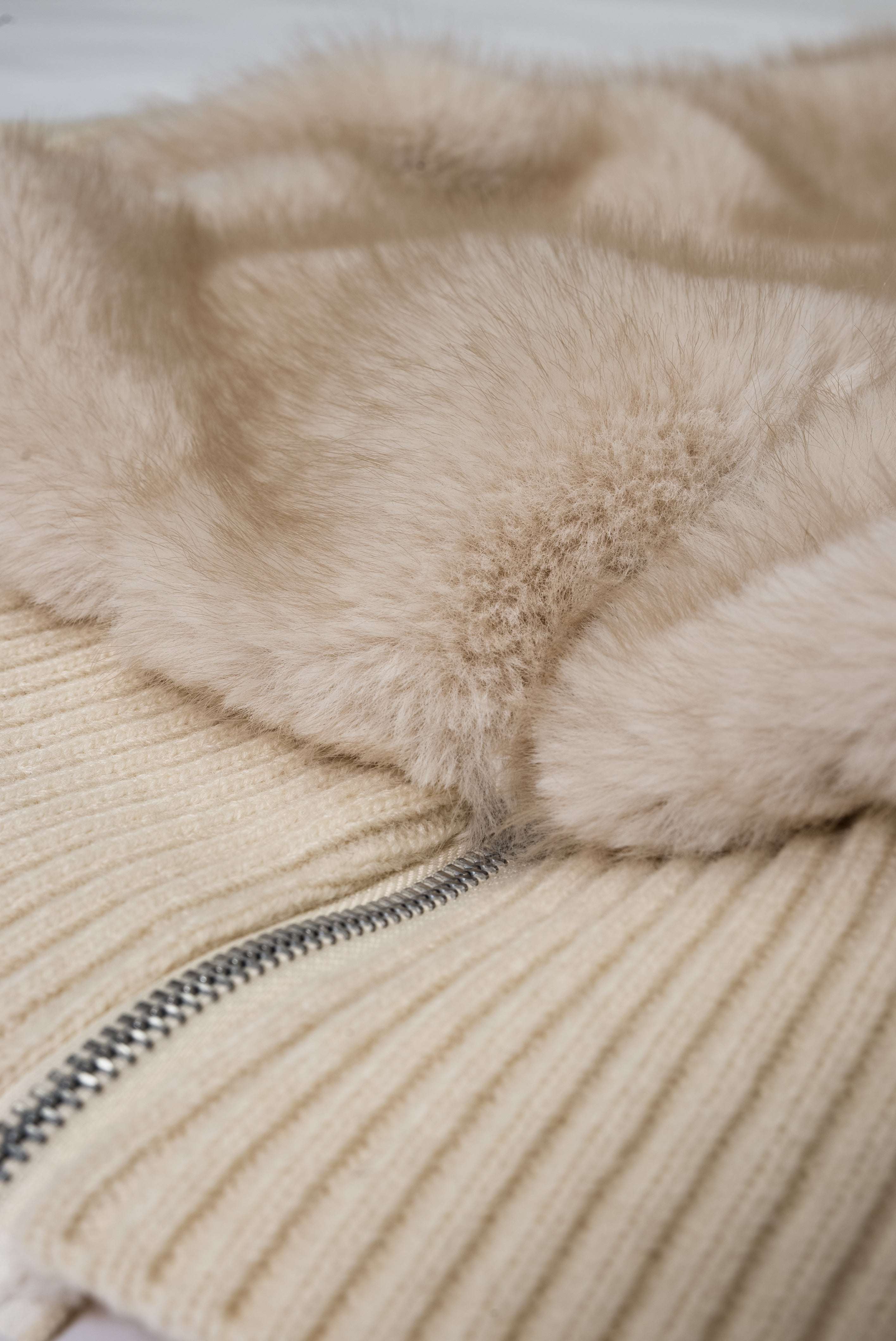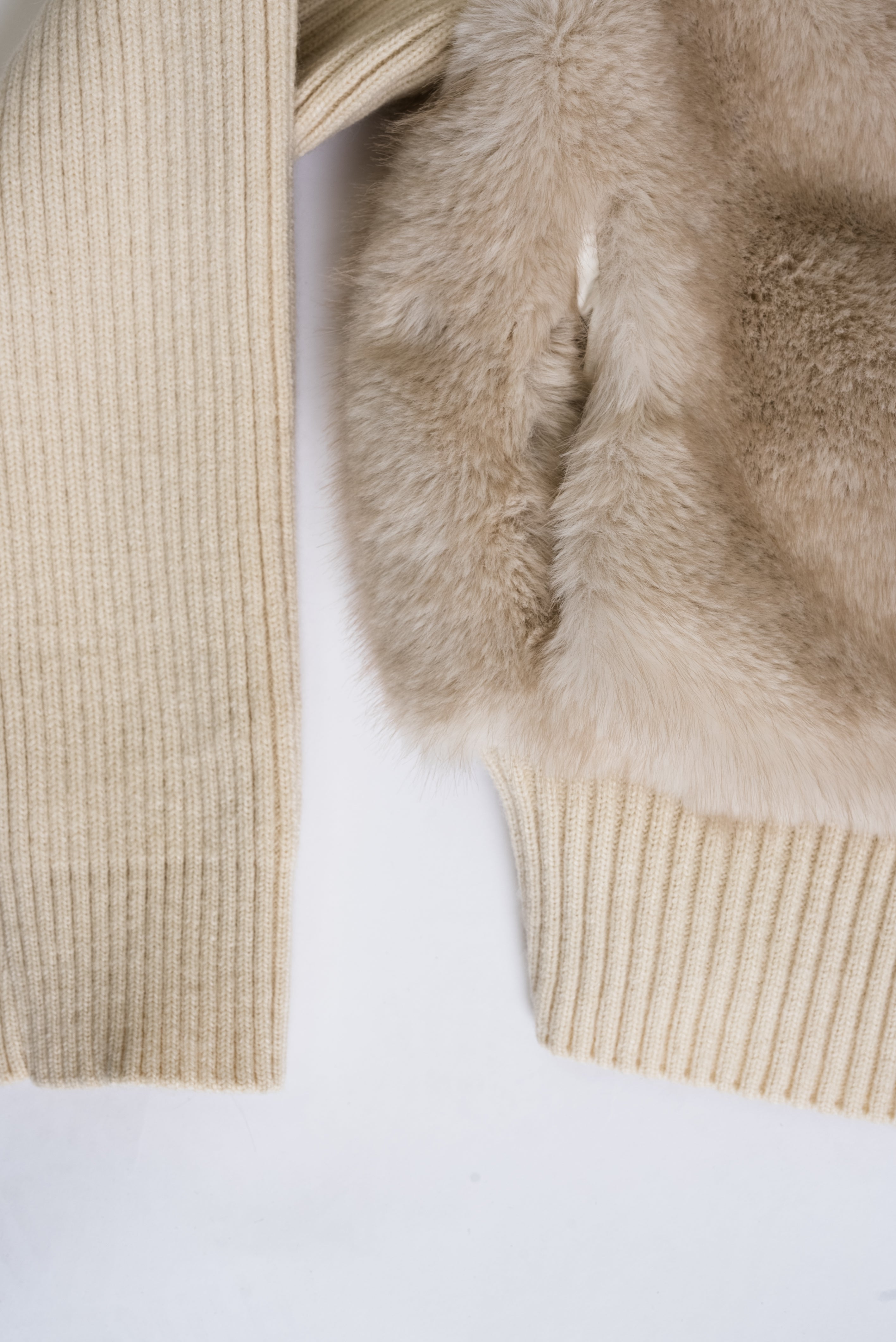 The jacket’s ribbed wool-blend knit sleeves and hem create a subtle contrast in texture, offering a structured yet elegant fit.