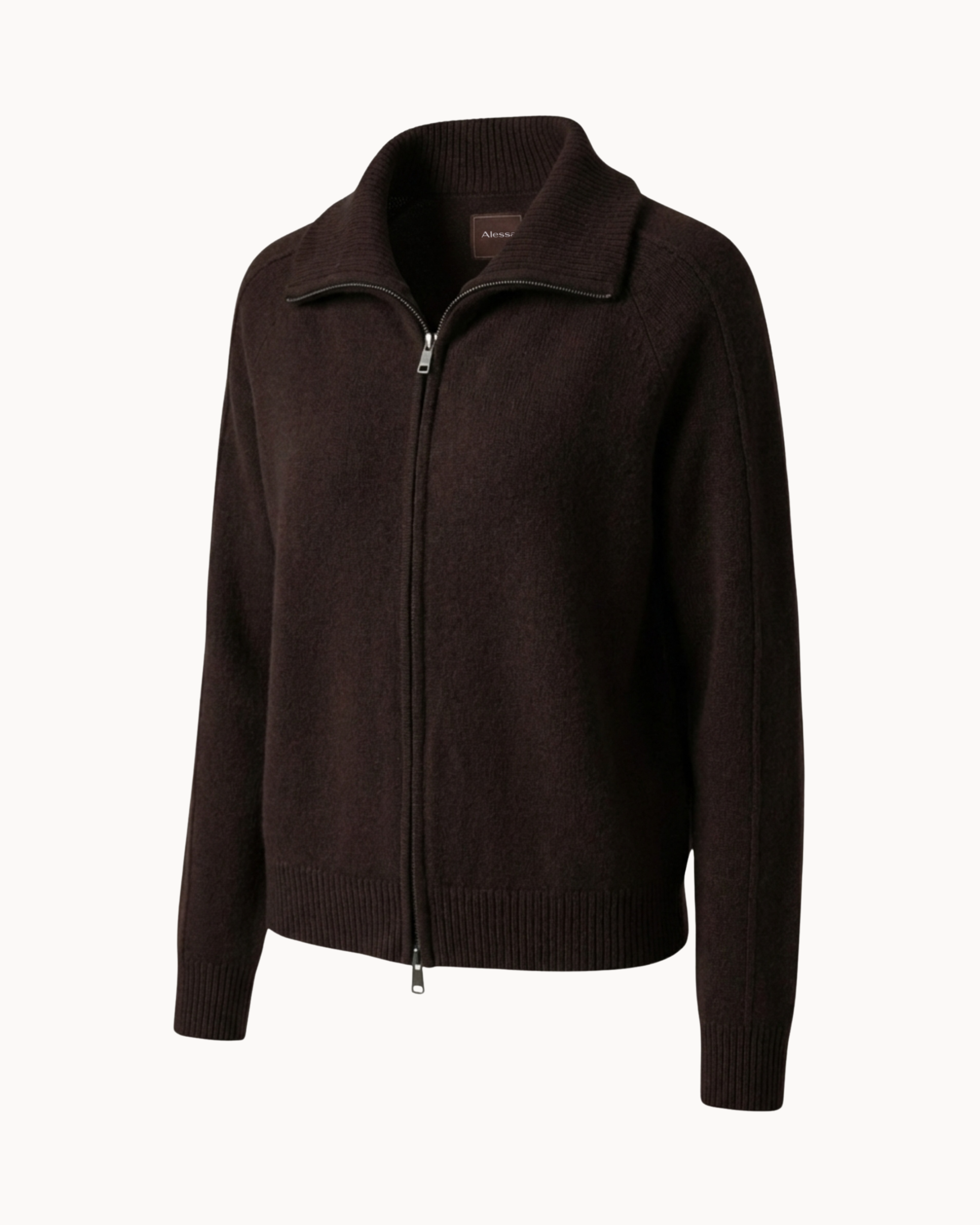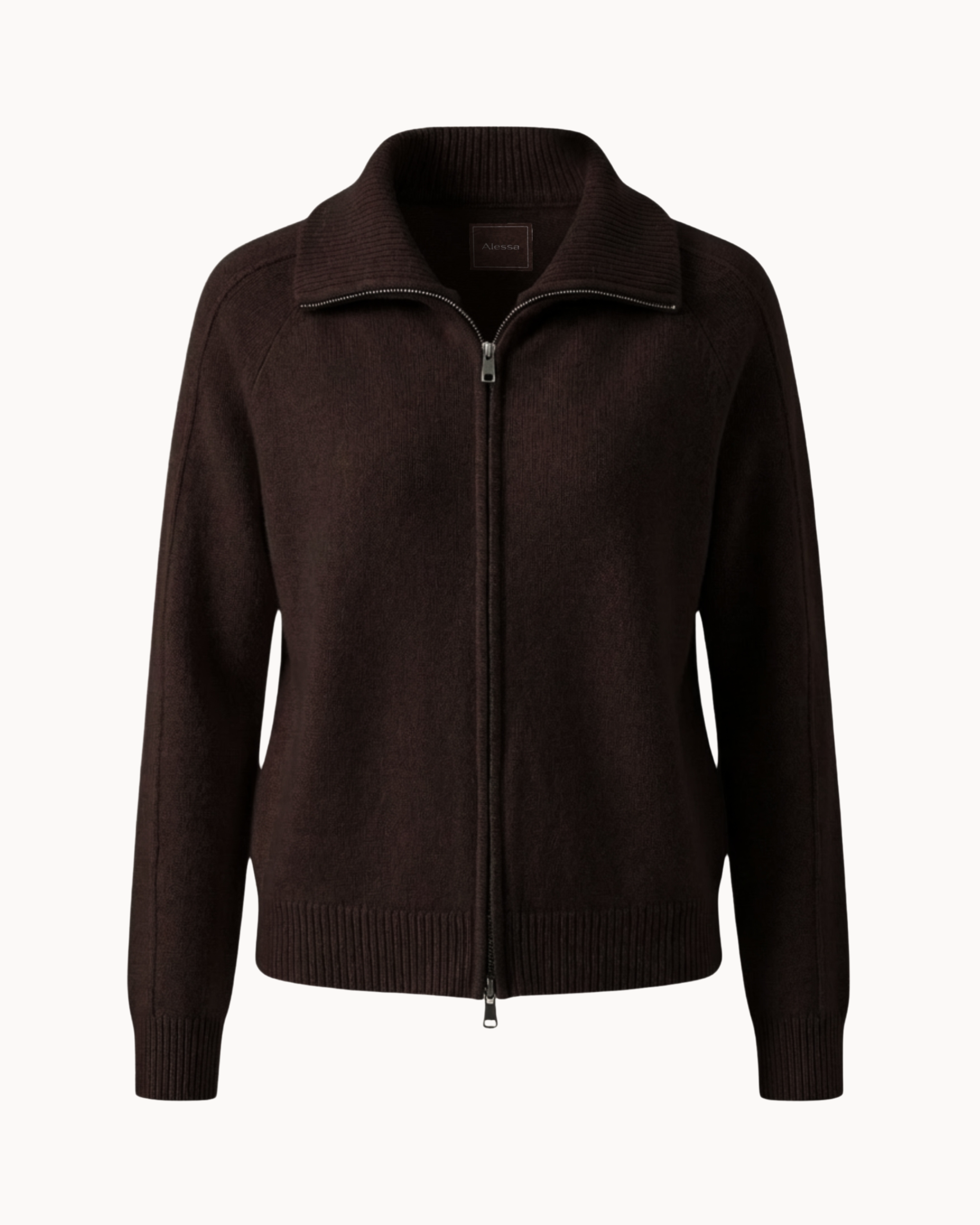 A soft brown-toned zip-up knit featuring a relaxed collar, clean lines, and ribbed detailing. An everyday essential with a refined, minimal finish.