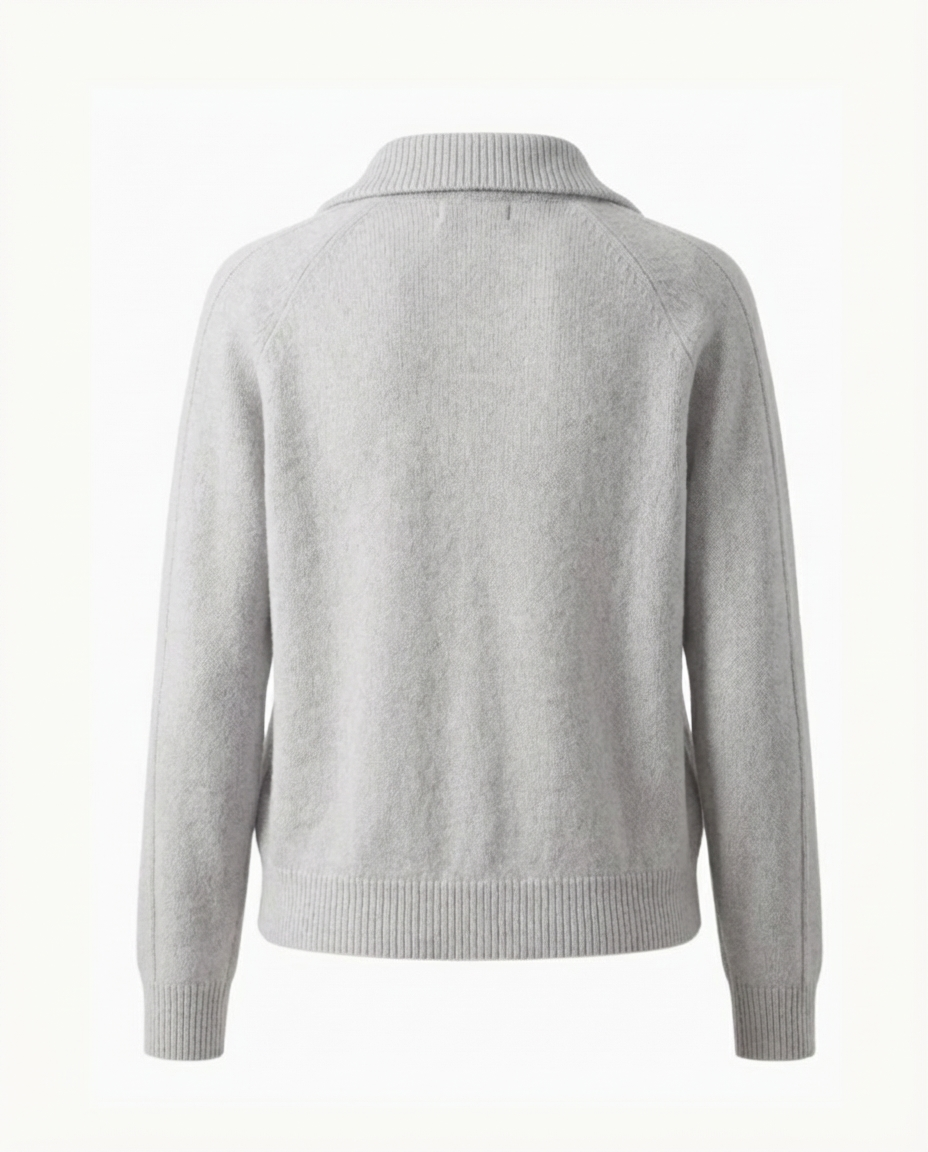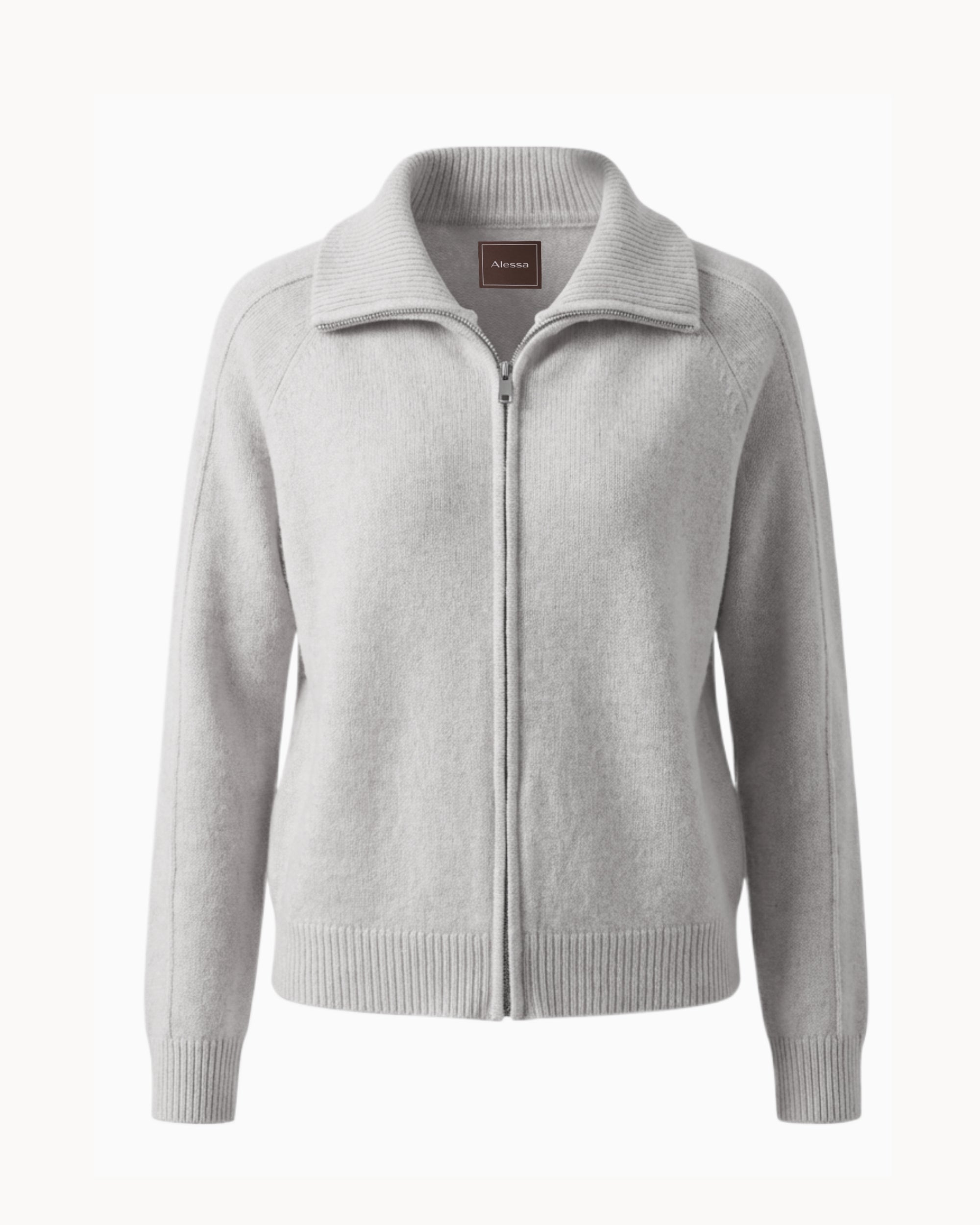 A soft grey-toned zip-up knit featuring a relaxed collar, clean lines, and ribbed detailing. An everyday essential with a refined, minimal finish.