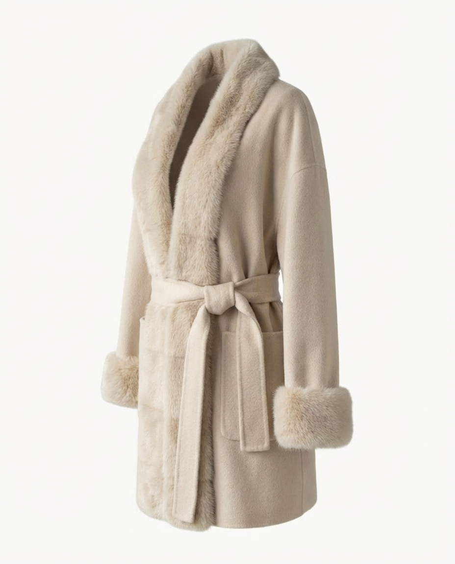 A soft cream-beige wrap coat with plush fur trim along the collar, front, and cuffs. Designed with a straight silhouette and tie belt for an effortlessly polished look.