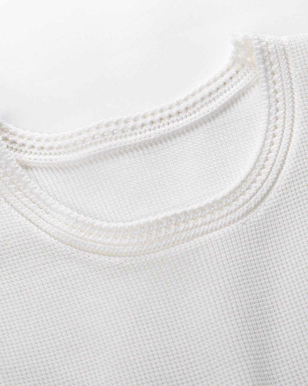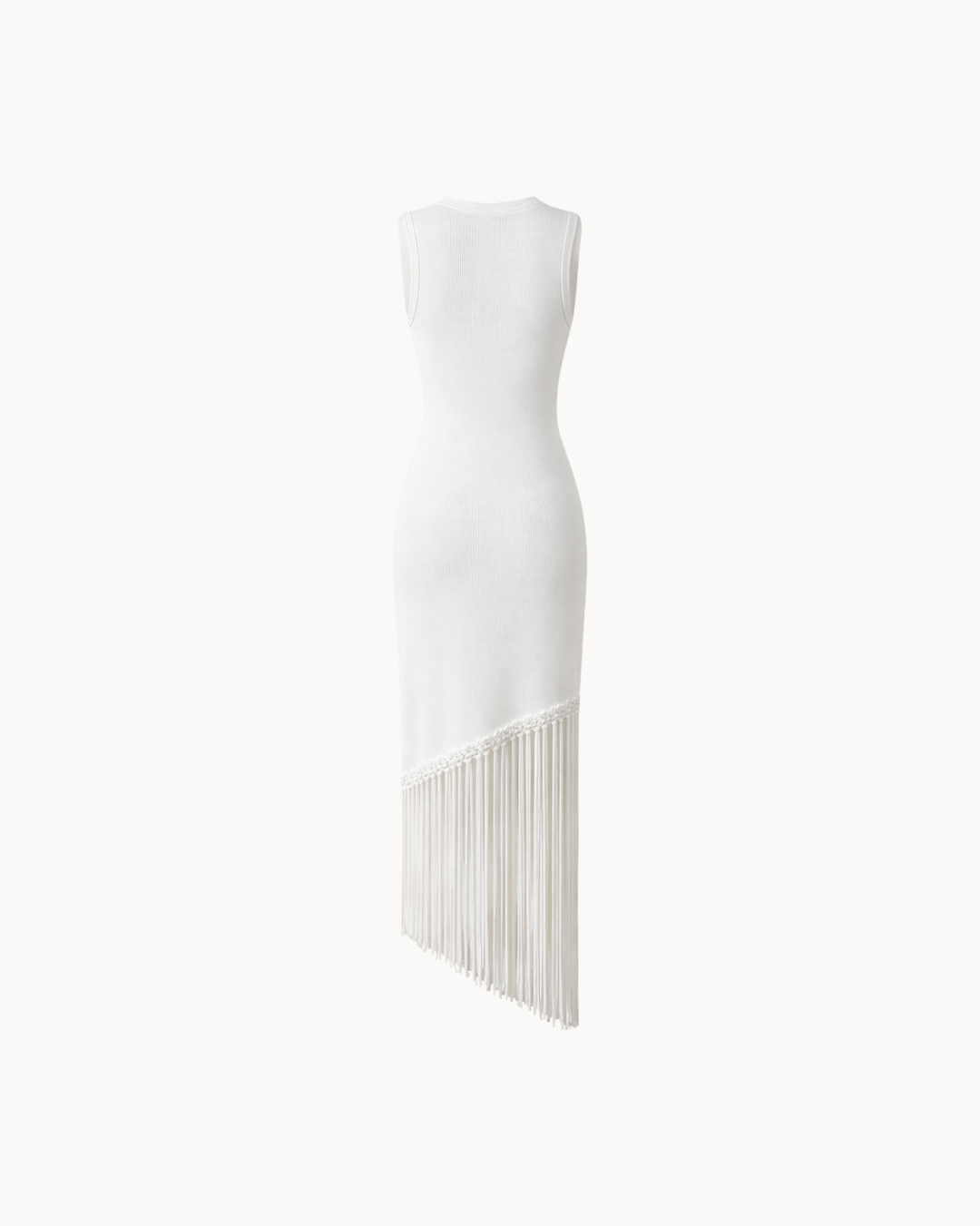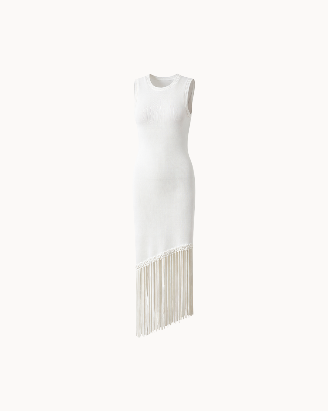 The detail is everything. The Paloma is a ribbed knit midi with a clean round neckline and a body-skimming silhouette that gives way to a dramatic asymmetric fringe hem, finished with delicate pearl embellishments. Simple on top, unforgettable at the hem.