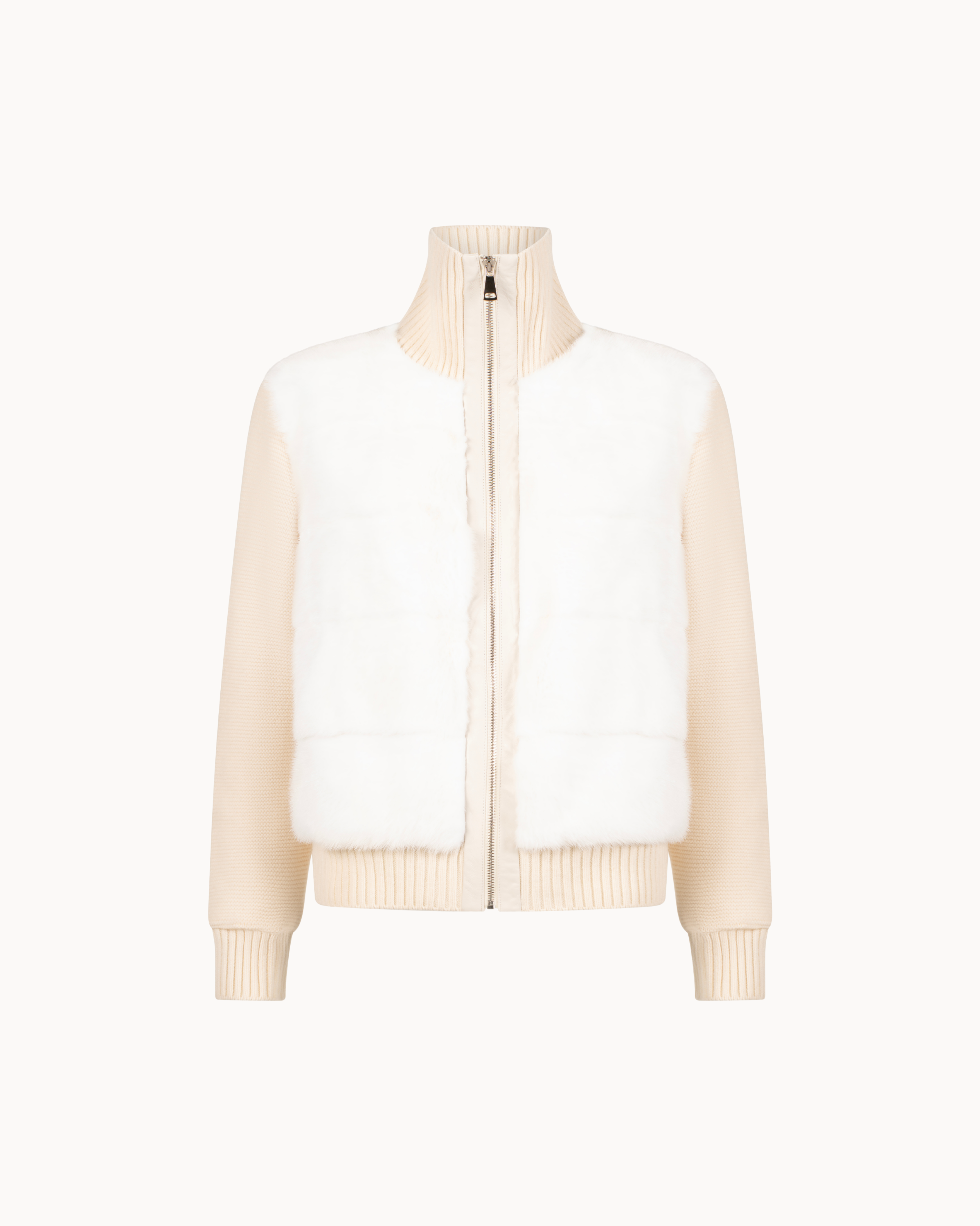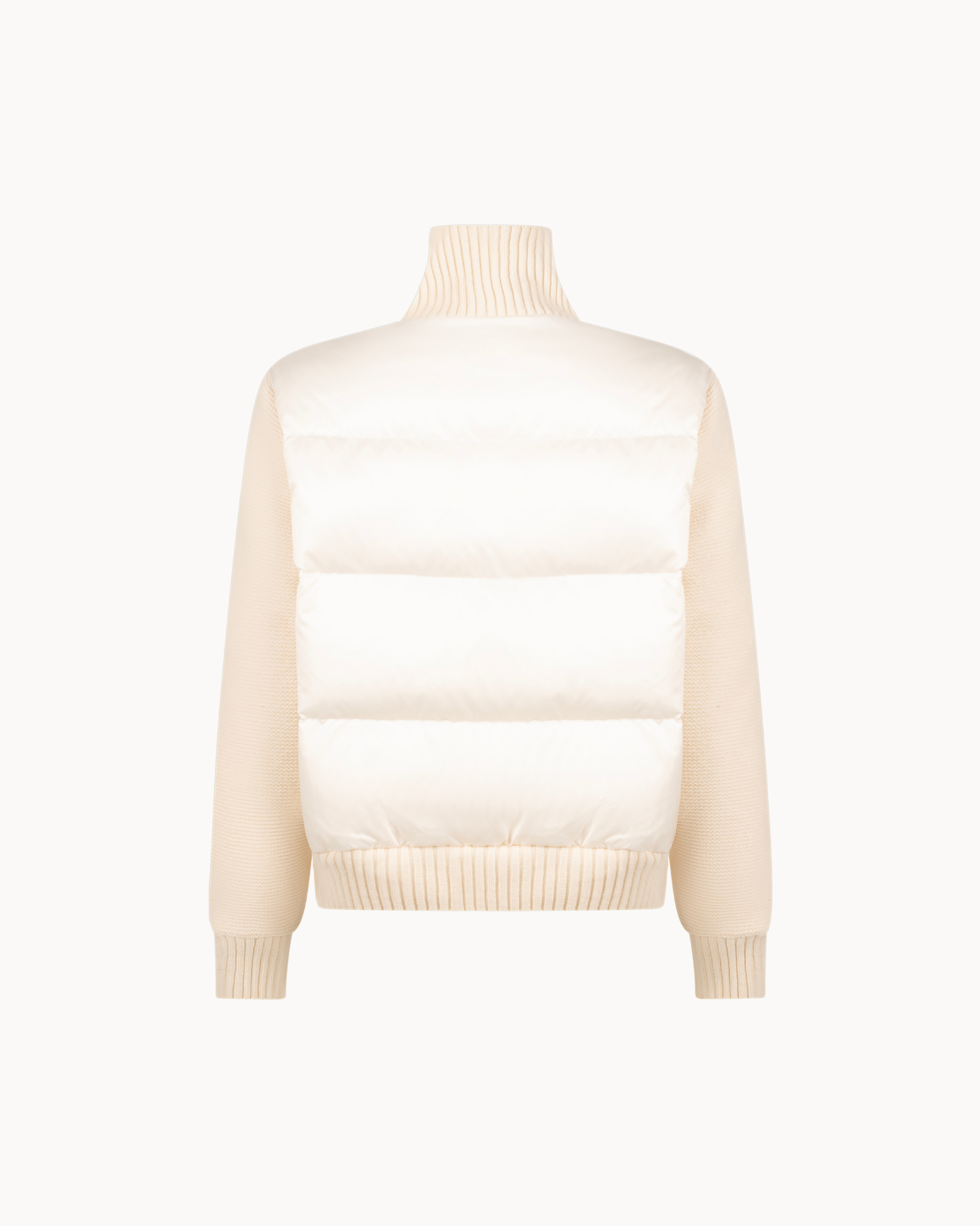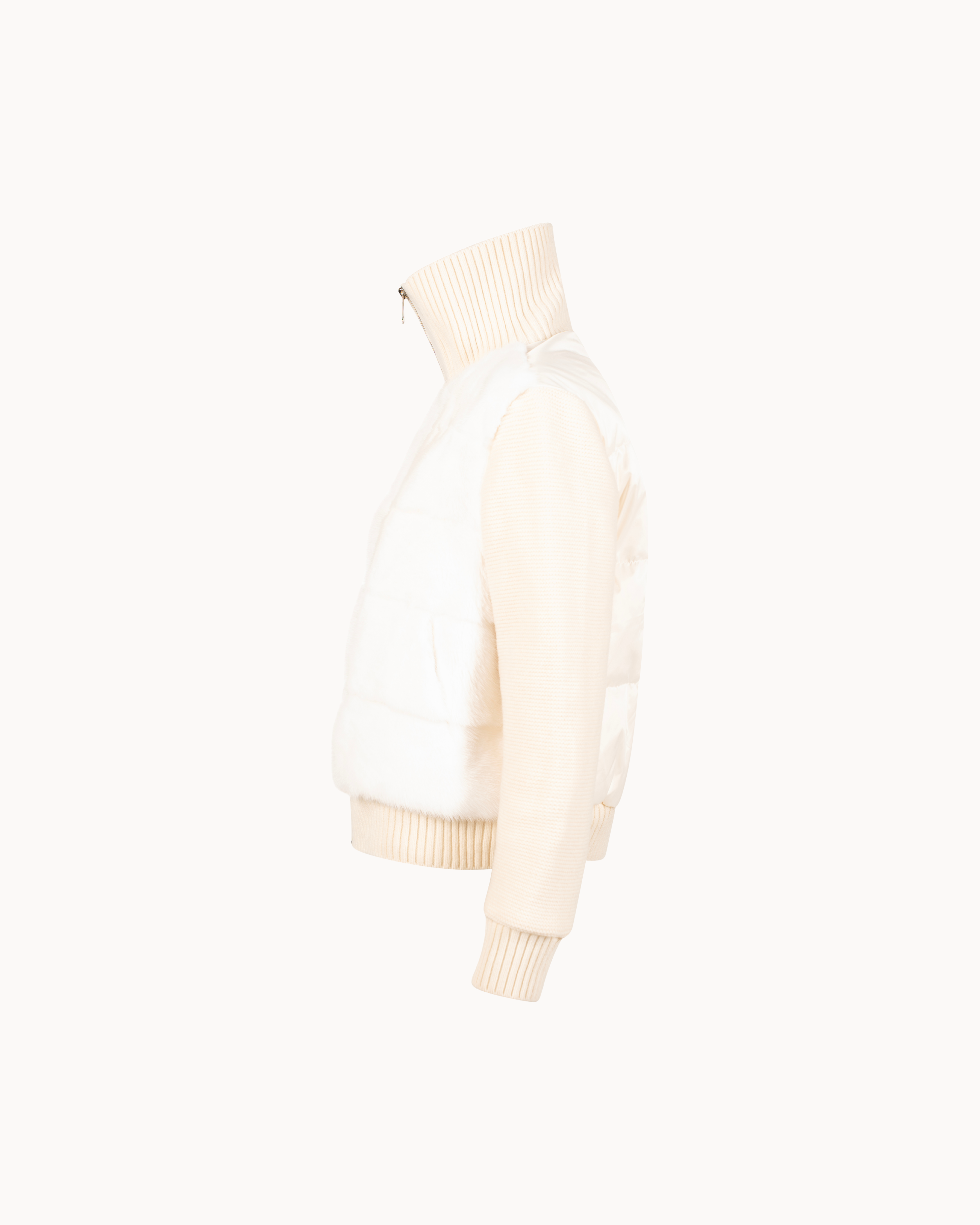 The front and back are quilted and filled with goose padding for lightweight insulation, while the cashmere-blend knit sleeves introduce softness and a tailored contrast. A high ribbed collar frames the neckline, adding both warmth and architectural presence, while the mink fur detailing lends subtle depth and quiet luxury. Finished with a full zip closure, this jacket is designed for modern winter dressing and it's functional, polished, and unmistakably refined.