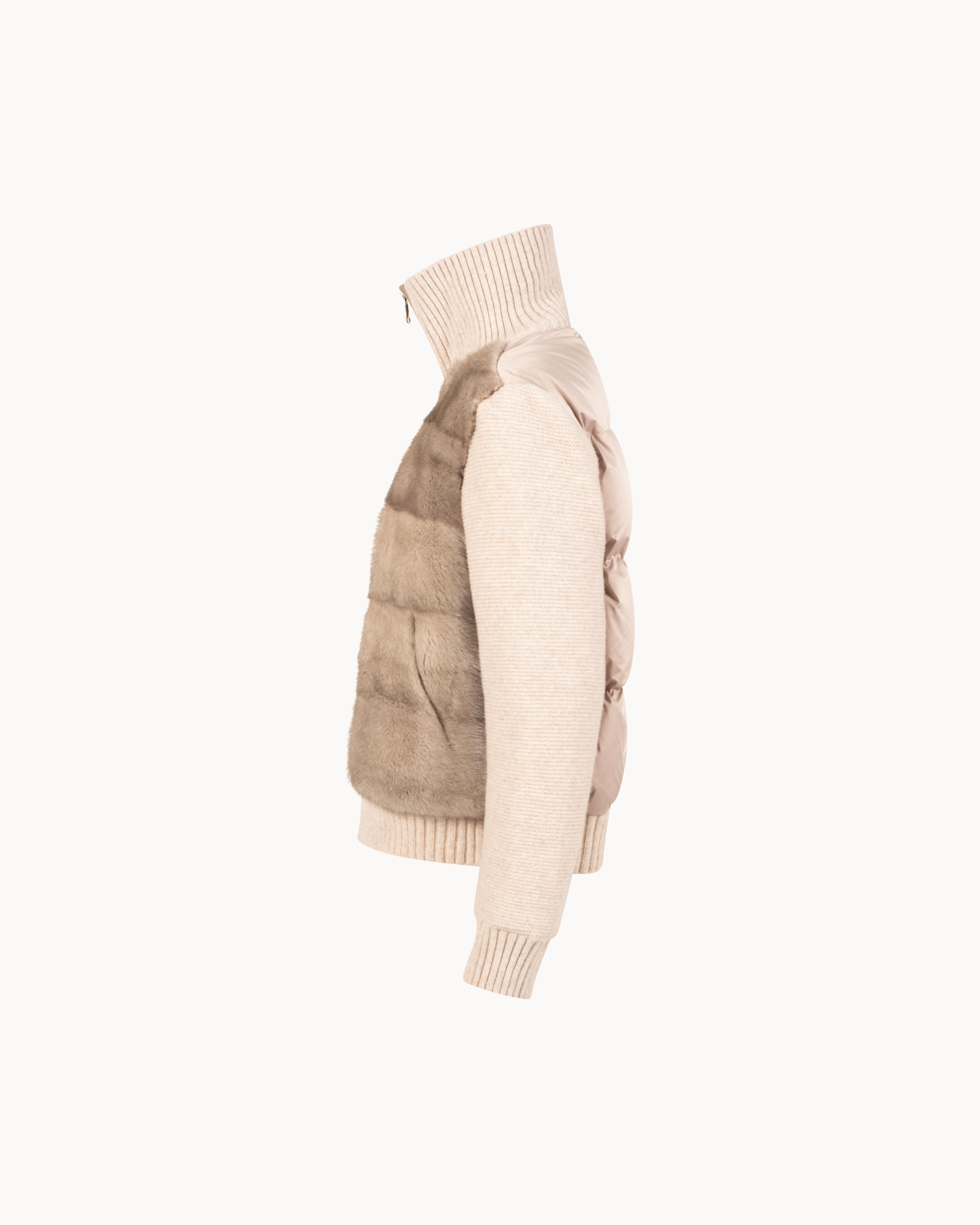 The front and back are quilted and filled with goose padding for lightweight insulation, while the cashmere-blend knit sleeves introduce softness and a tailored contrast. A high ribbed collar frames the neckline, adding both warmth and architectural presence, while the mink fur detailing lends subtle depth and quiet luxury. Finished with a full zip closure, this jacket is designed for modern winter dressing and it's functional, polished, and unmistakably refined.