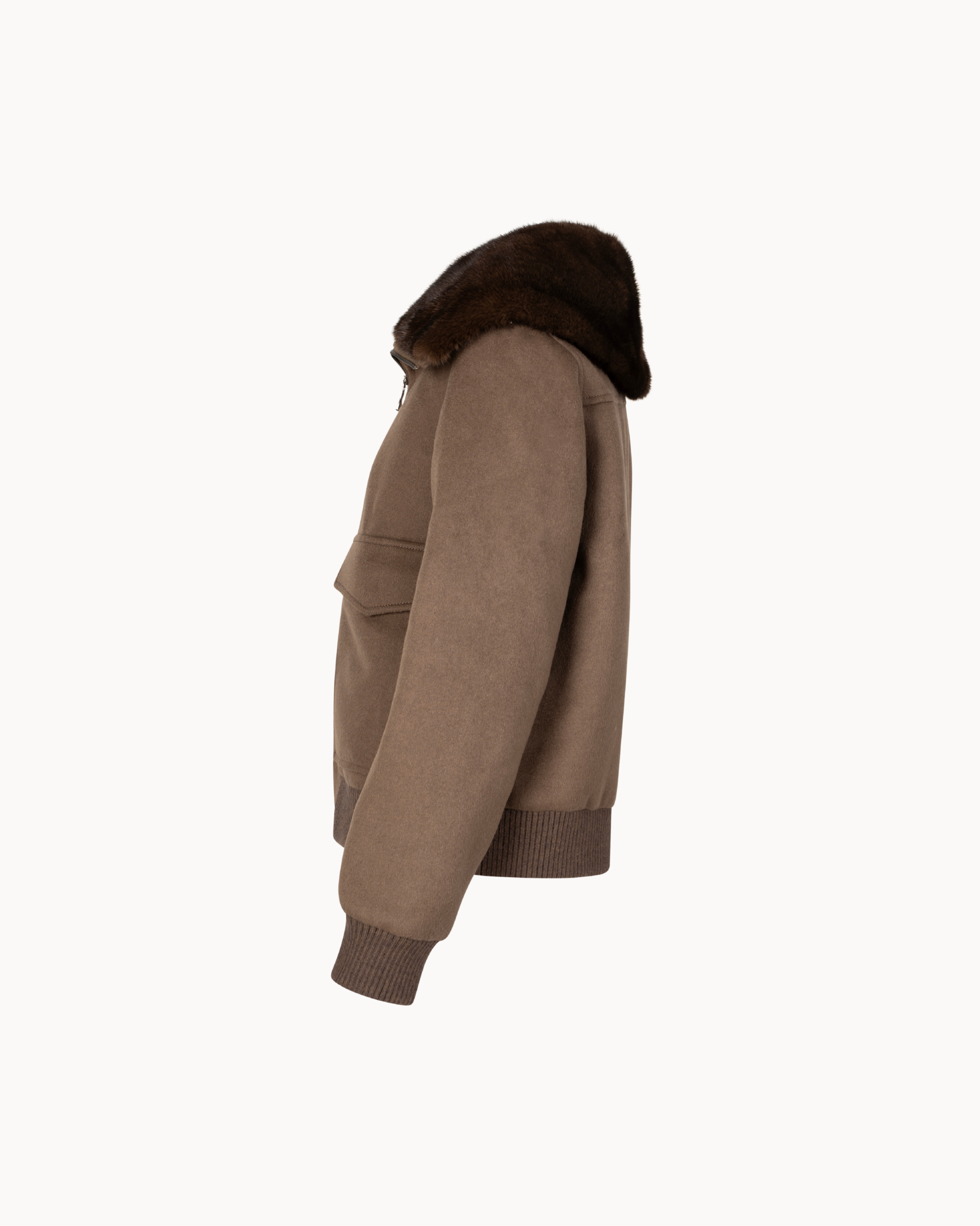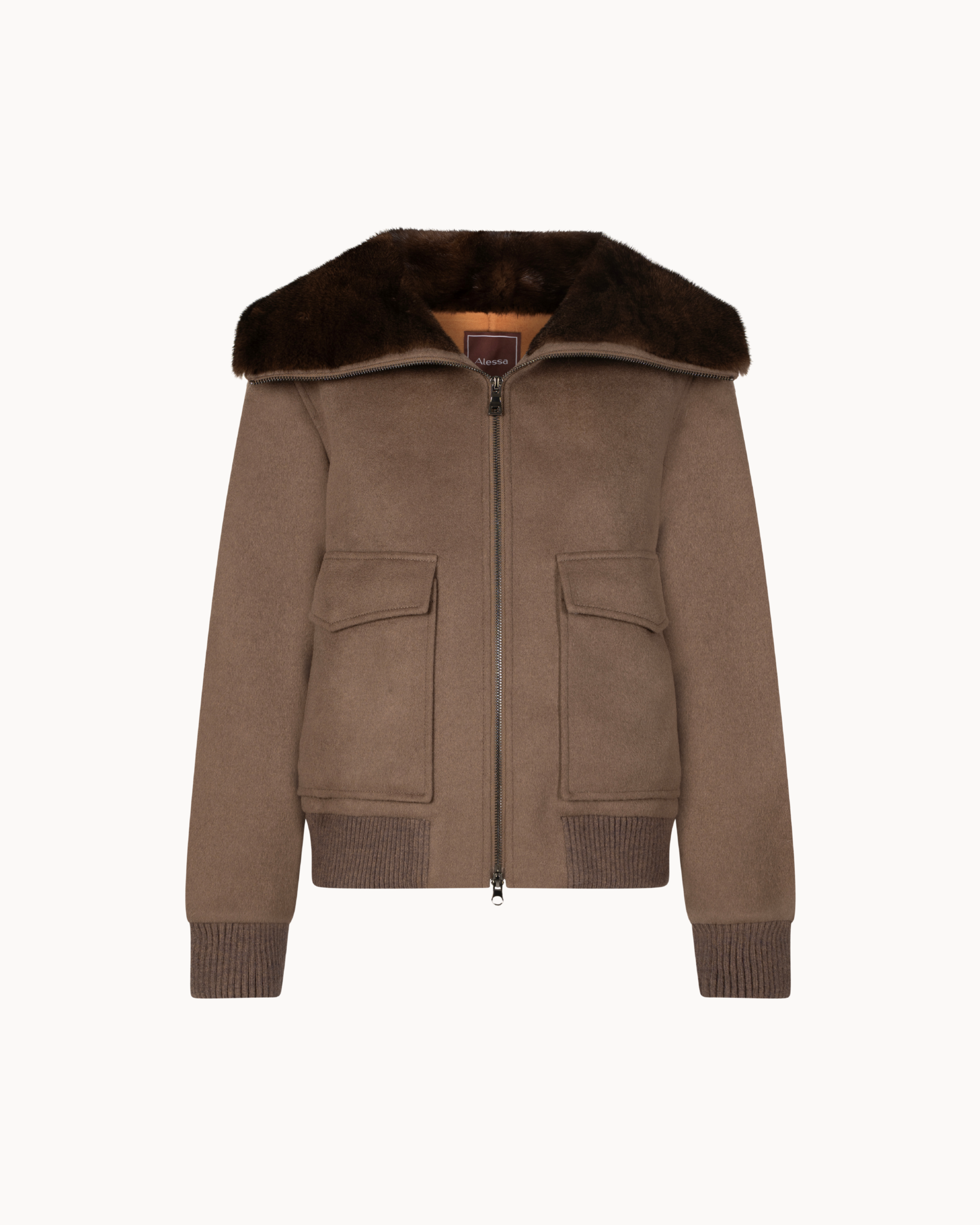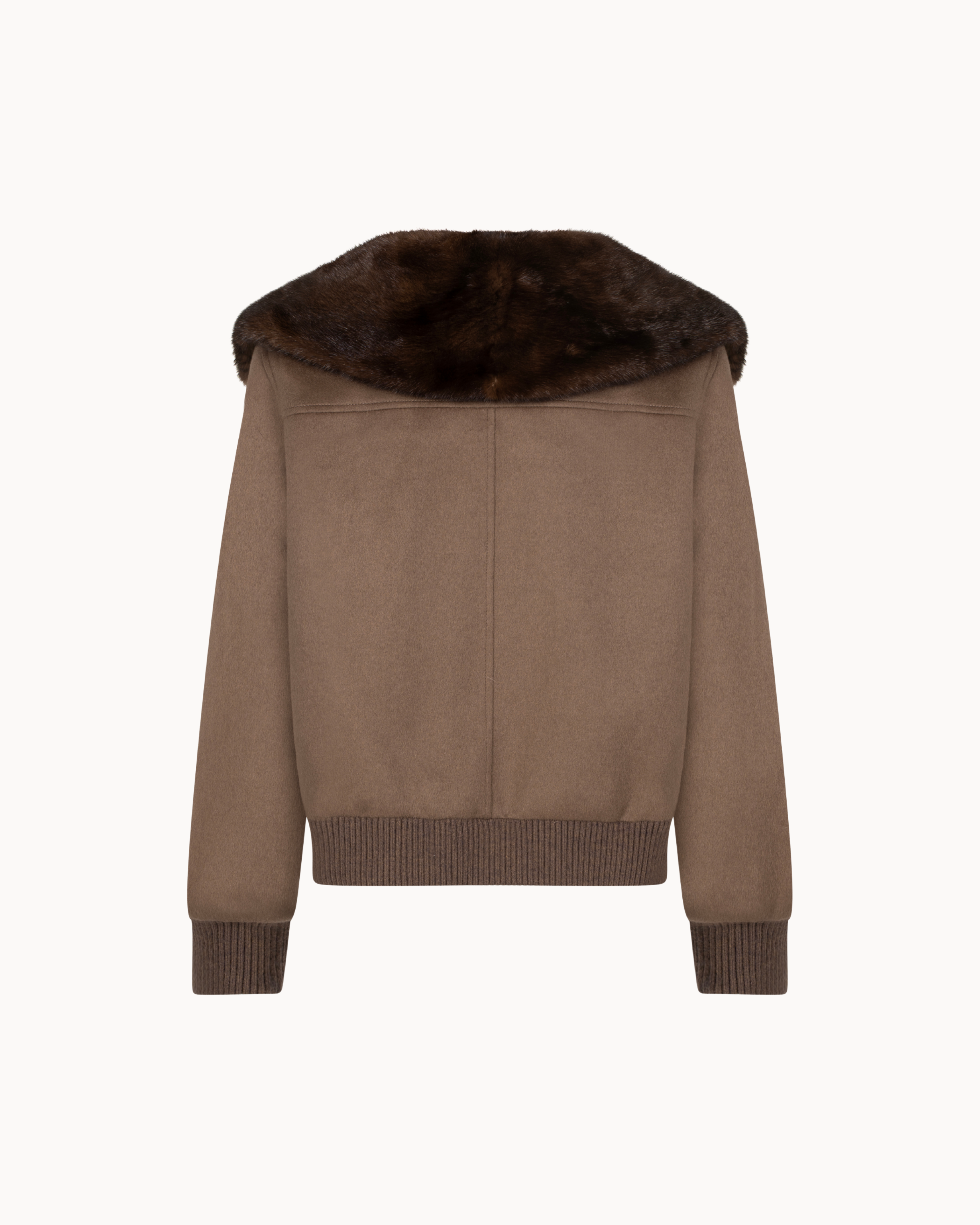 The cropped, bomber-inspired shape is balanced by ribbed finishes at the cuffs and hem, lending a relaxed yet polished feel to the design. Two patch pockets with flap detailing introduce a subtle utilitarian element, while the zip fastening adds a modern, streamlined edge. An oversized real mink fur collar defines the silhouette, framing the neckline with depth, richness, and understated luxury, completing this elevated cold-weather essential.