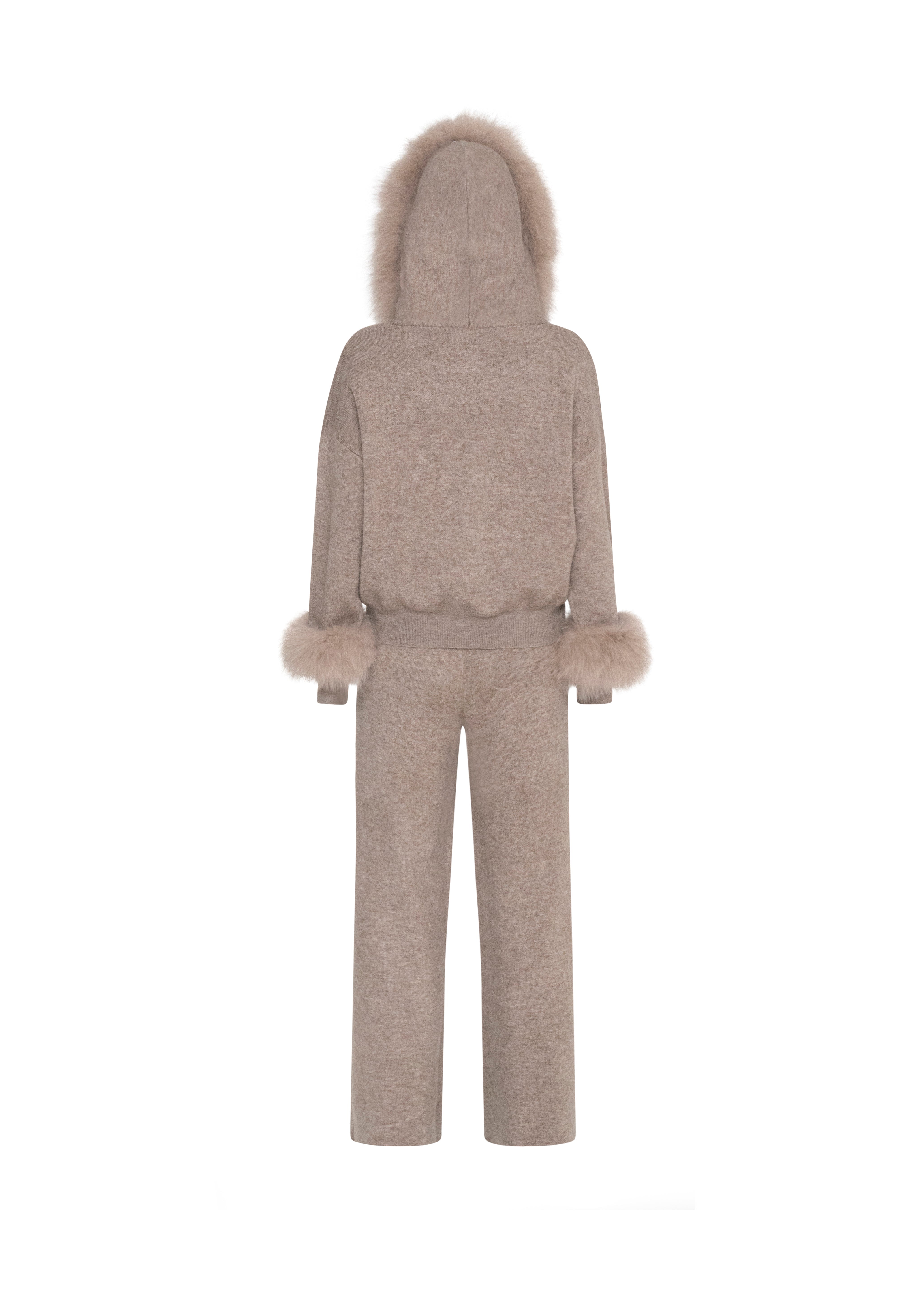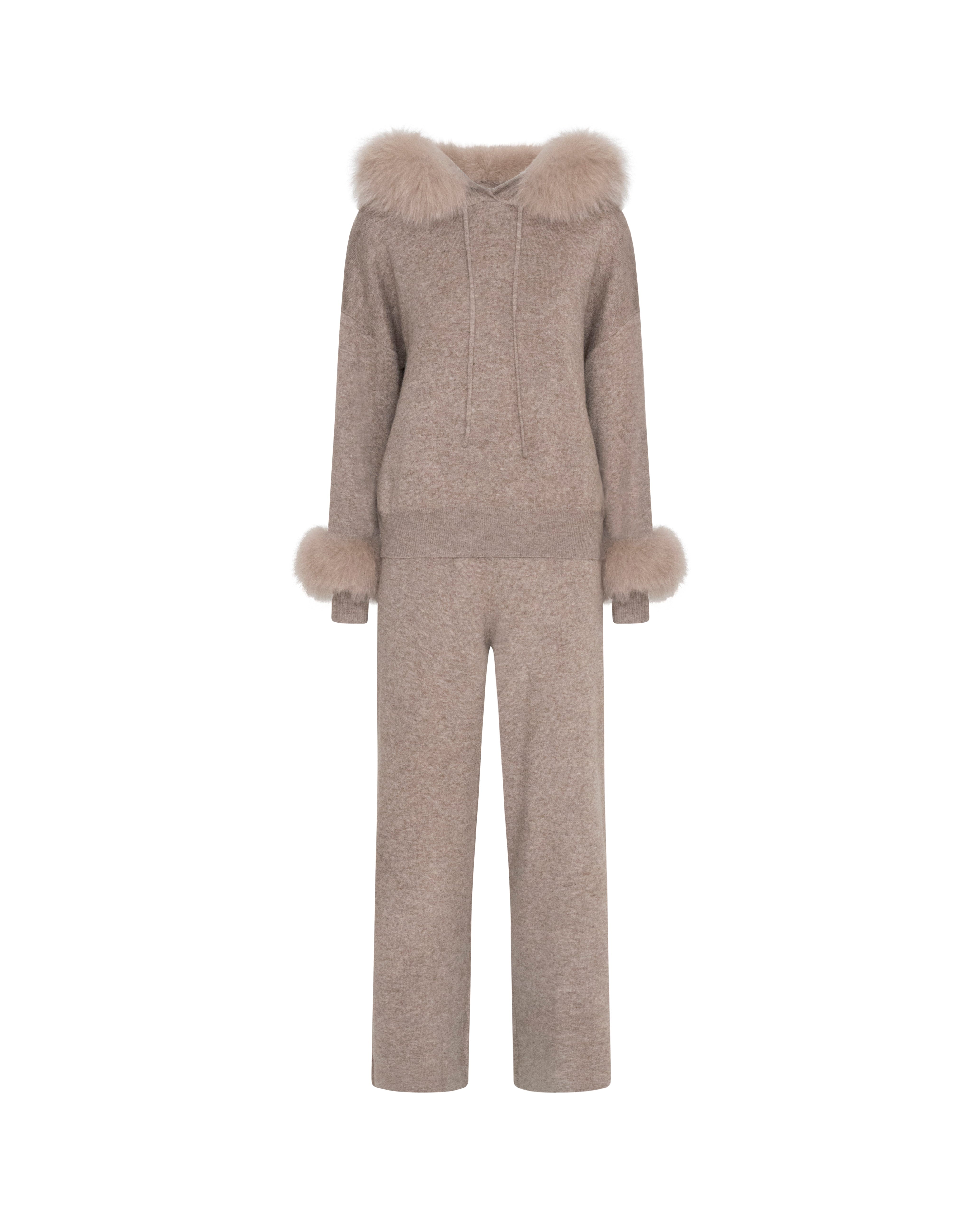 Elevate your comfort with the Two-Piece Lounge Set in a timeless taupe hue. Expertly crafted from an ultra-soft knit, this set blends effortless elegance with everyday luxury. The hoodie features sumptuous real fur trims along the hood and cuffs, creating a beautifully refined contrast against the warm taupe tone.