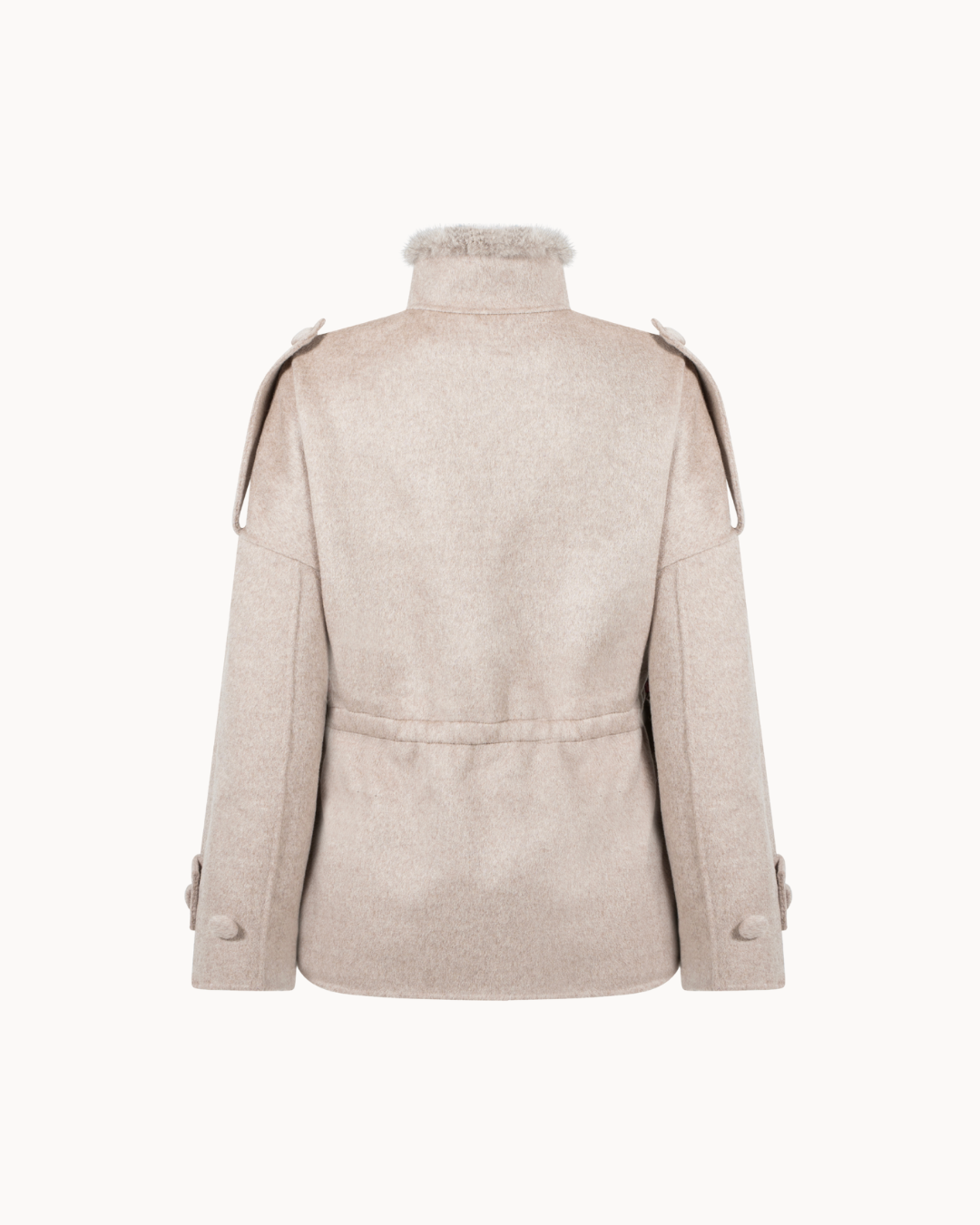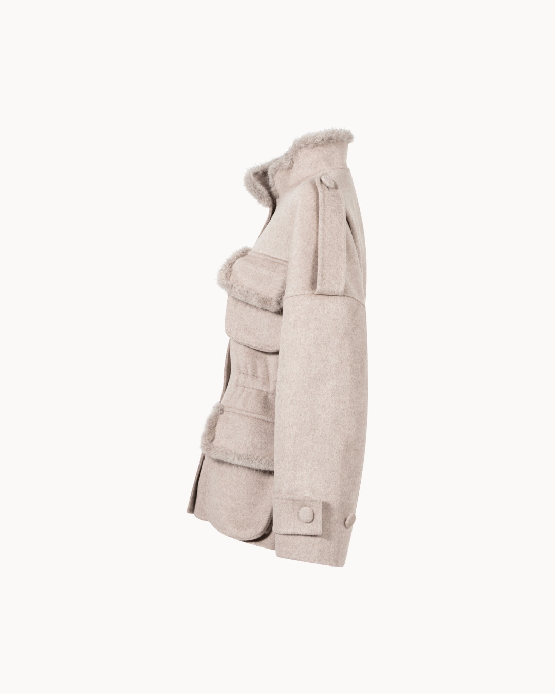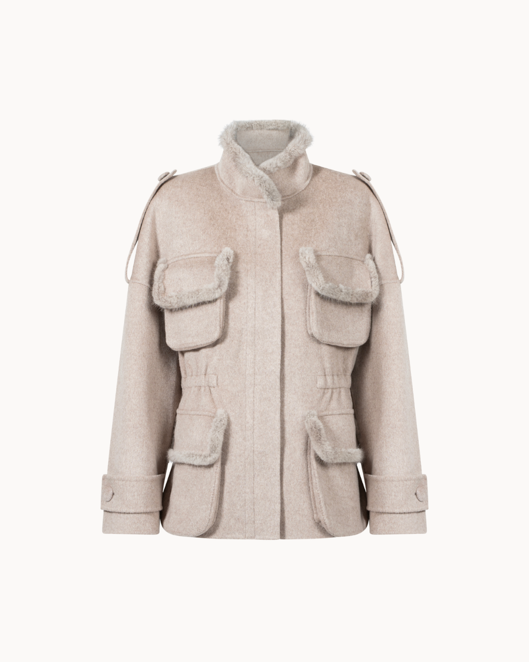 The Valeria Fur-Trim Jacket blends structured wool tailoring with soft fur-trimmed pockets and collar, creating a luxurious take on a classic utility silhouette. Warm, refined, and effortlessly stylish.