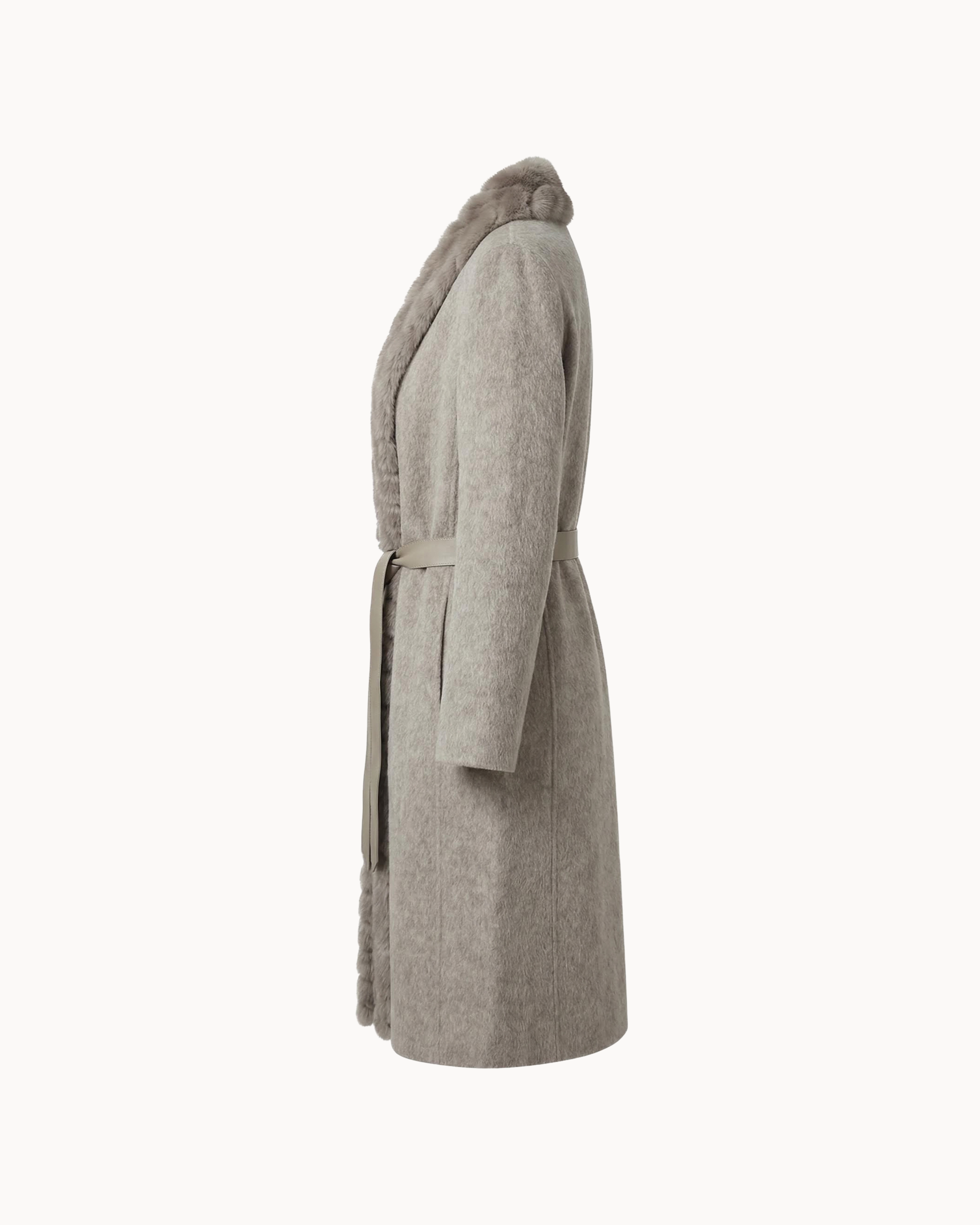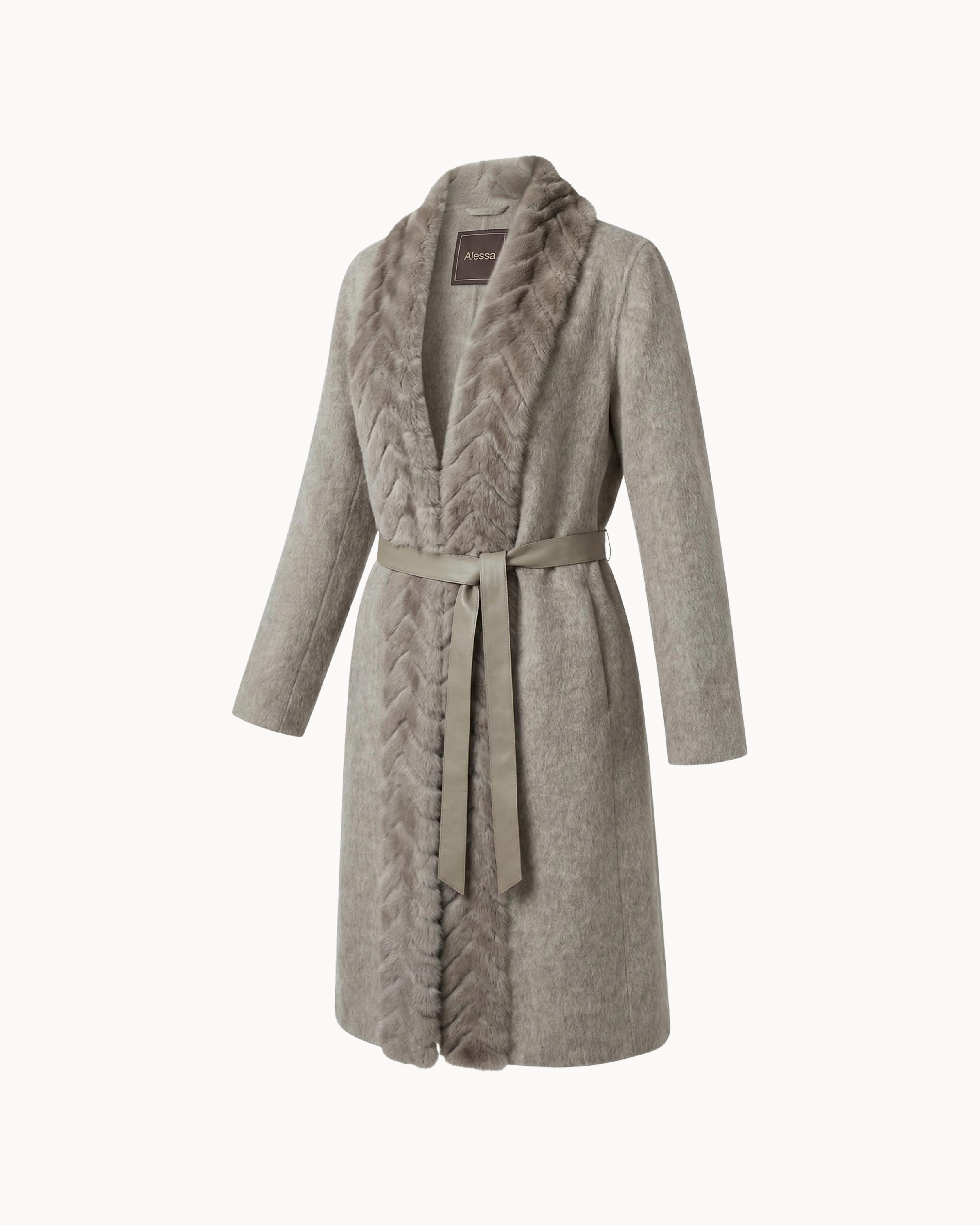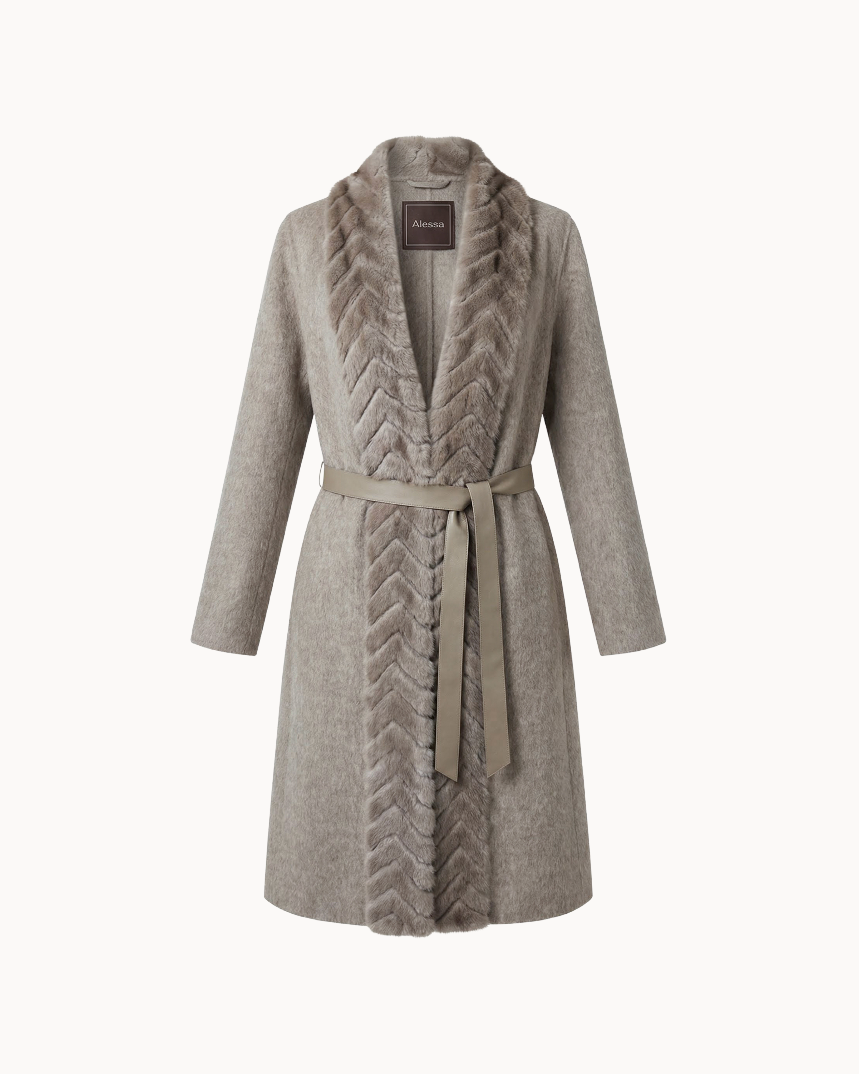 The Virela Coat is crafted from structured wool and elevated with sculpted mink fur detailing, creating a refined interplay between clean tailoring and rich texture. The chevron-patterned fur panels draw the eye vertically, enhancing the silhouette while maintaining understated elegance.